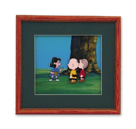 Graphically wonderful cel groups Lucy, Charley Brown and Linus by a big old tree. Lucy lectures them heatedly. And they listen meekly. A great Charles Schulz moment to cherish. NRMT. 14x13” framed. Background may be original, maybe not.