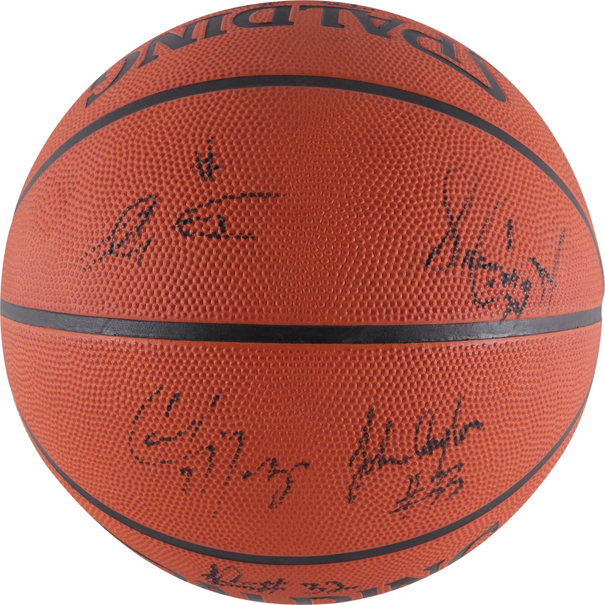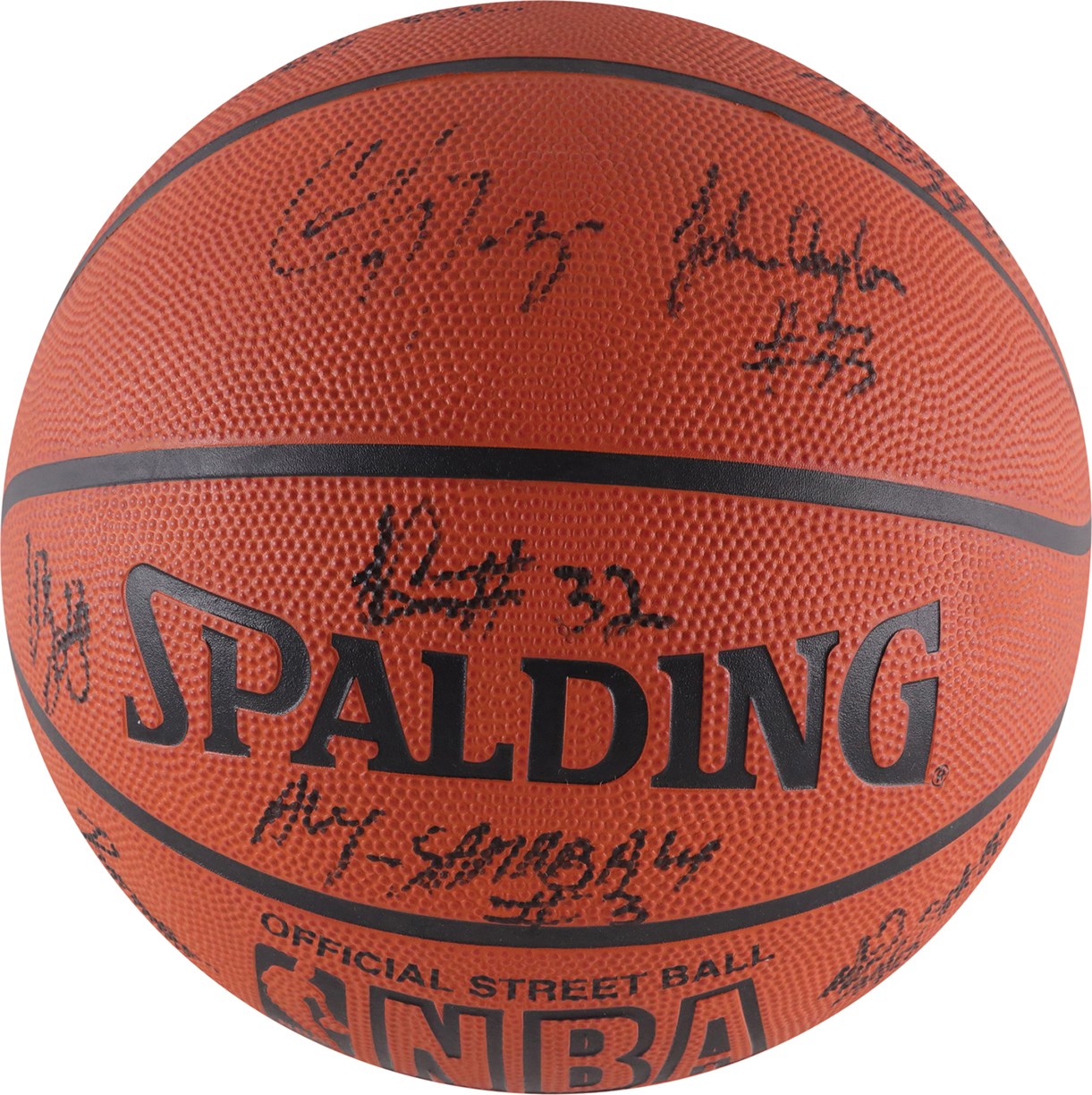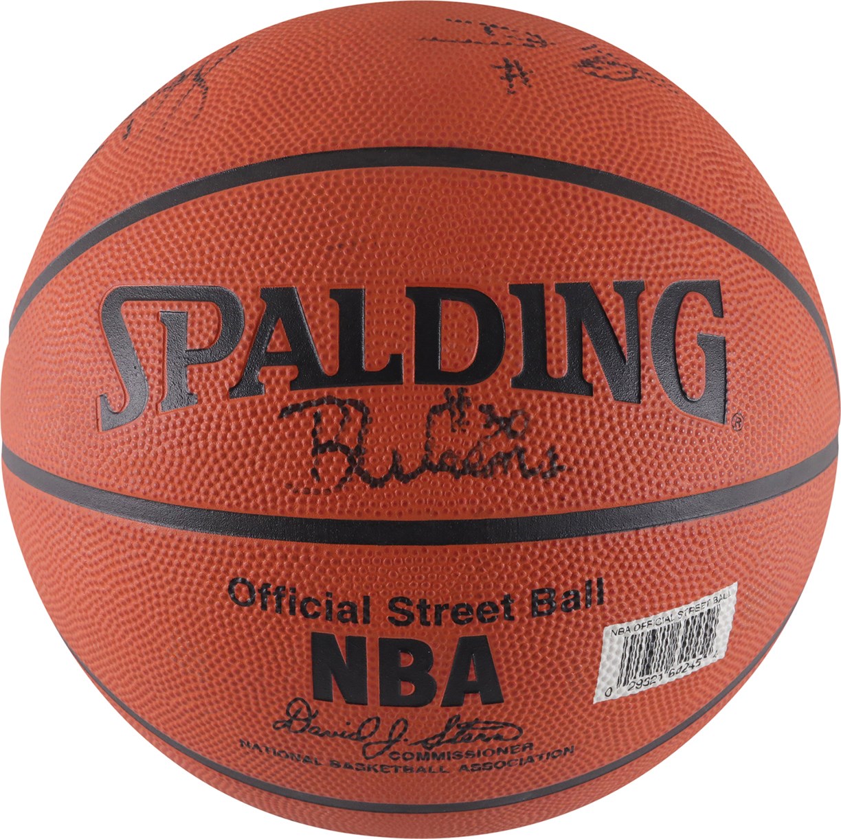 Presented is an NBA Official Street Ball signed by LeBron James and his teammates on the St. Vincent's-St. Mary's Ohio State Championship Division II High School Team. The ball was signed in 2001. LeBron played four seasons of basketball at Akron's St. Vincent's-St. Mary's, averaging a career 29 PPG, with 8.3 RPG and 5.7 APG. In LeBron's four seasons of play at St. Vincent's-St. Mary's, his team won three State Championships - in 2000, 2001, and 2003. The team was the State Runner-up in 2002. LeBron James signed his name in black marker, as did his teammates. LeBron's high school era signature, very different from his signature that developed over his professional career, is located just to the left of the "SPALDING" imprint on the ball. Those signing the basketball include: Sian Cotton, Willie McGee, Dru Joyce III and Romeo Travis, all long-time friends of LeBron. "King James" was the first pick of the 2003 NBA Draft by the Cleveland Cavaliers. He is a 4-time NBA Champion, accomplished with three different teams: Miami Heat (2), Cleveland Cavaliers (1), and Los Angeles Lakers (1). LeBron holds the record for the most career points in the NBA, and he is fourth in career assists. James is also a 4-time NBA MVP and a 4-time NBA Finals MVP. As the playing career of LeBron James nears its end, a LeBron signed basketball from his high school team takes on added significance. Blessed with great talent, James combined his natural skills with a sustained work ethic in practice and hard effort in games to reach his pinnacle. As King James himself said, "I treat it like every day was my last day with a basketball." Relatively soon, James will most likely retire, and this signed basketball makes an unusual remembrance of his playing career as he soared straight from high school to the NBA. LeBron and his his school teammates signed the ball with a black marker. The signed basketball is in excellent condition, and it comes with a PSA LOA.
