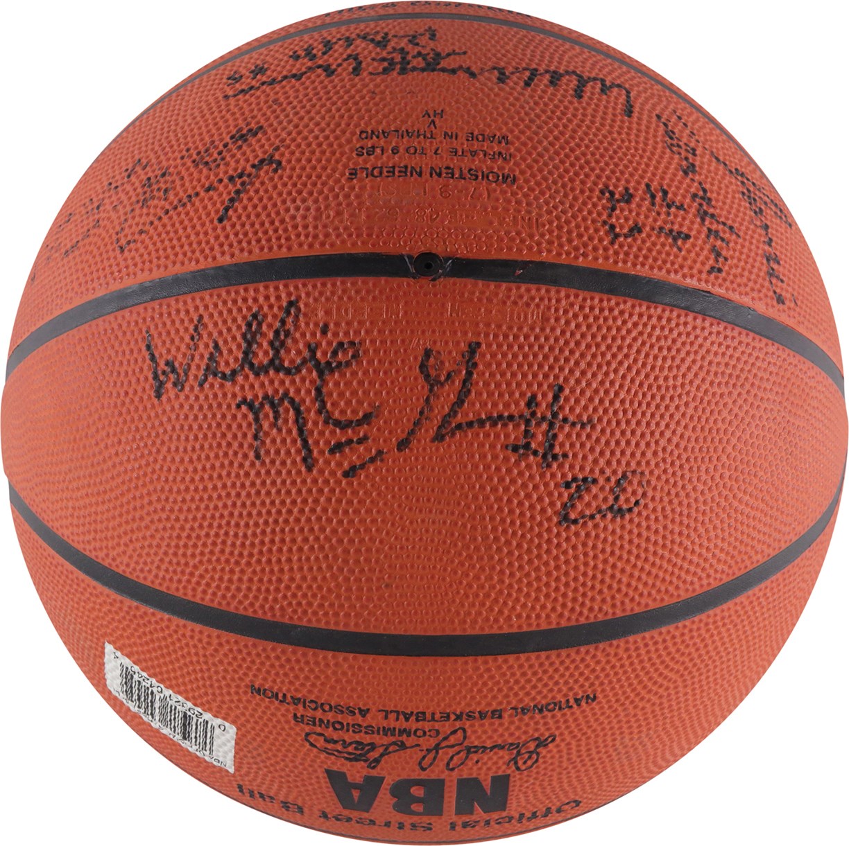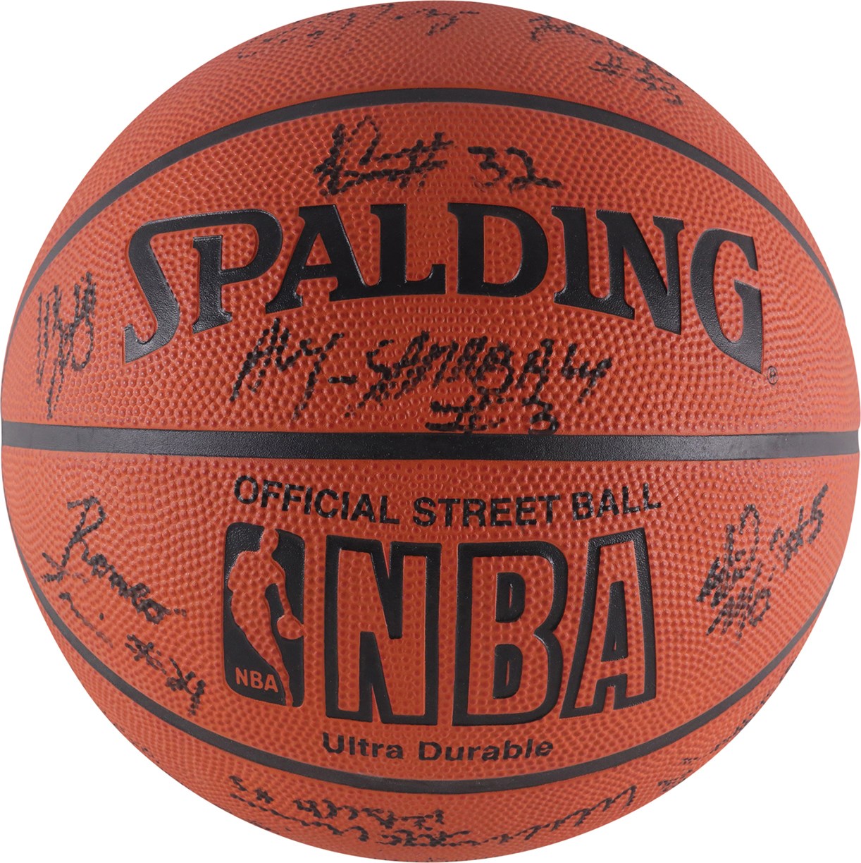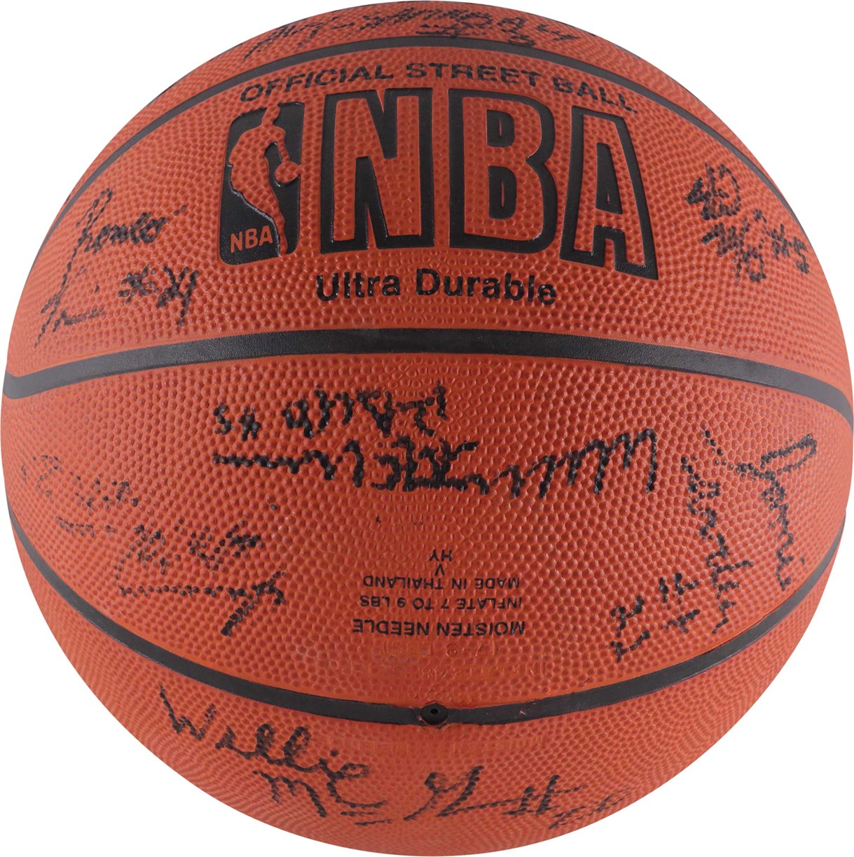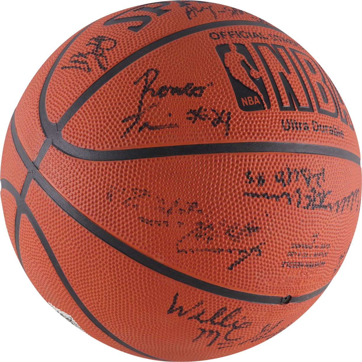 Presented is an NBA Official Street Ball signed by LeBron James and his teammates on the St. Vincent's-St. Mary's Ohio State Championship Division II High School Team. The ball was signed in 2001. LeBron played four seasons of basketball at Akron's St. Vincent's-St. Mary's, averaging a career 29 PPG, with 8.3 RPG and 5.7 APG. In LeBron's four seasons of play at St. Vincent's-St. Mary's, his team won three State Championships - in 2000, 2001, and 2003. The team was the State Runner-up in 2002. LeBron James signed his name in black marker, as did his teammates. LeBron's high school era signature, very different from his signature that developed over his professional career, is located just to the left of the "SPALDING" imprint on the ball. Those signing the basketball include: Sian Cotton, Willie McGee, Dru Joyce III and Romeo Travis, all long-time friends of LeBron. "King James" was the first pick of the 2003 NBA Draft by the Cleveland Cavaliers. He is a 4-time NBA Champion, accomplished with three different teams: Miami Heat (2), Cleveland Cavaliers (1), and Los Angeles Lakers (1). LeBron holds the record for the most career points in the NBA, and he is fourth in career assists. James is also a 4-time NBA MVP and a 4-time NBA Finals MVP. As the playing career of LeBron James nears its end, a LeBron signed basketball from his high school team takes on added significance. Blessed with great talent, James combined his natural skills with a sustained work ethic in practice and hard effort in games to reach his pinnacle. As King James himself said, "I treat it like every day was my last day with a basketball." Relatively soon, James will most likely retire, and this signed basketball makes an unusual remembrance of his playing career as he soared straight from high school to the NBA. LeBron and his his school teammates signed the ball with a black marker. The signed basketball is in excellent condition, and it comes with a PSA LOA.
