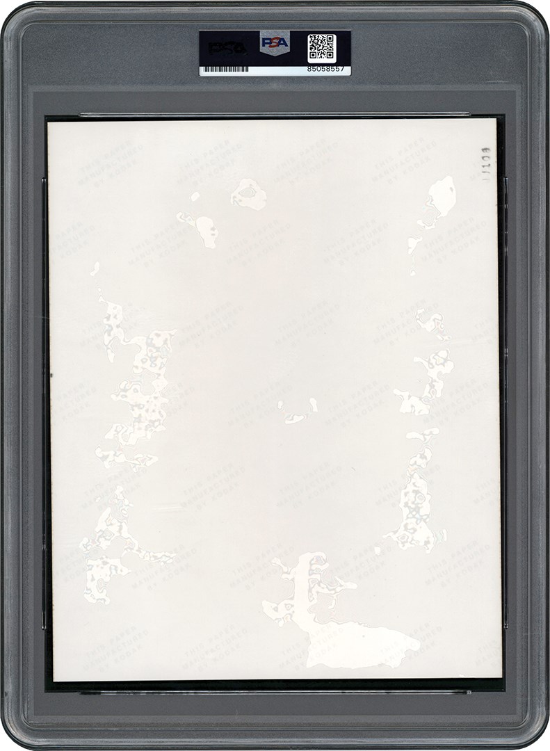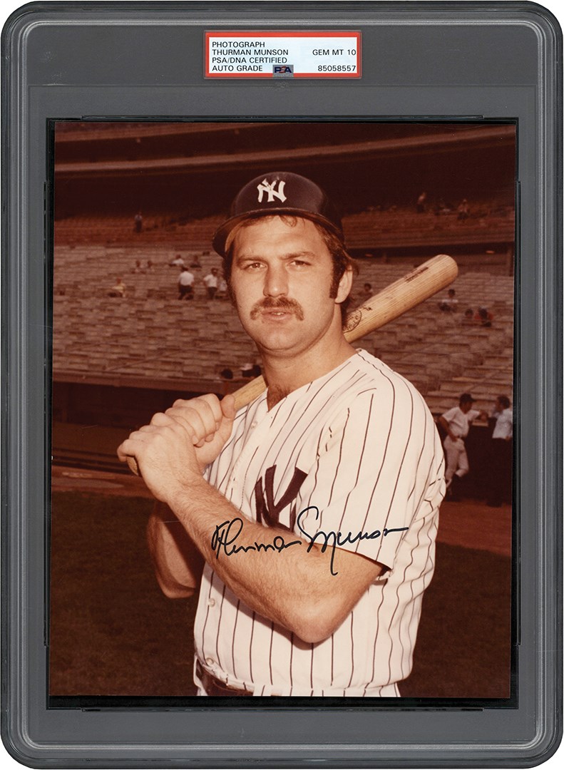 Original color photograph is perfectly signed by New York Yankees captain Thurman Munson. Some color fading from age is present on this 8x10" shot, but that does not at all affect the perfect 10/10 signature spread across Munson's chest. The photo has been encapsulated by PSA with an Auto grade of GEM MT 10. Exceptional provenance as this image was taken by our consignor, who had access to Yankee Stadium. Apparently, that wasn't the only New York ballpark he had access to, as this background is actually that of Shea Stadium, dating this to the 1974-75 seasons, during which the Bronx Bombers took their act to Queens while Yankee Stadium was being renovated. Rare signature, in perfect form, in an unusual setting.