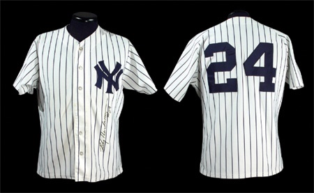 The stolen base king got off to a rocky start in Yankee pinstripes, but proved that he was worth the wait. Home pinstripe bears the Yankees “NY” emblem over the heart. Signed in black sharpie with his #24 on the left tail. Verso bears his # “24”. “Henderson 88 2” embroidered in blue stitch in the collar. Tail has been trimmed thus “Wilson” tagging no longer exists. Nice use throughout.