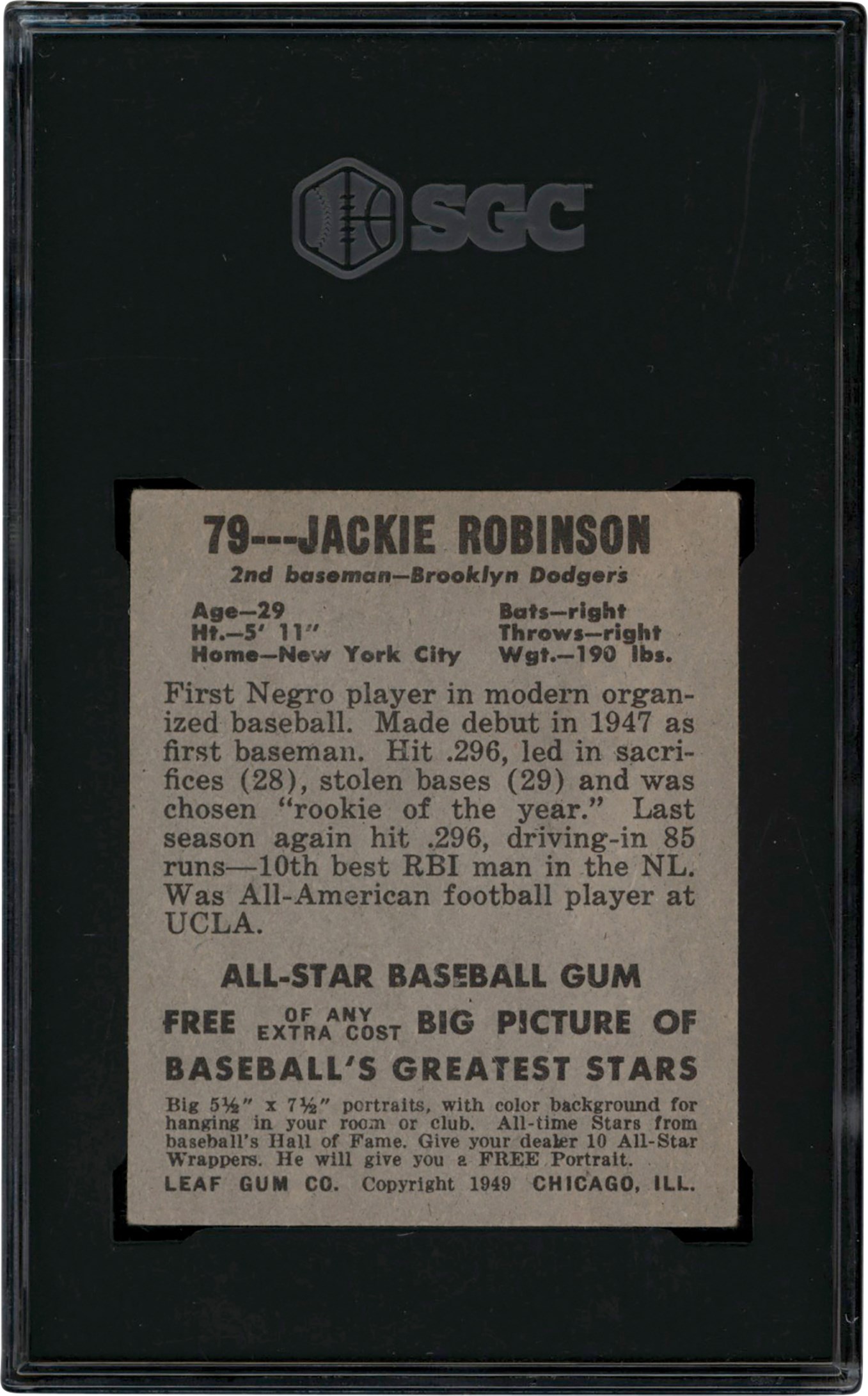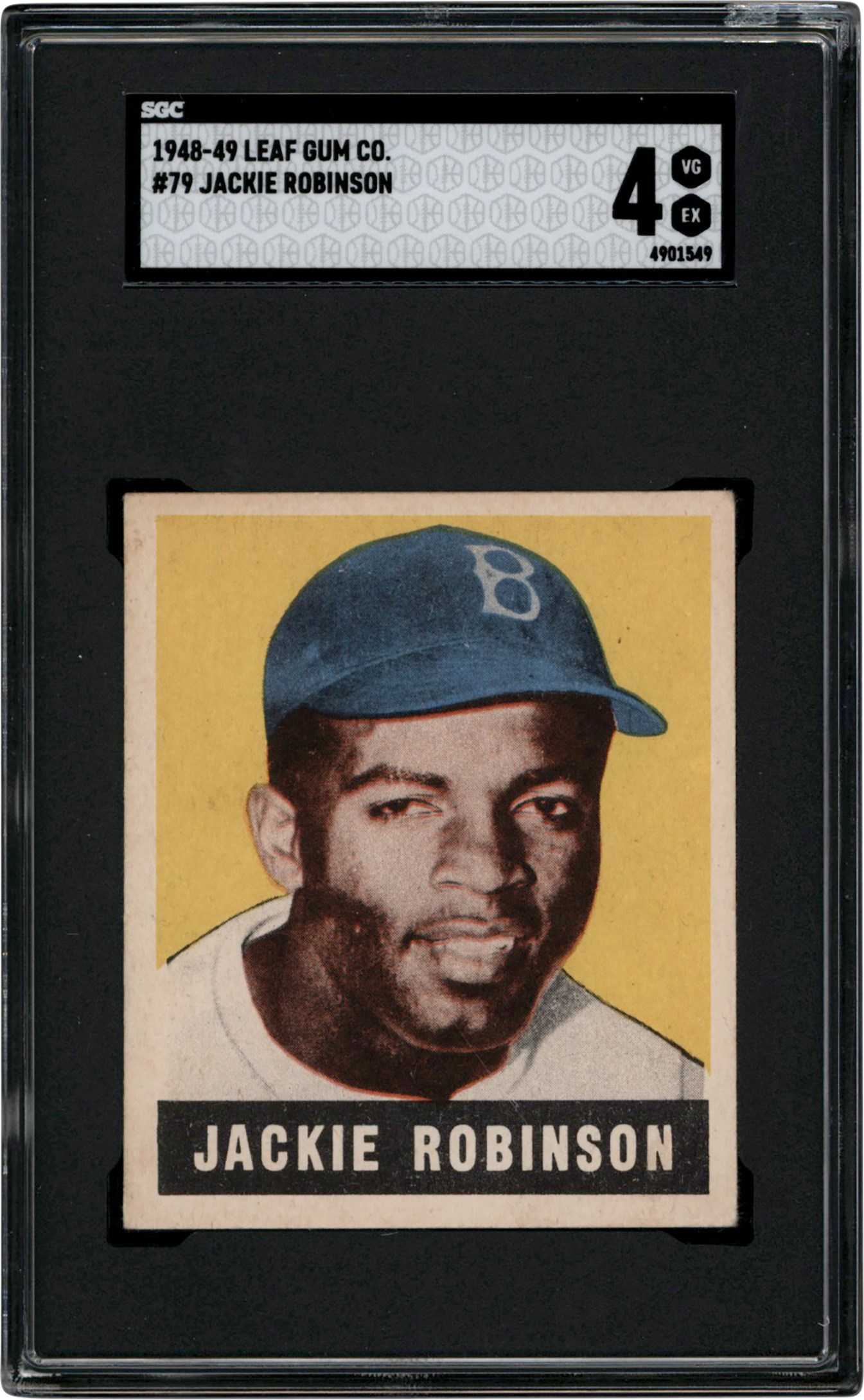 1948 Leaf Baseball #79 Jackie Robinson card. The card has been graded and encapsulated by SGC VG-EX 4. It has a colorful image of Robinson against a bright yellow background. The borders are white while the edges appear smooth. Centering is slightly off top to bottom. All four corners have slight rounding. The reverse is clean and bright.