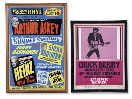 These vintage rock & roll posters decorated a nightclub. These classic titles include Freddie & The Dreamers “Seaside Swings” movie poster (VG- with folds /tear), for Heinz and The Wild Ones there are two; Ventor Winter Gardens at Isle of Wight and The Pavilion Theater. Two cut autographs with photos of Jerry Lee Lewis, James Brown NY Apollo (never believed to be an original poster). All items listed previously are framed. Unframed posters include The Who 1973 David Singer Cow Palace, two posters mounted on foamcore (both from the famed Fillmore East), Butterfield Blues band 1968-BG3 and Zappa-Mothers Of Invention #4. Finally, Them at the Fillmore 1966 Wilson artwork, Donovan Cow Palace BG 86, B.B.King/Santana BG 181, Commander Cody at Cricket Hill April 17 (Keen State College) with tiny tear at top, The Who/Vagrants (faded on left side) BG105 and lastly, The Who Silver Anniversary 1989 Artrock signed Gary Grimshaw printing (some creases and residue from gook). All EX, except where noted.The Chuck Berry poster is not included in this lot.