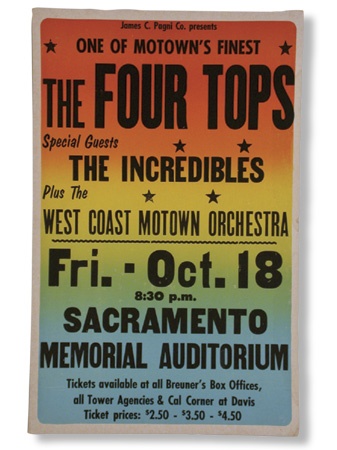 This was issued for an appearance with The Incredibles in 1974 at the Sacramento, California Memorial Auditorium. This plain multi-colored placard is made of heavy cardboard in NRMT condition.