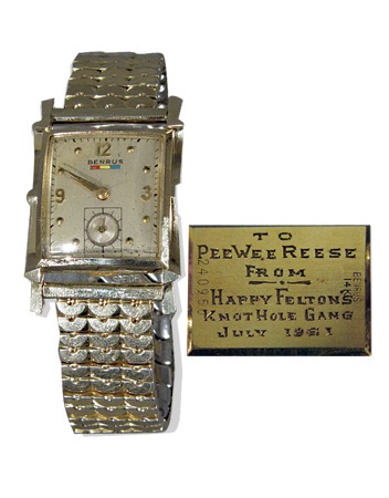 The first time we have seen one of these. Presented to Pee Wee for being the player selected, and appearing on this wax nostalgic Dodger post game television show. Verso of this 14k gold Benrus is engraved, “To Pee Wee Reese From Happy Felton’s Knot Hole Gang July 1951.” The former vaudevillian, Happy Felton & his Gang would be seen weekday afternoons and on Saturday afternoons on WOR Ch. 9 from Friday, April 21, 1950 until station execs finally closed up Happy Felton’s knothole in the ball parks for good on Saturday, August 24, 1957. EX+.