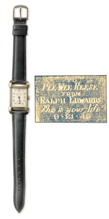 Art deco design on this lovely Bulova watch presented to Pee Wee for his appearance as the subject of this famed television program hoisted by Ralph Edwards. Verso of this Bulova Excellency is engraved, “To Pee Wee Reese from Ralph Edwards...This is your life...9-21-49.” Case is 10k Gold Filled, condition is EX-MT.