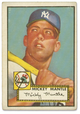 The Holy Grail of post war sports cards from the scarce hi number series of Topps’ premier 1952 issue. This first ever Topps card of Mickey Mantle, this is a classic example of the New York Yankees’ all time great. Card exhibits even corner wear, a strikingly vivid image, 65/35 left to right centering and 55/45 top to bottom centering, and has a clean back with zero paper loss on both the obverse and reverse. Conservatively graded VG+, only minimal surface wear in the upper corners of the sky blue background and minor surfaces creases to the left and right of the name box hold this card from an EX grade. A key card in any post war collection, and still one of the most desired cards in the hobby.