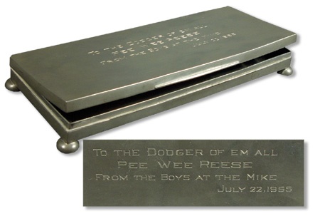 Sterling silver box is homage to his popularity as a player. From Pee Wee Reese Day at Ebbets Field. Picture the moment. 35,000 fans lit candles and sang “Happy Birthday” to him in the fifth inning as the lights were turned down. Presented by the radio team of Vin Scully, Connie Desmond and Andre Baruch, it is engraved, “To The Dodger of Em All PEE WEE REESE From The Boys At The Mike July 22, 1955.” The box is a sterling silver tabletop cigarette box in a supreme quality modernist style. Hammer stamped “Abercrombie & Fitch” and “Made In England” and with the appropriate hallmarks. 8x3.25x1”. EX+. LOA from Reese family.
