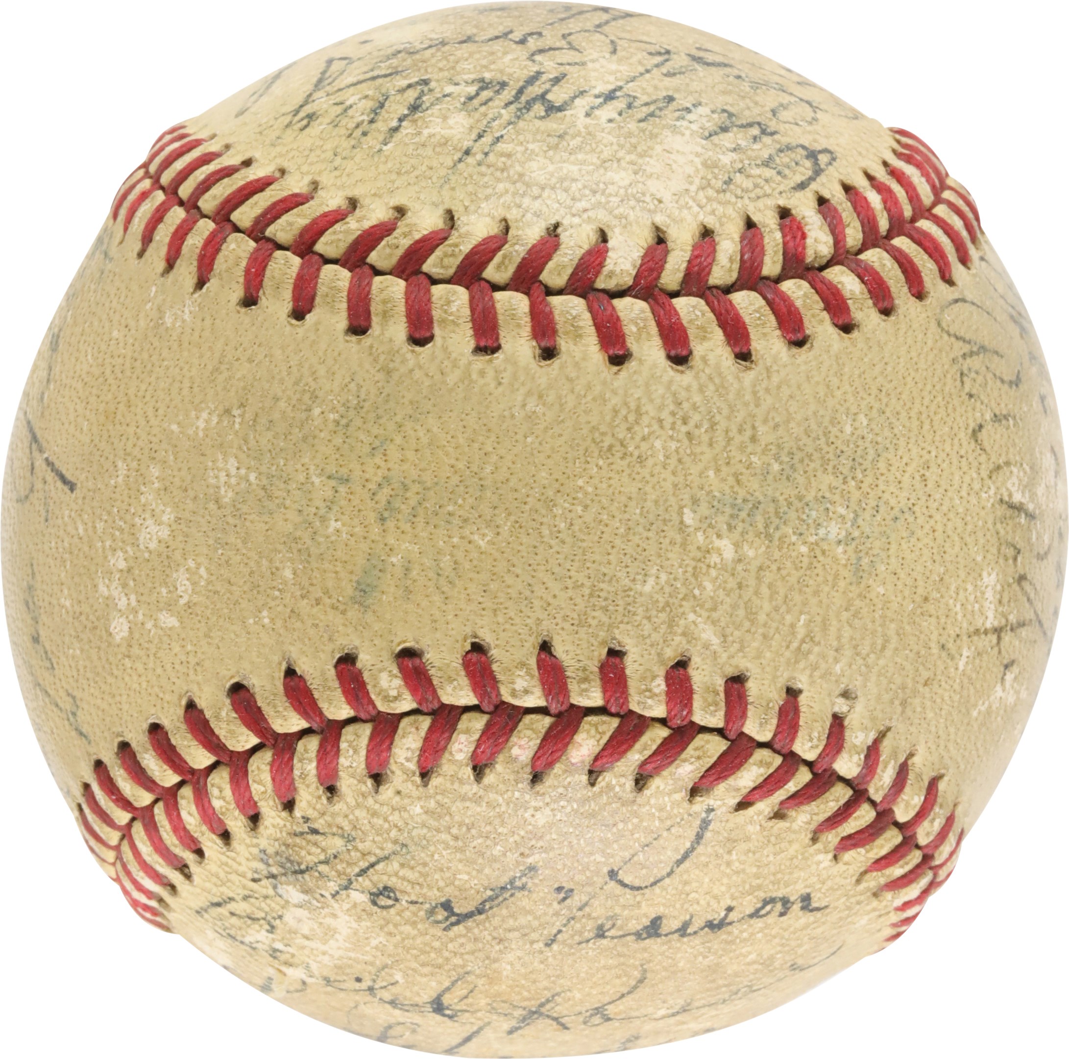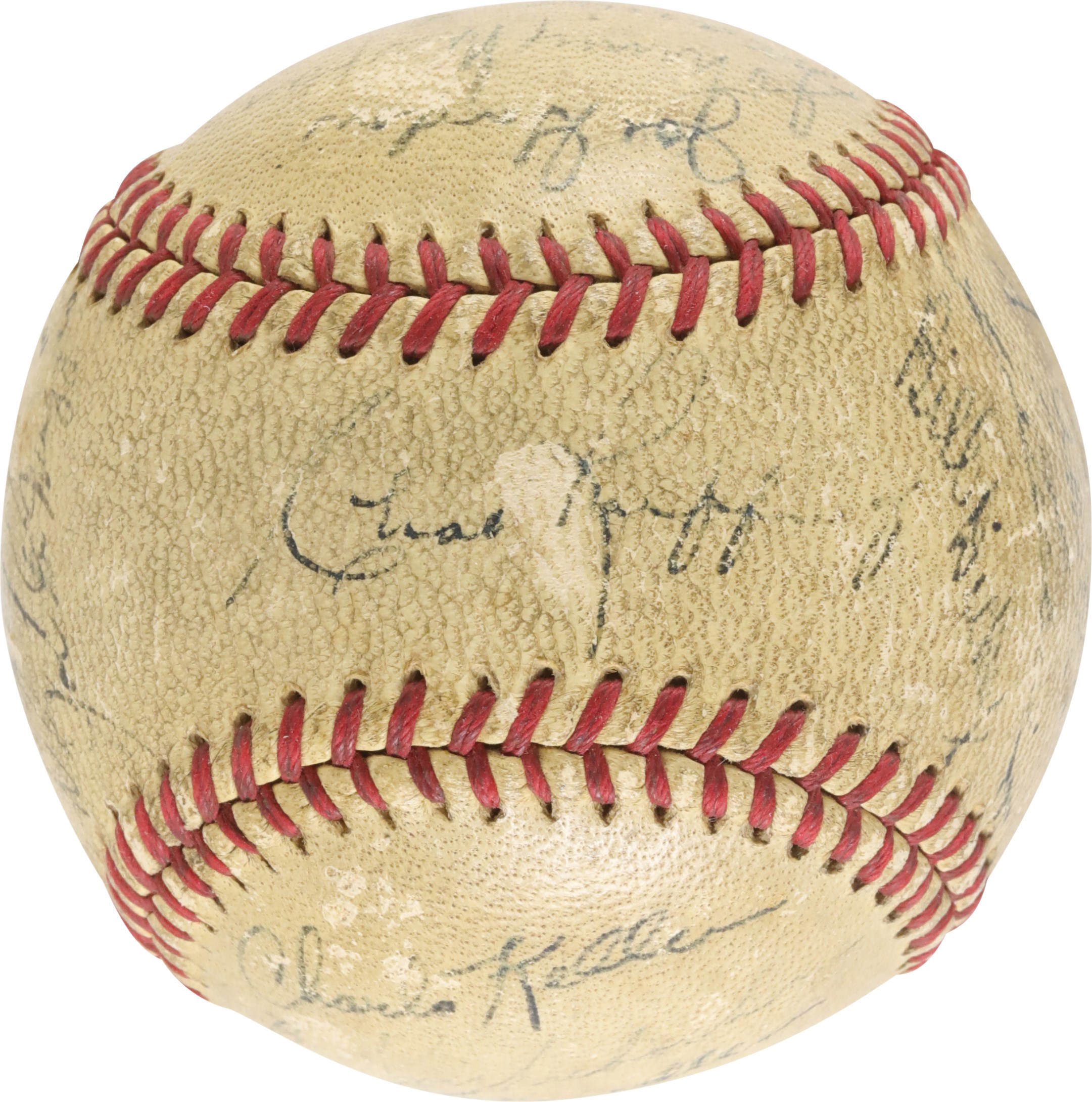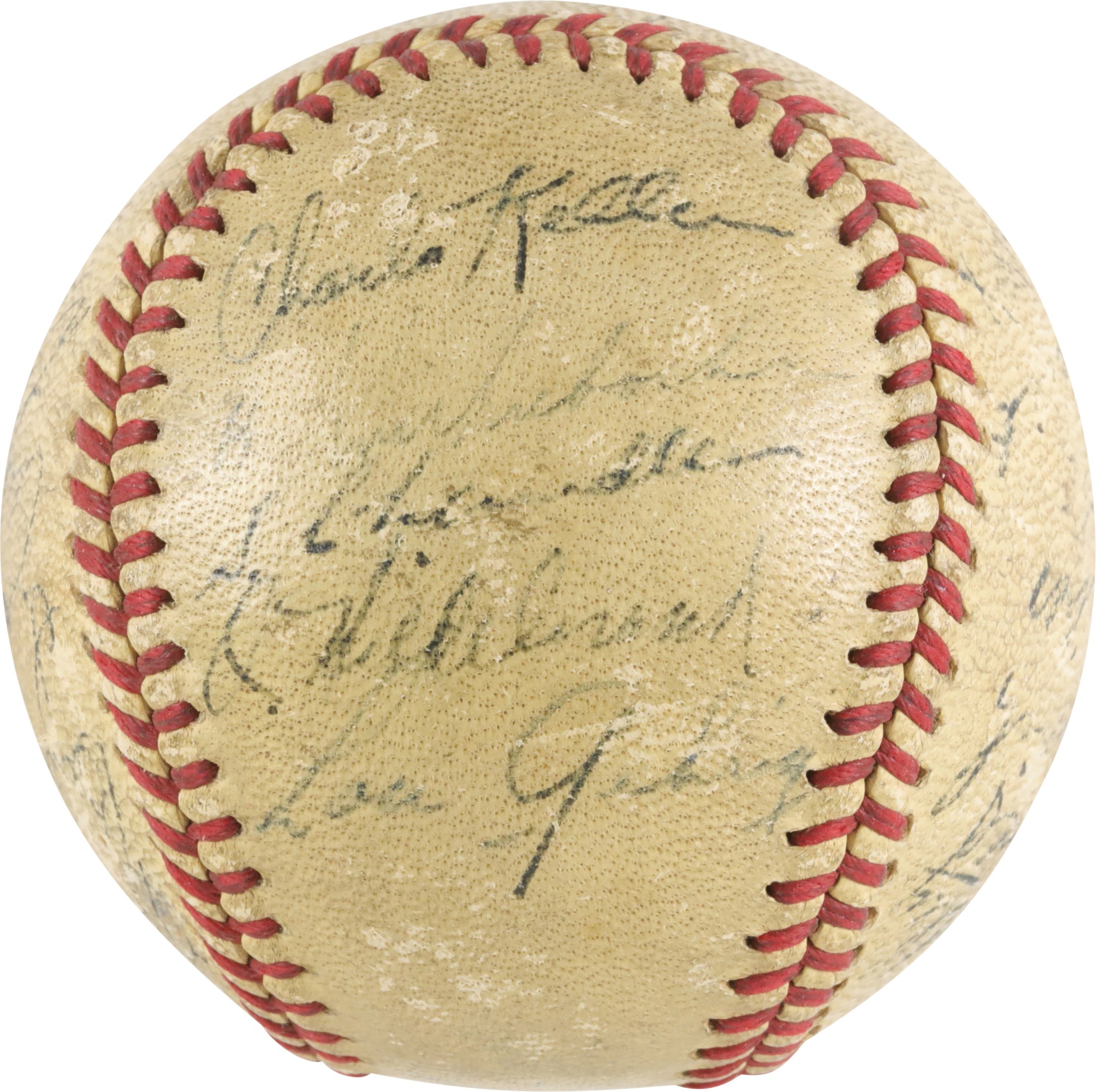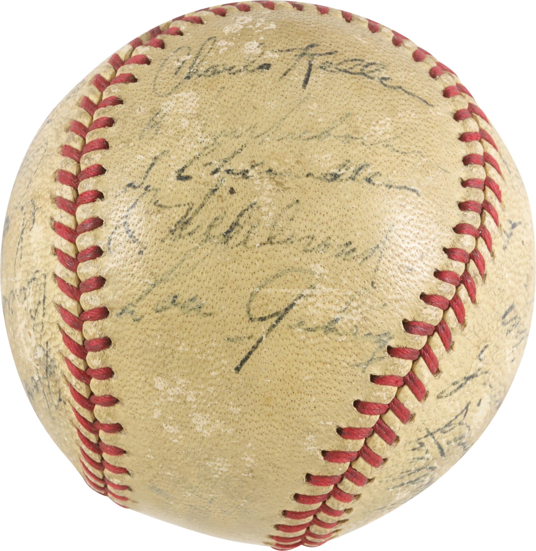 Baseball signed in black fountain pen by twenty-four members of the 1939 World Champion New York Yankees, including DiMaggio, Ruffing (sweet spot), Gomez, Dickey, Gordon, Keller, Knickerbocker, Chandler, Hildebrand, Rolfe, Dahlgren, Donald, Russo, Murphy, Hadley, Powell, Henrich, Schreiber (coach), Crosetti, Selkirk, Jorgens, Sundra, Rosar, and Pearson. (The additional signature of Lou Gehrig has been deemed a clubhouse example by PSA.) The signatures average 6/10. The manufacturer's stampings are no longer legible and the ball is moderately toned/soiled, with several small light-to-moderate abrasions. Good to Very Good condition overall. 1939 was a historic season in franchise history, as it marked the club's then-record fourth consecutive World Championship, as well as Gehrig's final season with the team. Full LOA from PSA.