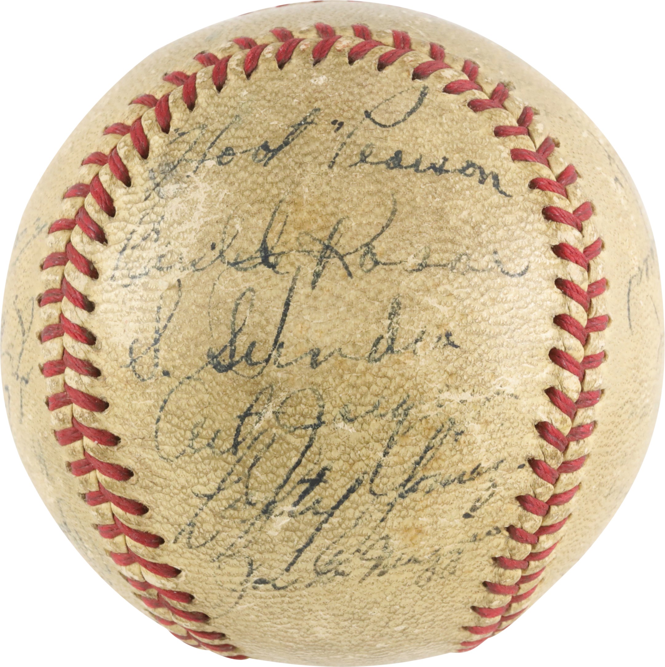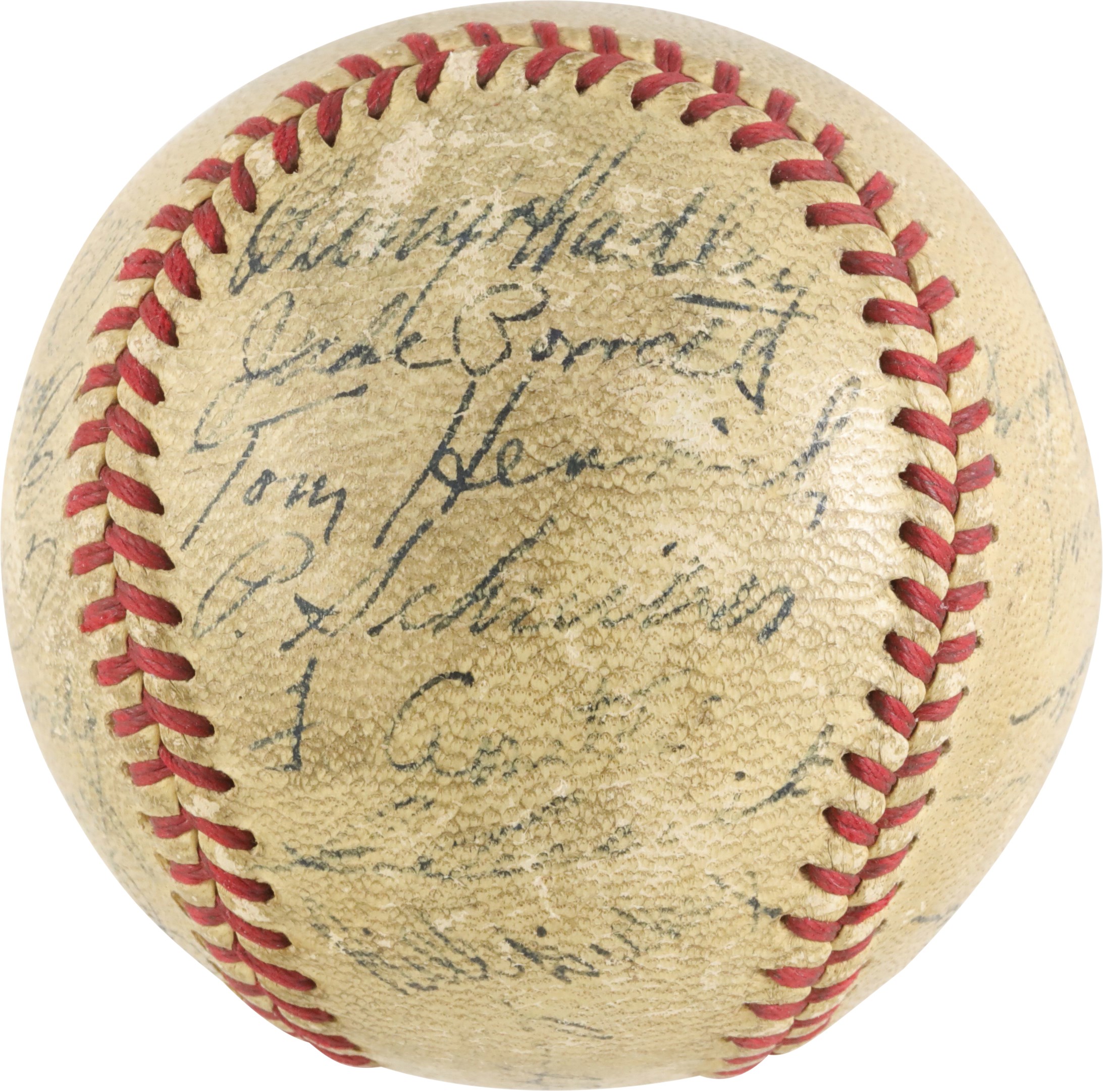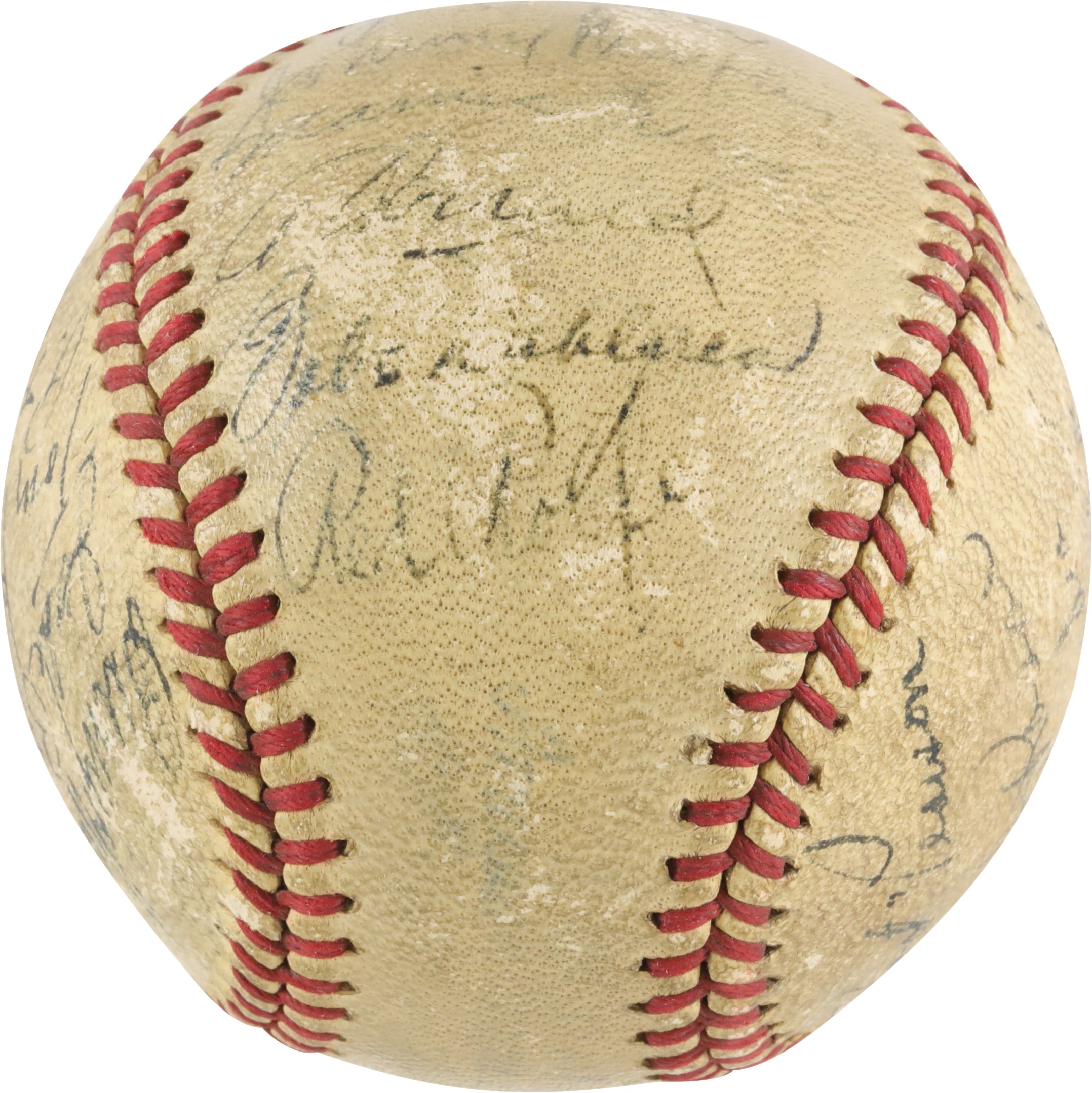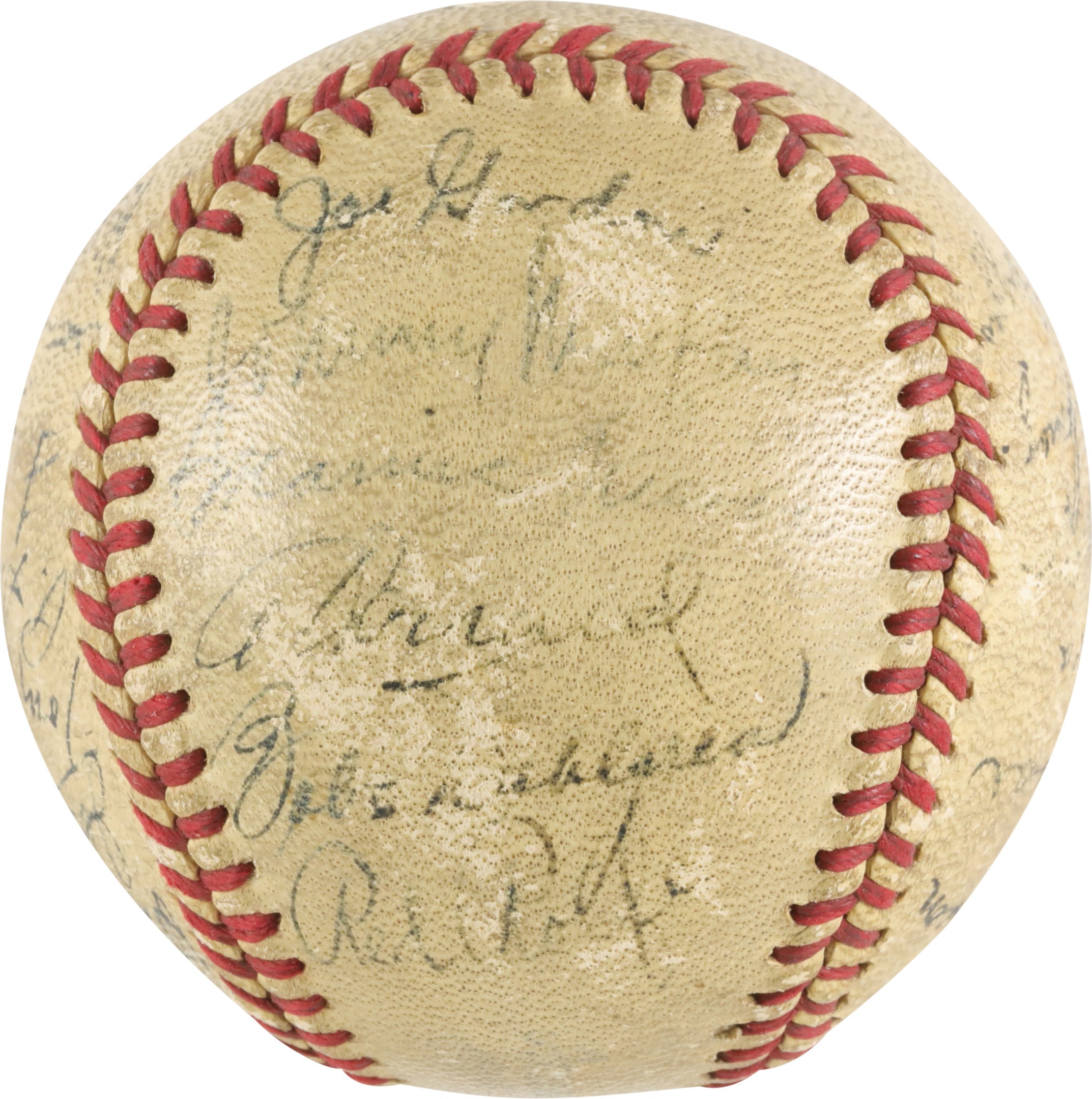 Baseball signed in black fountain pen by twenty-four members of the 1939 World Champion New York Yankees, including DiMaggio, Ruffing (sweet spot), Gomez, Dickey, Gordon, Keller, Knickerbocker, Chandler, Hildebrand, Rolfe, Dahlgren, Donald, Russo, Murphy, Hadley, Powell, Henrich, Schreiber (coach), Crosetti, Selkirk, Jorgens, Sundra, Rosar, and Pearson. (The additional signature of Lou Gehrig has been deemed a clubhouse example by PSA.) The signatures average 6/10. The manufacturer's stampings are no longer legible and the ball is moderately toned/soiled, with several small light-to-moderate abrasions. Good to Very Good condition overall. 1939 was a historic season in franchise history, as it marked the club's then-record fourth consecutive World Championship, as well as Gehrig's final season with the team. Full LOA from PSA.
