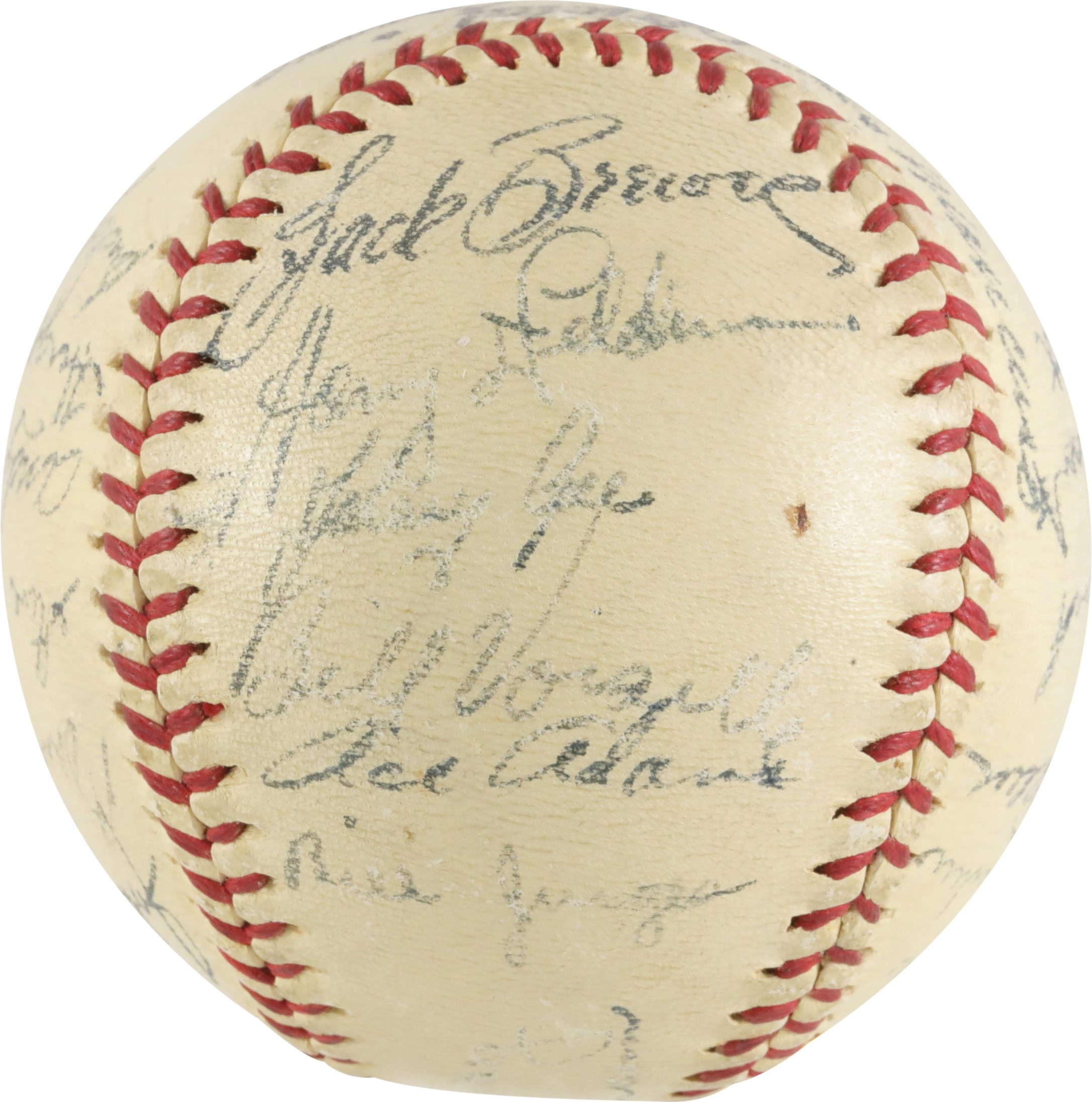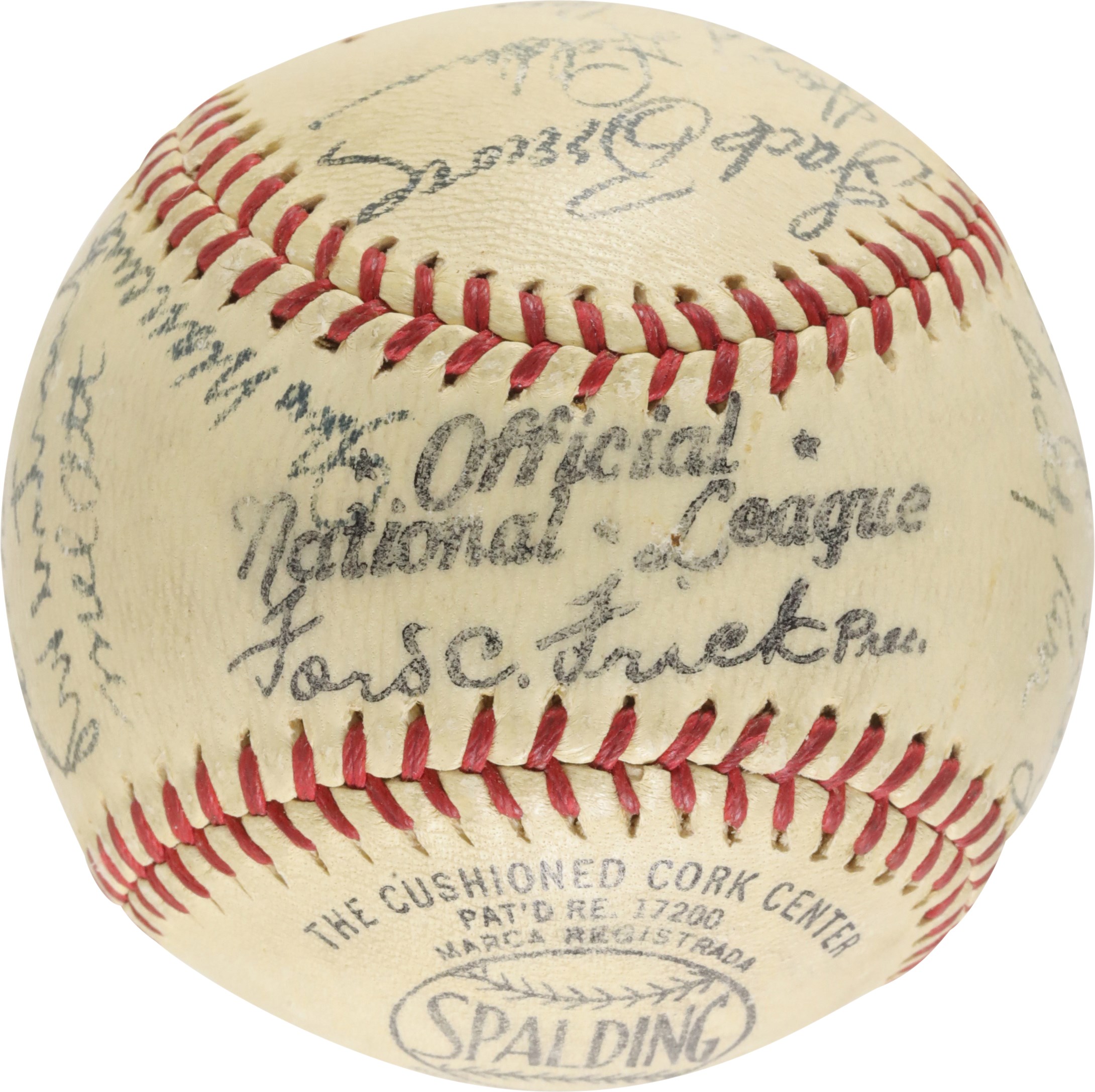 Official National League (Frick) baseball signed in black fountain pen by the following twenty-five members of the 1944 New York Giants: Ott (player/manager), Medwick, Lombardi, Luque (coach), Reyes, Berres, Treadway (sweet spot), Hausmann (sweet spot), Jurges, Adams, Voiselle, Gee, Feldman, Brewer, Pyle, Fischer, Allen, Weintraub, Mancuso, Rucker, Sloan, Filipowicz, Hansen, Luby, and Kerr. Signatures average 6/10. Excellent to Mint condition. Full LOA from PSA.