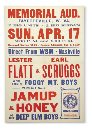 This poster is right out of the fiction of the 2000 Coen Brothers film. Direct from “WSM Nashville” these Foggy Mountain Boys (like “Soggy Bottom”) have the flour advertising right on the poster (like the company owned by the Governor). April 19, 1955 at the Memorial Auditorium of Fayetteville, West Virginia in Appalachia. Folds o/w EX. Charming piece perfectly represents the deserved refocus on Hillbilly Music that the film and its soundtrack perpetuated.