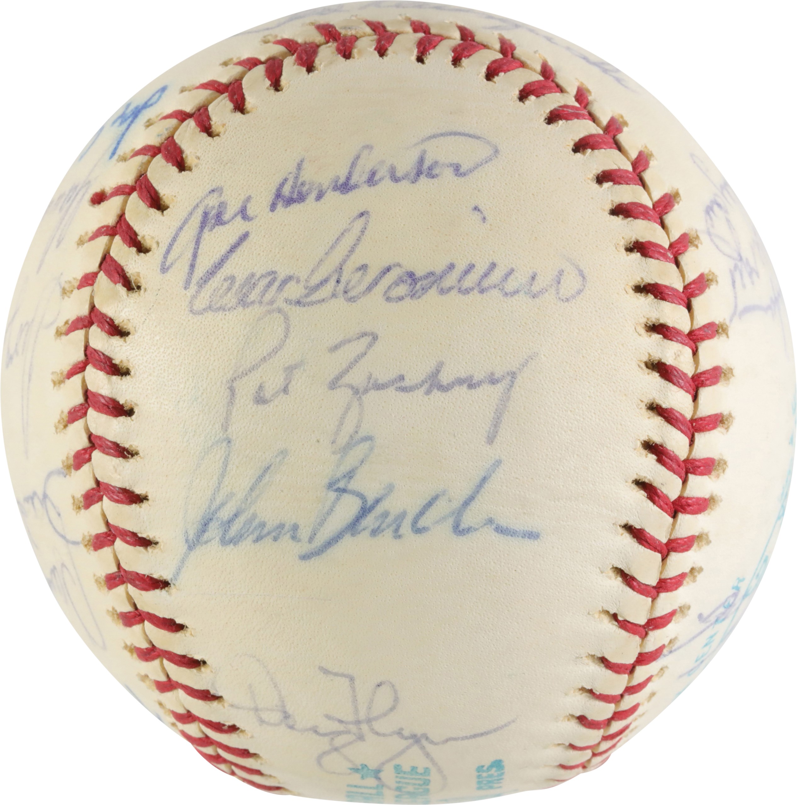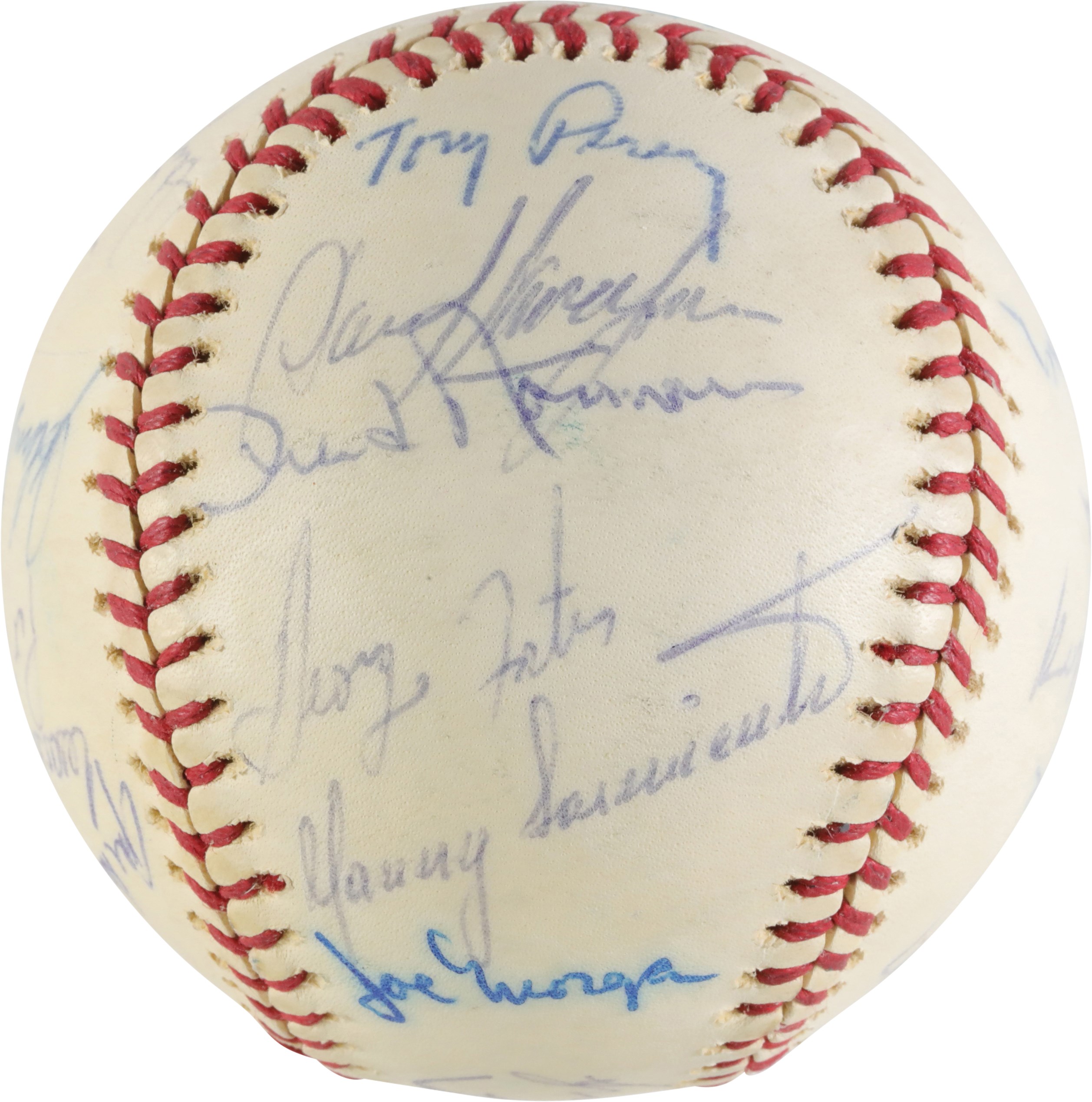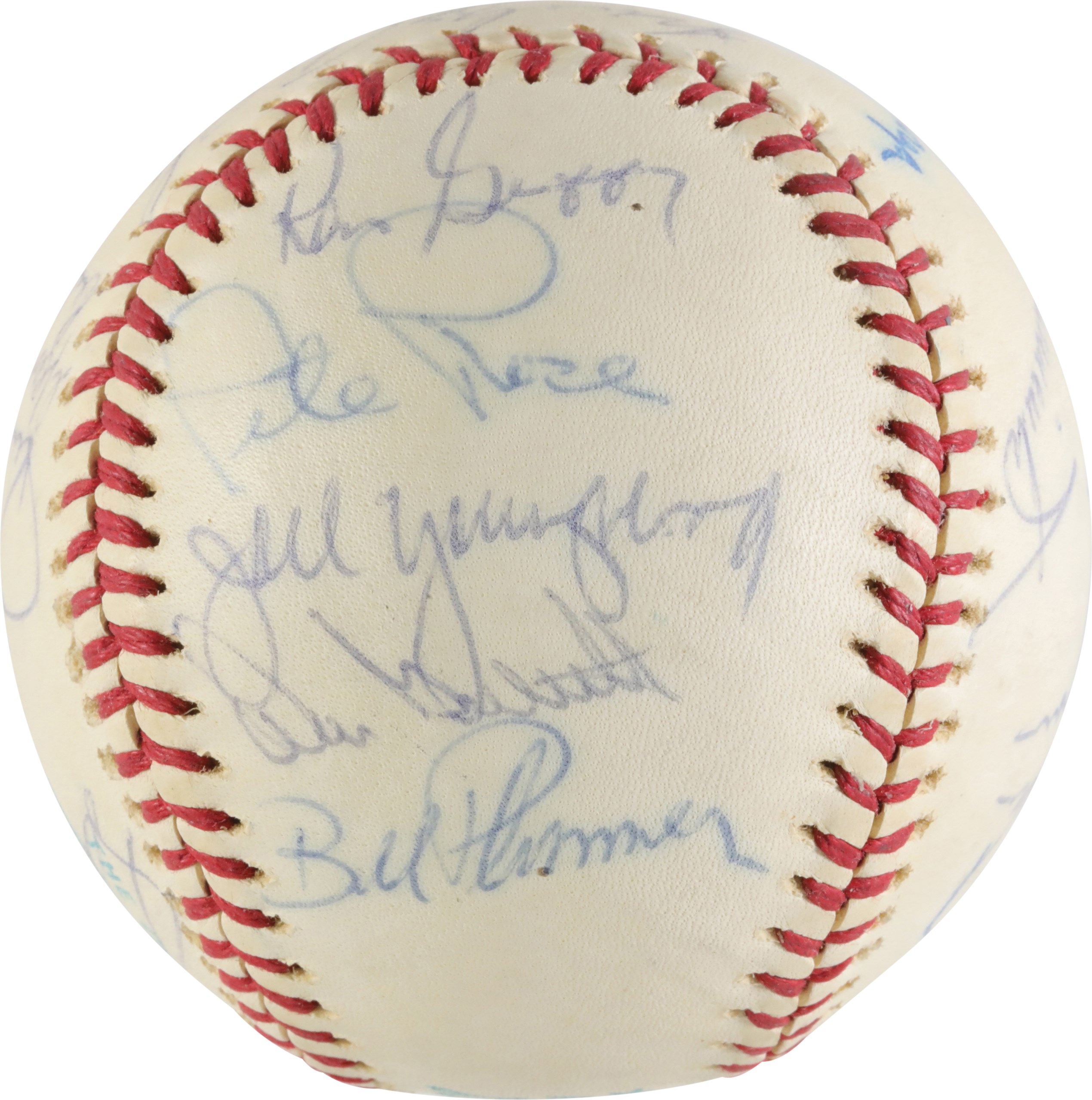 1975 Cincinnati Reds World Series team-signed baseball. This Official American League (MacPhail) baseball has been signed by 21 members of the Reds team. Hall of Fame manager Sparky Anderson signed the ball on the sweet spot. Other key signatures include Johnny Bench, Pete Rose, Tony Perez, Ken Griffey, Pat Zachary, and Ted Kluszewski. The Reds defeated the Red Sox 4 games to 3 to win the 1975 World Series.