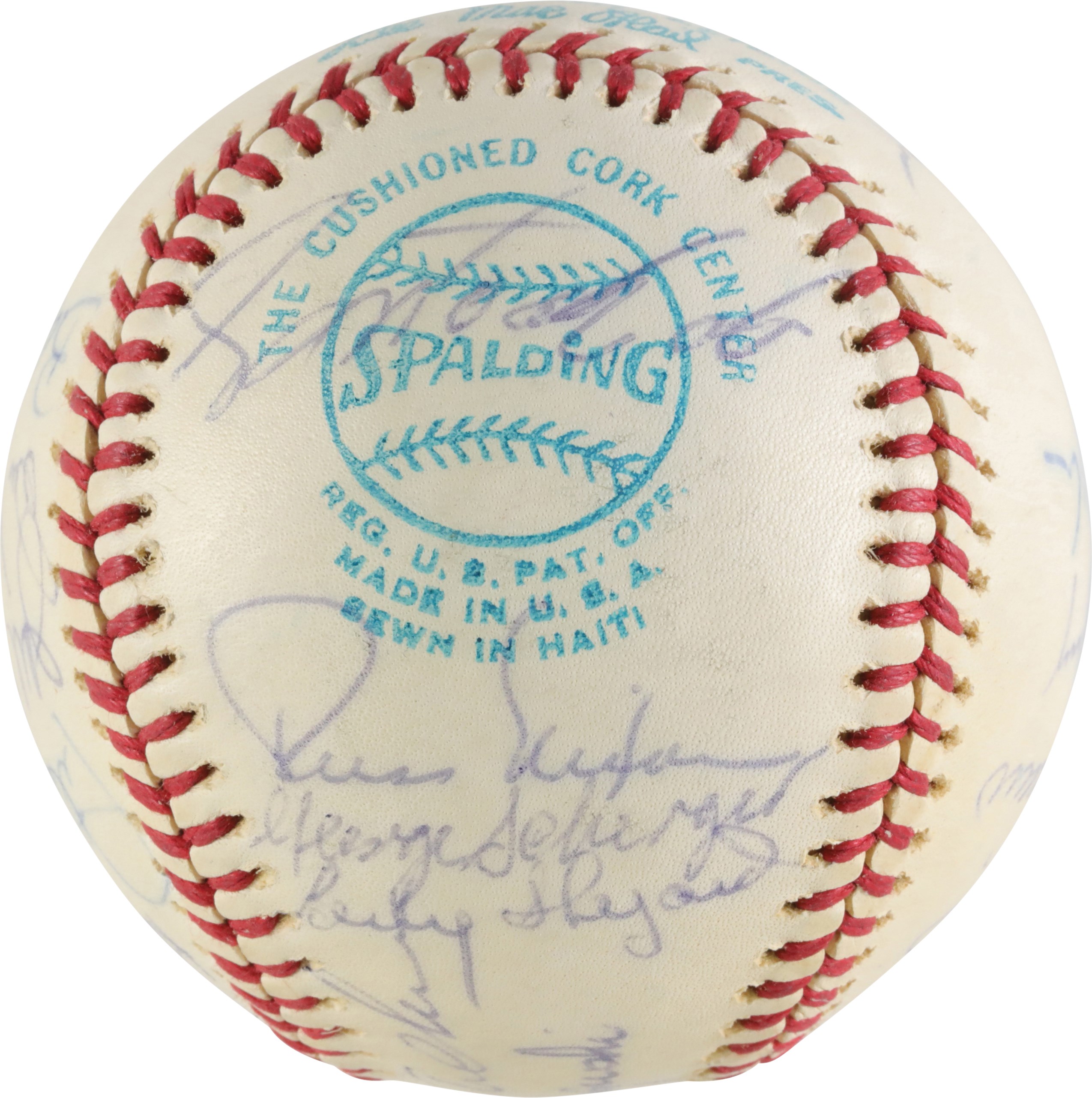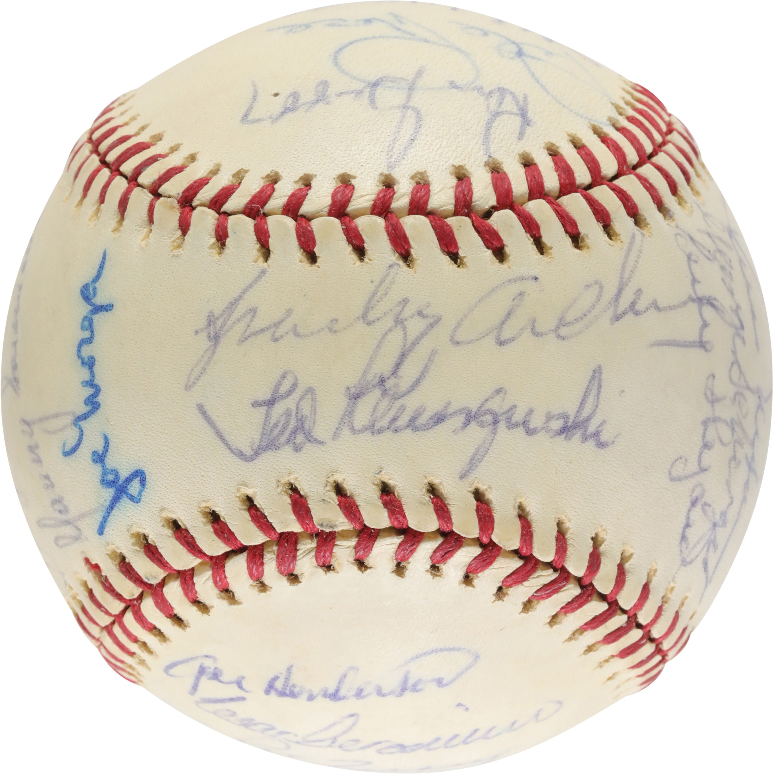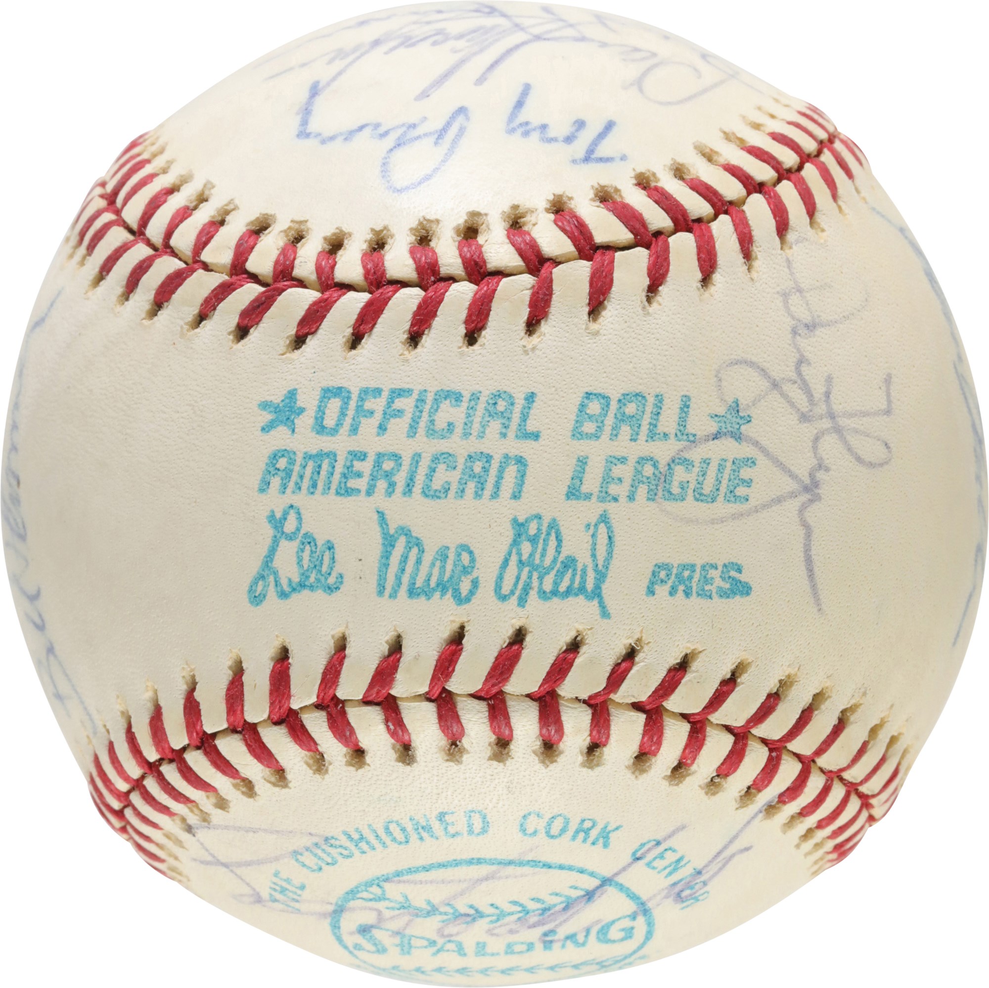 1975 Cincinnati Reds World Series team-signed baseball. This Official American League (MacPhail) baseball has been signed by 21 members of the Reds team. Hall of Fame manager Sparky Anderson signed the ball on the sweet spot. Other key signatures include Johnny Bench, Pete Rose, Tony Perez, Ken Griffey, Pat Zachary, and Ted Kluszewski. The Reds defeated the Red Sox 4 games to 3 to win the 1975 World Series.