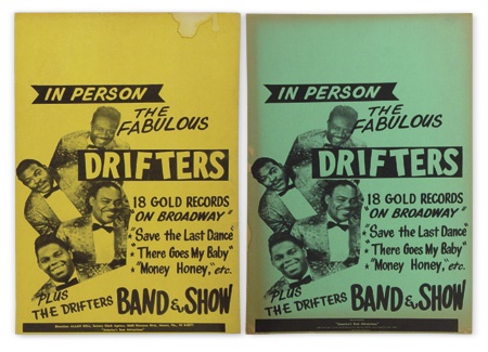 Seductive pair features “The Fabulous Drifters”. Lists their incredible catalogues including On Broadway, Save The Last Dance, There Goes My Baby, and Money Honey. Dates from the late 1950s. Two color variations. One has 4” tear; both have some minor water spotting.