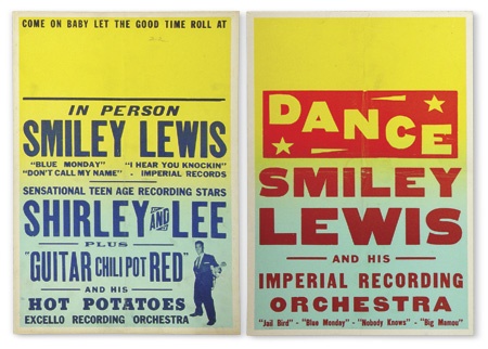 One of the founding fathers. 1) Smiley leads the bill and poster teases with I Hear You Knockin’ and very top reads “Come on Baby Let The Good Times Roll!” Also listed on the bill are Shirley and Lee and pictures Guitar Chili Pot Red. 2) “Smiley Lewis And His Imperial Recording Orchestra” are featured with their hits Jail Bird, Blue Monday, Nobody Knows, and Big Mamou. Folds o/w EX. 14x22”.