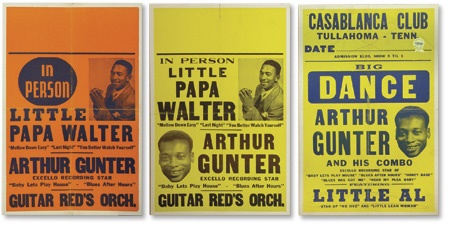 Three dashing posters from this “Excello Recording Star” of Baby Lets Play House. He is pictured on two and Little Papa Walter is on the other. Folds and one has pencil marks o/w EX. Elvis Presley cut a version of Baby Let’s Play House early in his career.