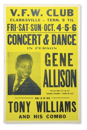 Early rock ‘n roll piece features this R&B legend. His songs are listed including the classic You Can Make It If You Try. October 4-5, 1957 at the VFW Club in Clarksville, Tennessee. Folds o/w EX.
