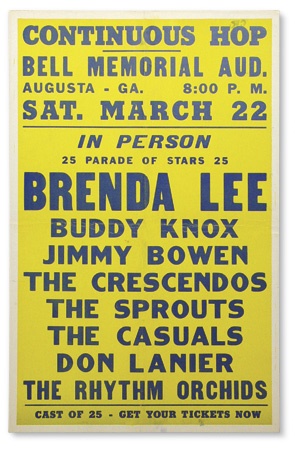 “Parade of 25 Stars” featured Brenda Lee, Buddy Knox, Jimmy Bowden, The Crescendos, The Sprouts, The Casuals, Don Lanier, and The Rhythm Orchids. March 22, 1958 in Augusta, Georgia. Folds o/w VG-EX.