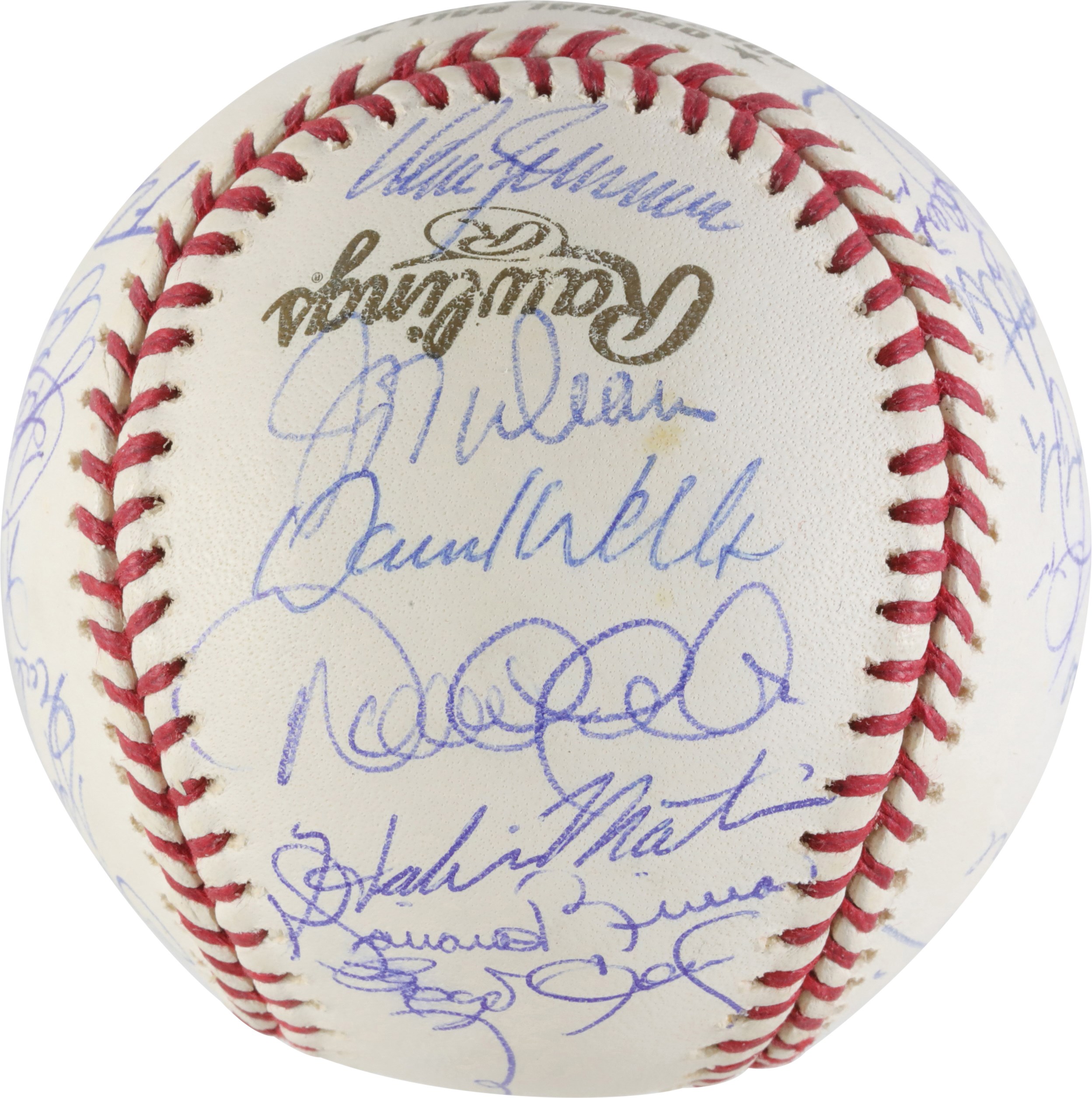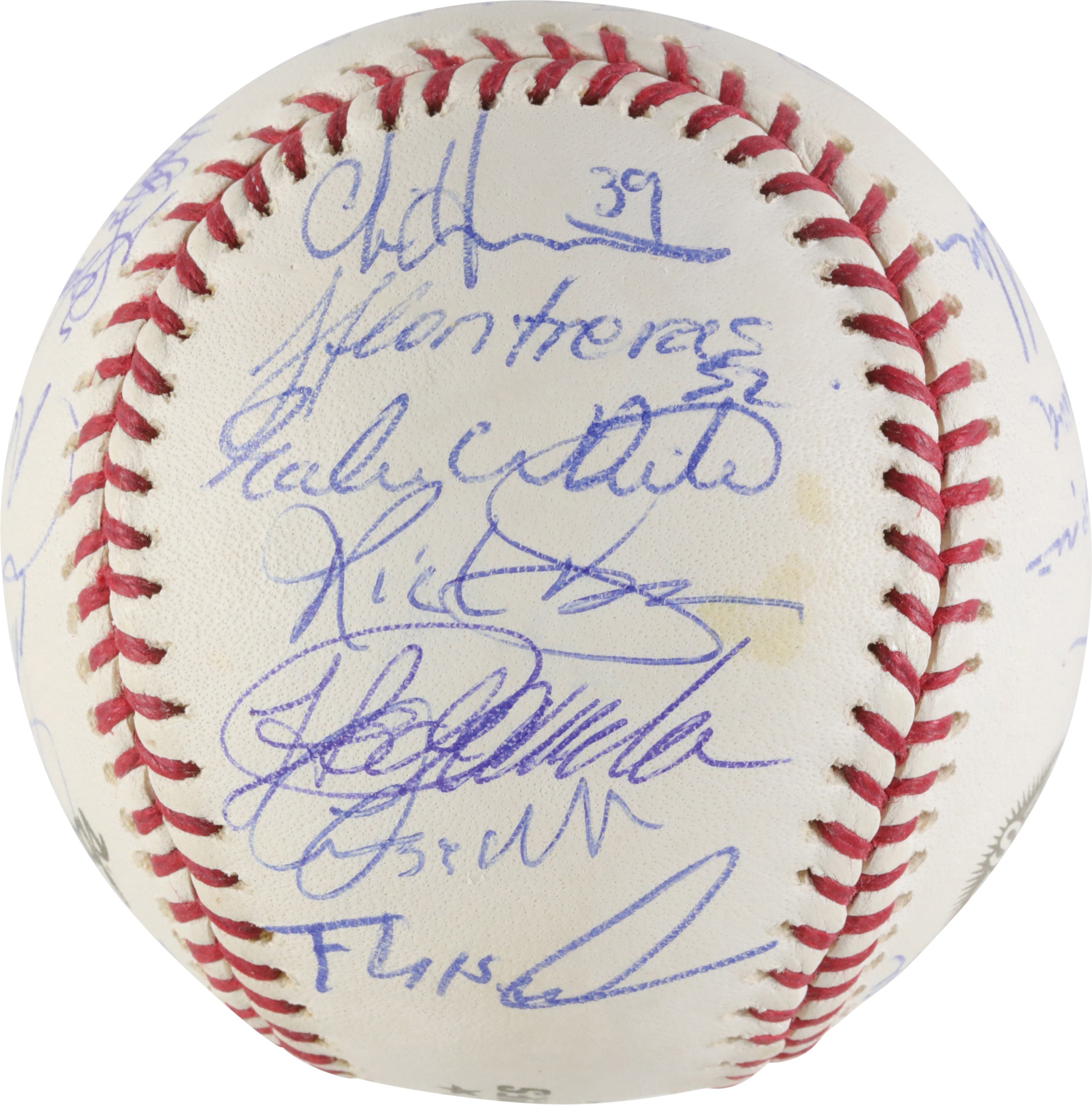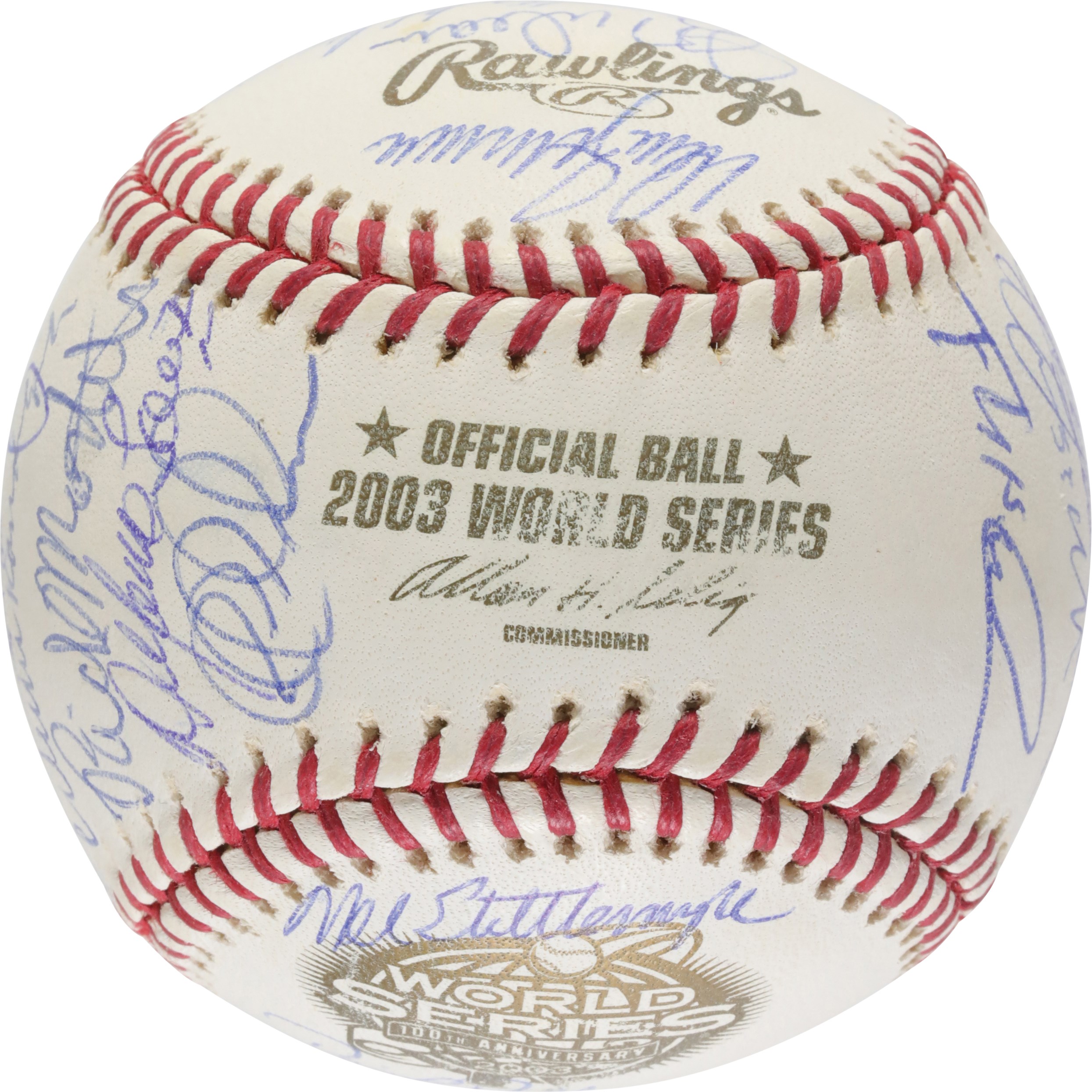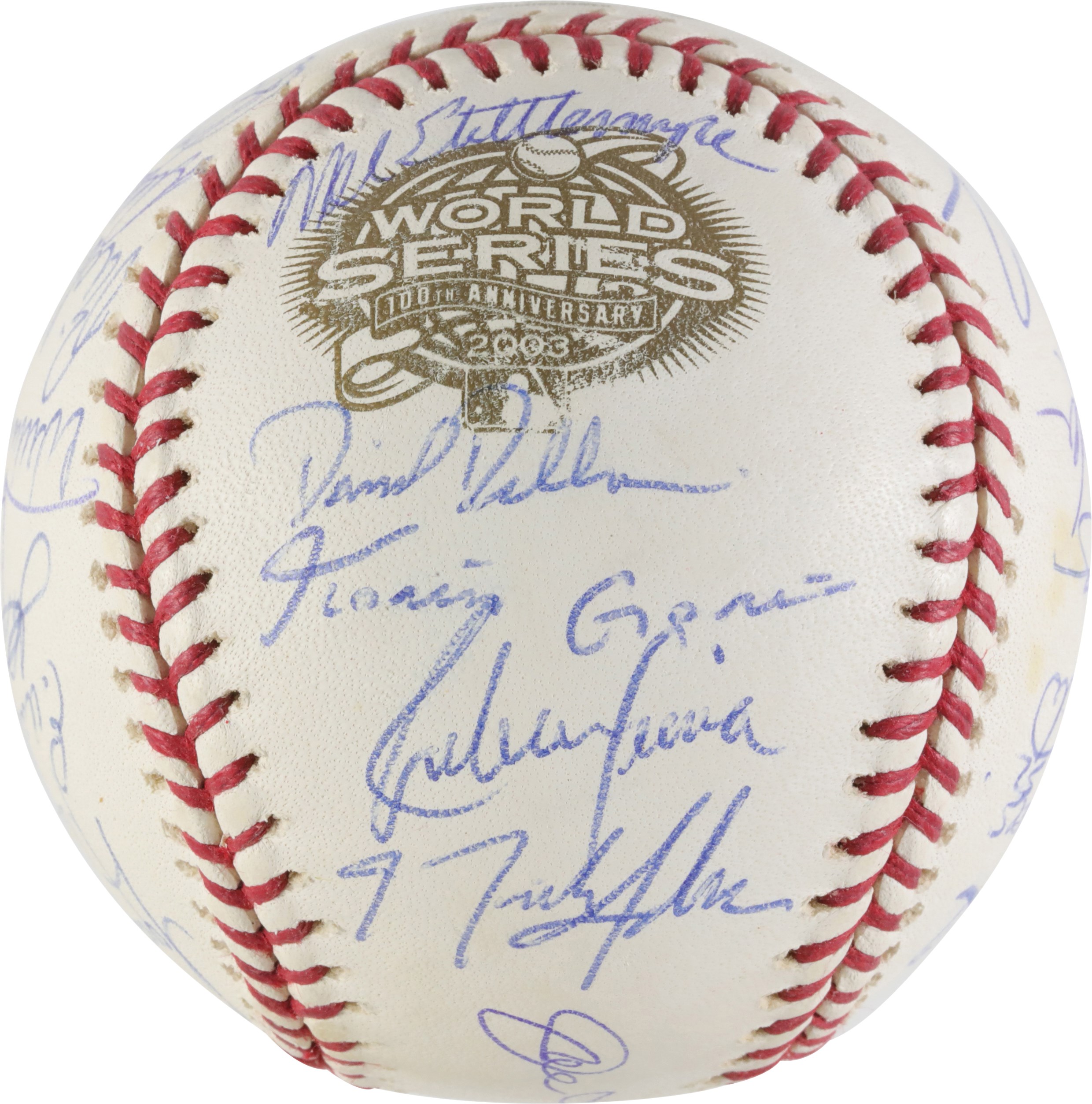 A baseball signed by the New York Yankees 2003 team that faced the Miami Marlins during the 2003 World Series.  The official World Series ball features 28 autographs signed in blue ink. Signatures on the ball include: Joe Torre, Derek Jeter, Roger Clemens, David Wells, Mariano Rivera, Aaron Boone, Jose Contreras, Willie Randloph and Hideki Matsui. The lot will include a Letter of Authenticity from PSA/DNA. The Yankees fell to the Marlins in a classic 7 game series that saw pitcher Josh Beckett win the MVP Award.