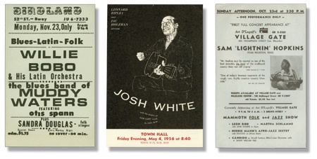 Super collection of material from the great bluesmen includes the following: 1) 1959 “Blues Band of Muddy Waters” at Birdland in NYC. 2) 1961 John Lee Hooker at Folk City. 3) Josh White at Town Hall (May 4, 1956). 4) Sam Lightnin’ Hopkins at the Village Gate with nice image of him in shades (October 23, 1955). 5) Nice illustrated Lightnin’ Hopkins at the Ethical Society Auditorium (November 26, 1960). 6) Big Joe Williams “in a program of authentic country blues on a nine-string guitar” at Carnegie Chapter Hall (March 9, 1962 with Victoria Spivey). Overall EX. Average 7x10”.