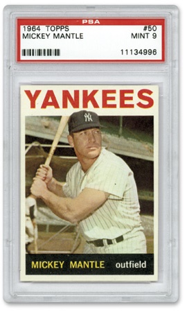 The 1964 Topps Mantle is deceptively tough. It is very tough to obtain in mint condition. It is very hard to find this card with fresh eye appeal; it tends to come with a dull look or finish. This outstanding example has been assigned the grade of PSA 9. It is mint in every way: near perfect centering, razor sharp corners, and bold white color. A must have card for the discriminating Mantle collector.