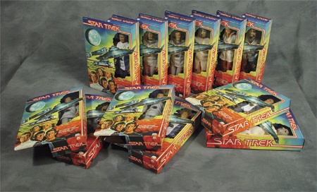 Captain’s Log, Star Date 81077: We have taken aboard a highly collectible and very desirable piece of cargo. Twelve (12.5”) fully poseable and authentically costumed assortment of figures. Included are Kirk (3), Spock (3), Klingon (2), Arcturian (2), Ilia, and Decker. All are unopened, in their original packaging and will be shipped to you still in the original box from the manufacturer. Mint.