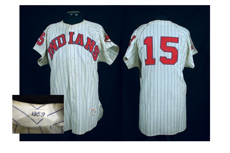 Nice pinstriped home flannel is from the popular Cleveland backstop, and shows fine use from a season behind the plate. “Indians” spans chest, with number “15” on back, and again on the right sleeve (this is a very desirable style). Chief Wahoo patch is on left sleeve. “1959” is stitched in blue thread in collar. “Wilson [size] 44” tagging in tail. A great piece for display.
