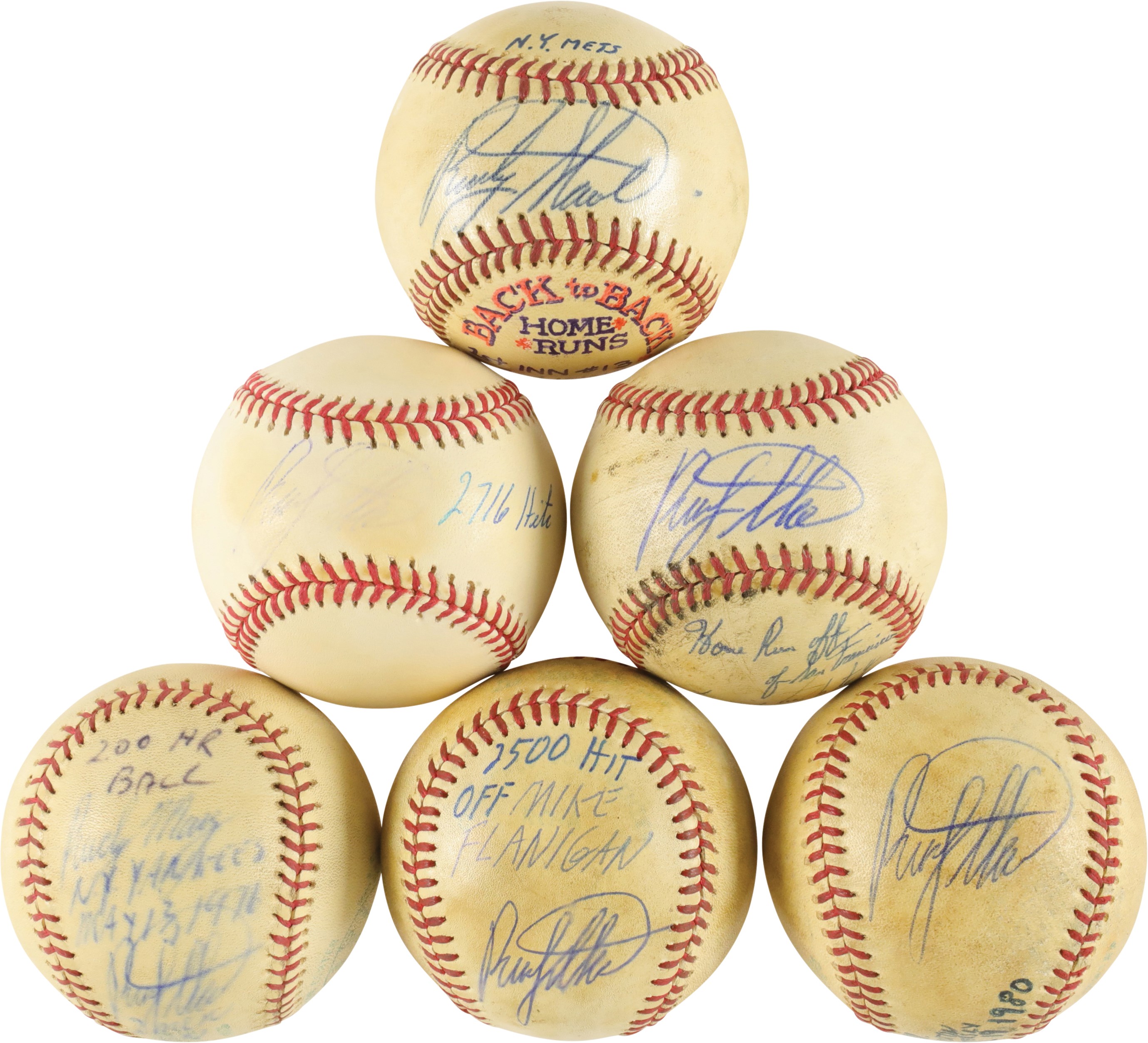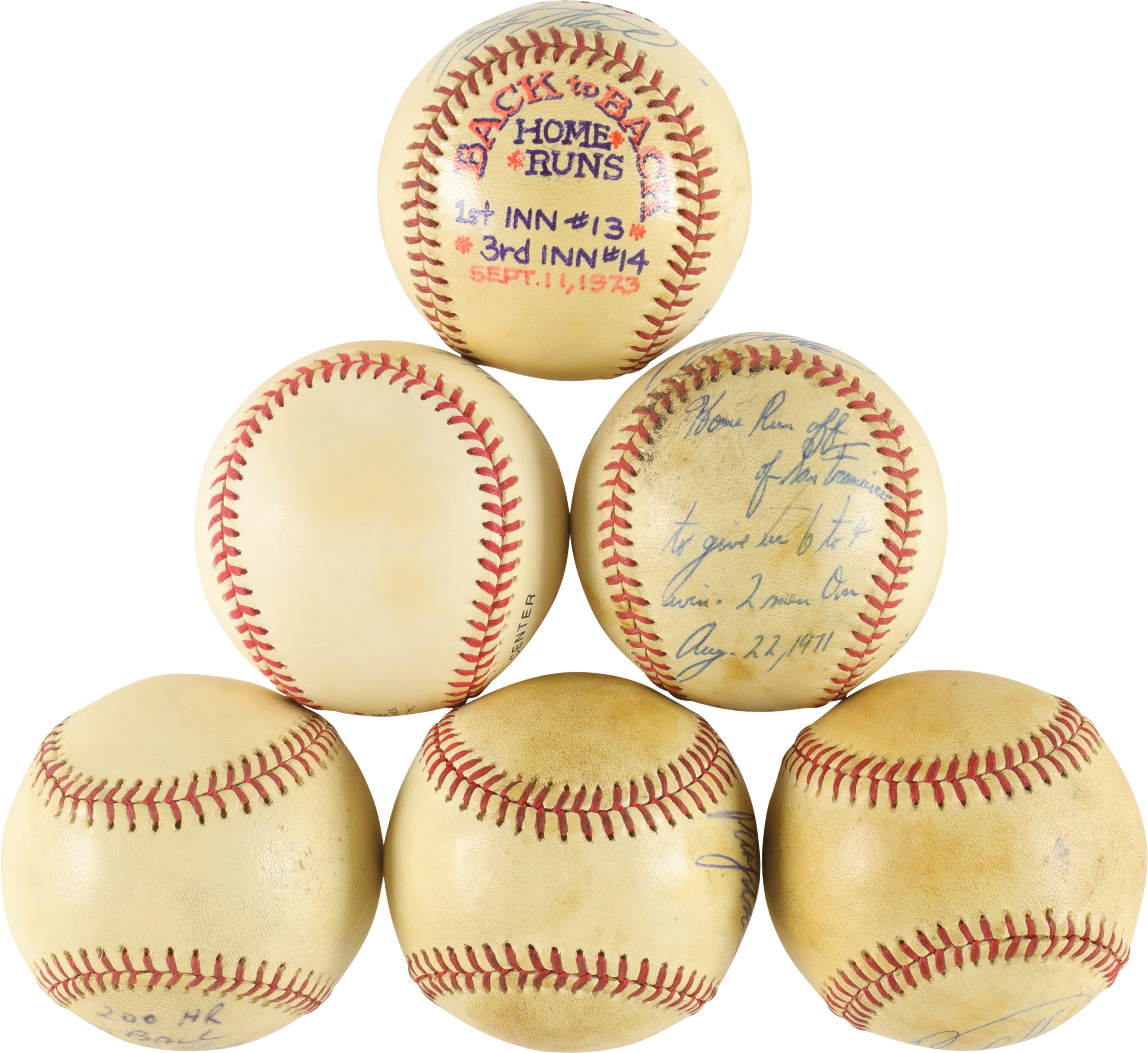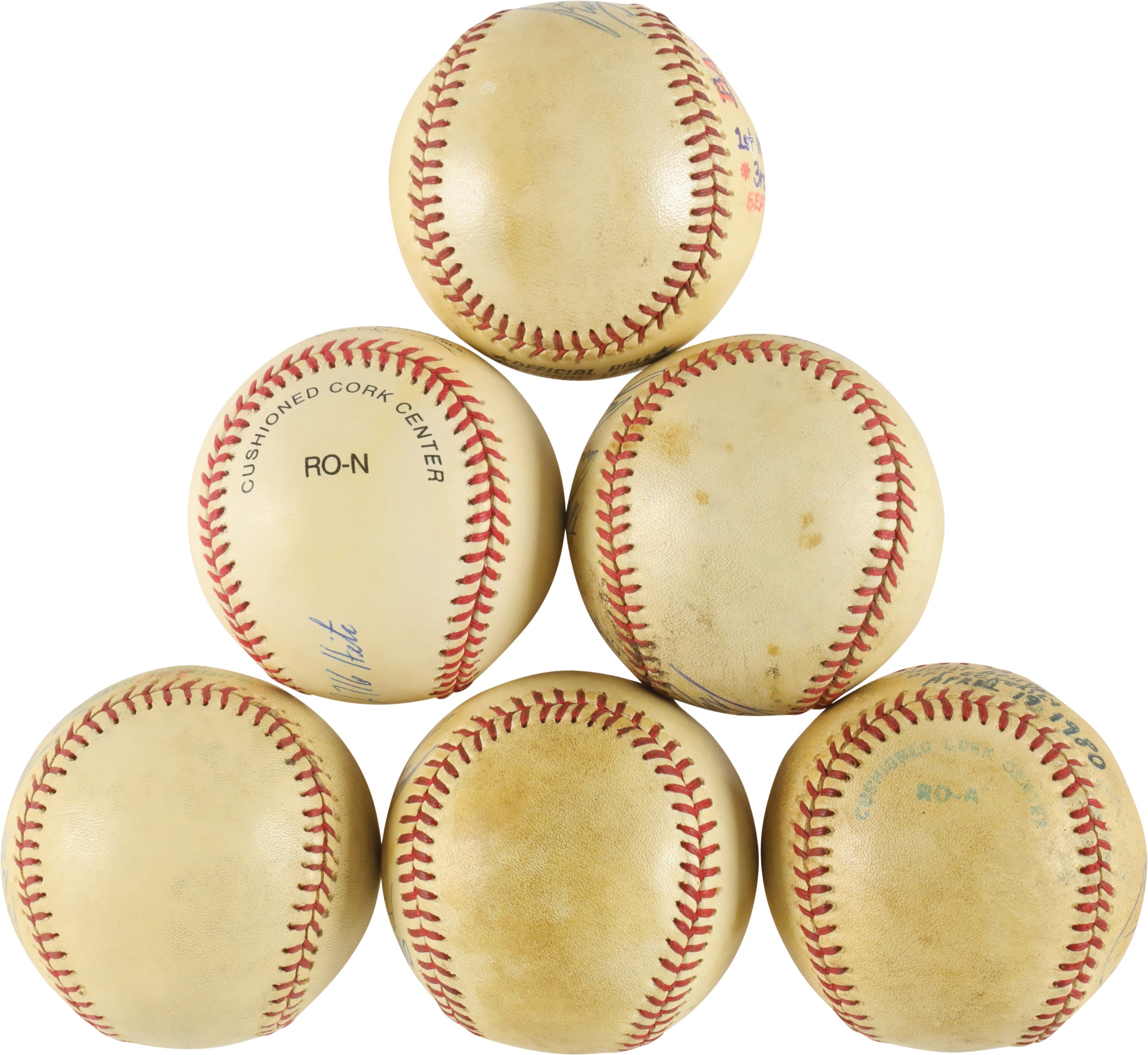 Sourcing from the largest Rusty Staub collection we've ever encountered, this home run baseball collection features six (6) examples, each hand-labeled (unknown hand) and signed by the man himself. Collection includes "Back to Back Home Runs - 1st Inn #13 #rd Inn #14 - September 11, 1973 - N.Y. Mets;" "200 HR Ball - Rudy May NY Yankees - May 13, 1976;" "2500 Hit Off Mike Flanigan;" "Home Run off San Francisco to give 6 to 4 win. 2 men on - Aug 22, 1971;" "G.S. HR. - Against Boston Off Eckersley - April 19, 1980;" and "2716 Hits."