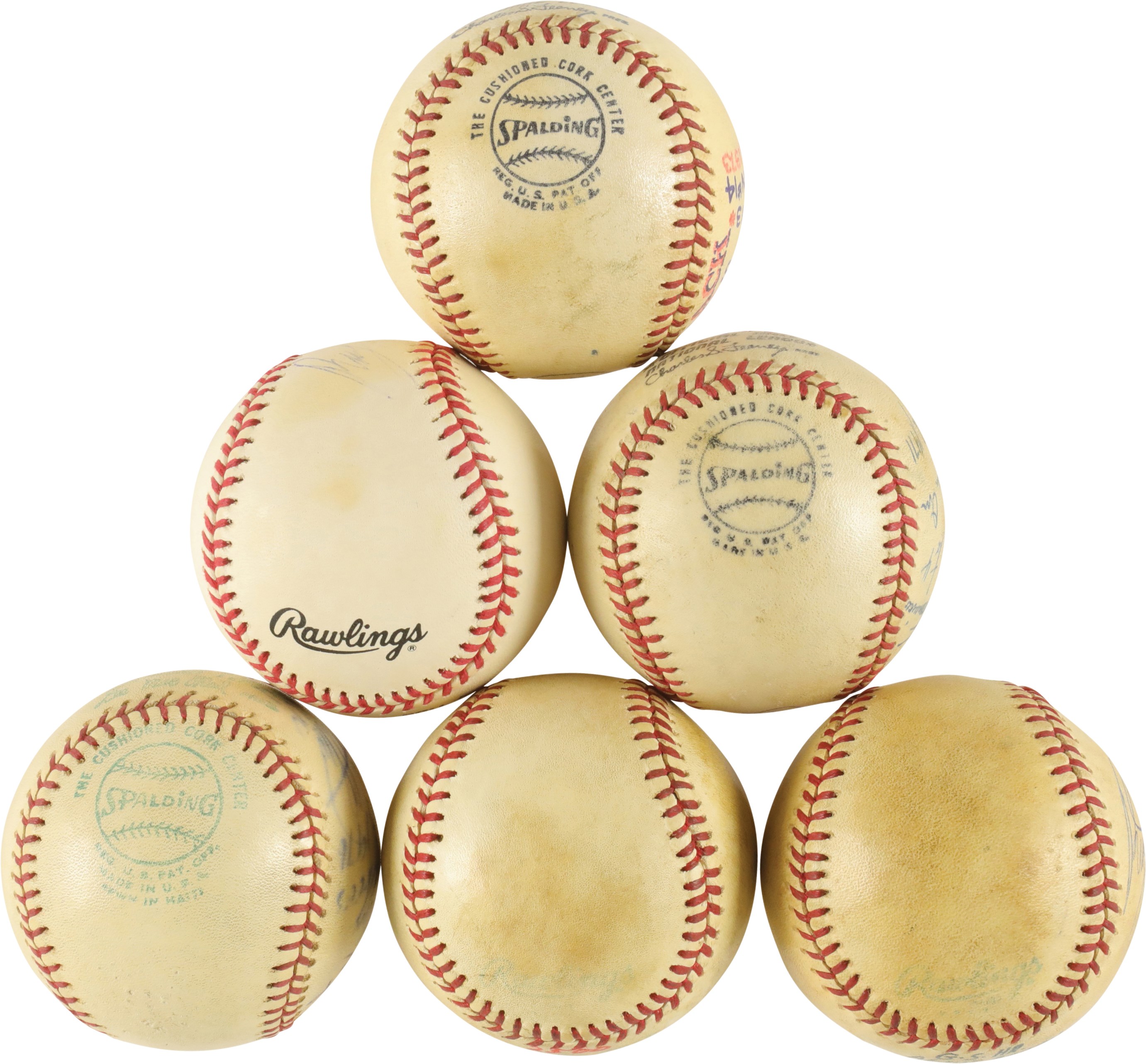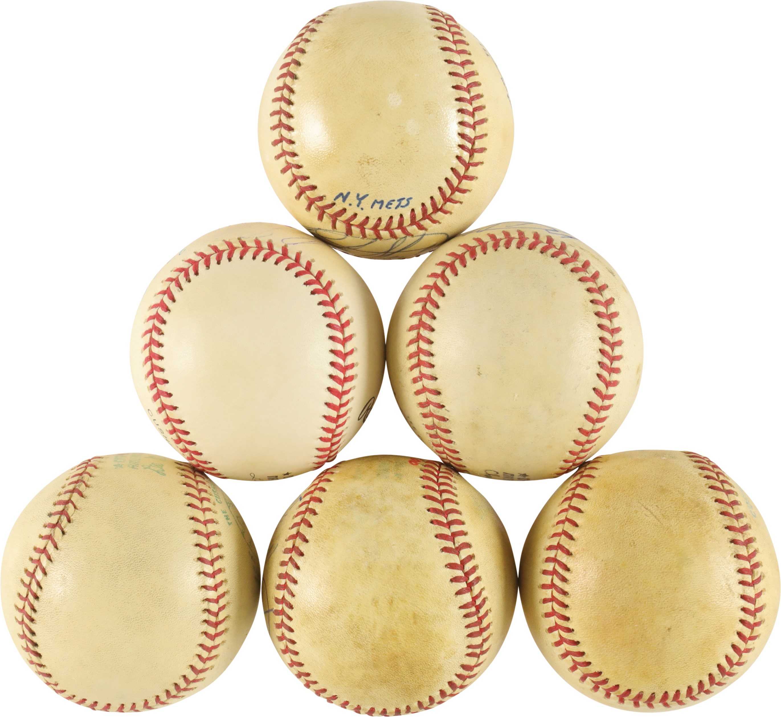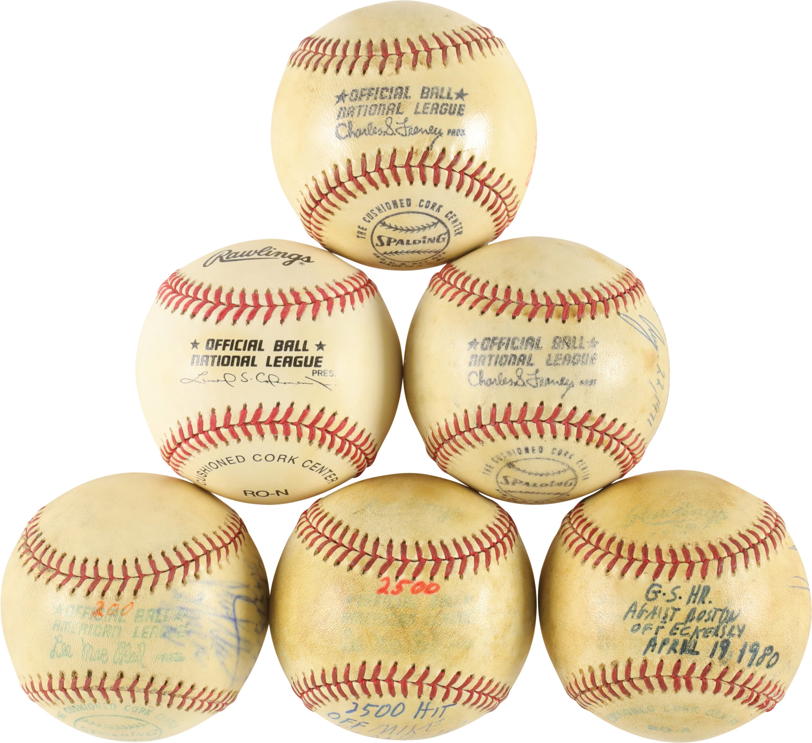 Sourcing from the largest Rusty Staub collection we've ever encountered, this home run baseball collection features six (6) examples, each hand-labeled (unknown hand) and signed by the man himself. Collection includes "Back to Back Home Runs - 1st Inn #13 #rd Inn #14 - September 11, 1973 - N.Y. Mets;" "200 HR Ball - Rudy May NY Yankees - May 13, 1976;" "2500 Hit Off Mike Flanigan;" "Home Run off San Francisco to give 6 to 4 win. 2 men on - Aug 22, 1971;" "G.S. HR. - Against Boston Off Eckersley - April 19, 1980;" and "2716 Hits."