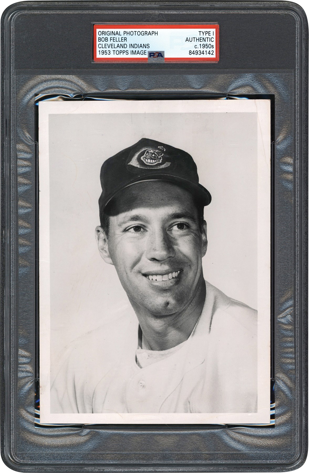 Displayed is a circa 1952 original photograph of Hall of Fame Cleveland Indians right-hander Bob Feller and was used for his 1953 Topps image. Feller spent his entire Major League career with Cleveland. He won 266 games, and most likely would have far surpassed 300 wins if not for missing nearly four full seasons during World War II, when he served in combat for the U.S. Navy as a gun captain aboard an aircraft carrier in the South Pacific. Feller led the AL in strikeouts seven times, and he was a member of the 1948 World Champions. The offered photo was used to produce Topps 1953 card #54. This set exhibits gorgeous, detailed artwork, with the photos becoming painted pictures that are stunning in their vibrant hues. The black & white photograph measures approx. 5x7". It has been PSA Certified as "TYPE I AUTHENTIC." The photo has a crease and some slight wrinkling near the top, but it is in otherwise EXCELLENT condition.