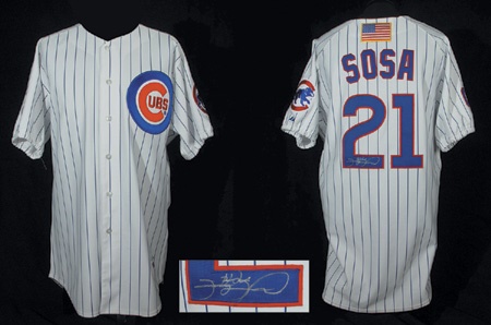 2001 was Sammy’s best season yet (although not as huge as his ’98 season). Hitting over 60 homers for the 3rd time in 4 seasons, he also had a career high .328 BA and 160 RBI. Single-handedly the only reason why the Cubs were in contention for the NL Central Division title. Home white pinstripe with large circular “Cubs” patch on left breast. “Sosa 21” on verso with American flag patch just below collar line. Signed nicely in silver sharpie on the bottom of the “2” on verso. “C” stitched onto right sleeve. “C” patch with cub patch on left sleeve. Tagging on front left tail is “Majestic Authentic Collection” with [size] 48 flag tag. LOA from Sammy’s brother.