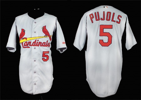 You’re looking at the future of the Card’s. Road gray jersey worn by St. Louis phenomenon, Albert Pujols. The 2001 ROY’s power has filled the gaping hole in the Cardinal’s offense left by the retirement of “Big Mac”. “Cardinals 5” with two cardinals perched on ends of bat logo across chest. “Pujols 5” on verso. Inside front left tail tagging is “Rawlings, Authentic Collection” with “2 Inch Extra Length”, size “48”, & “set 1 2001” flag tags. LOA.