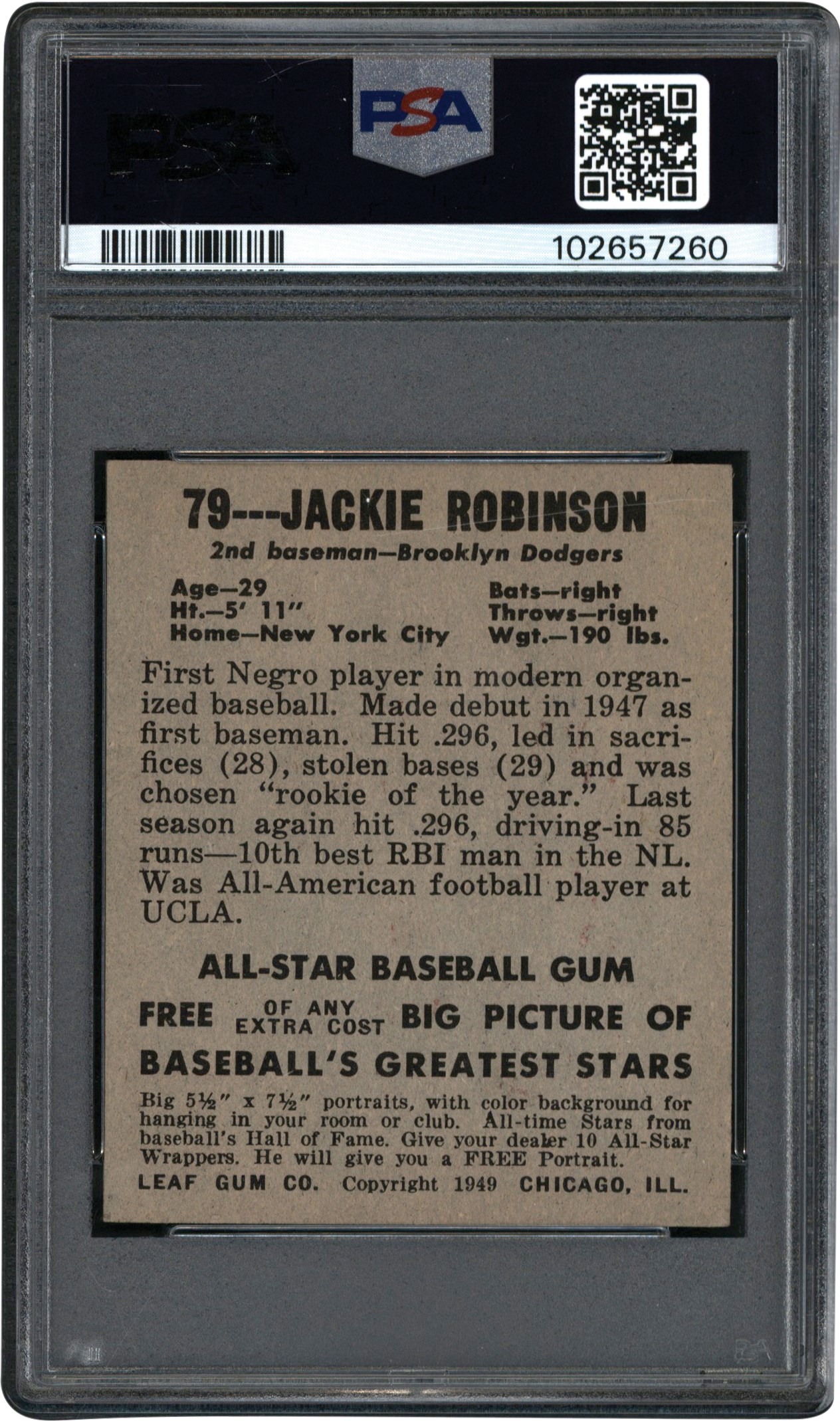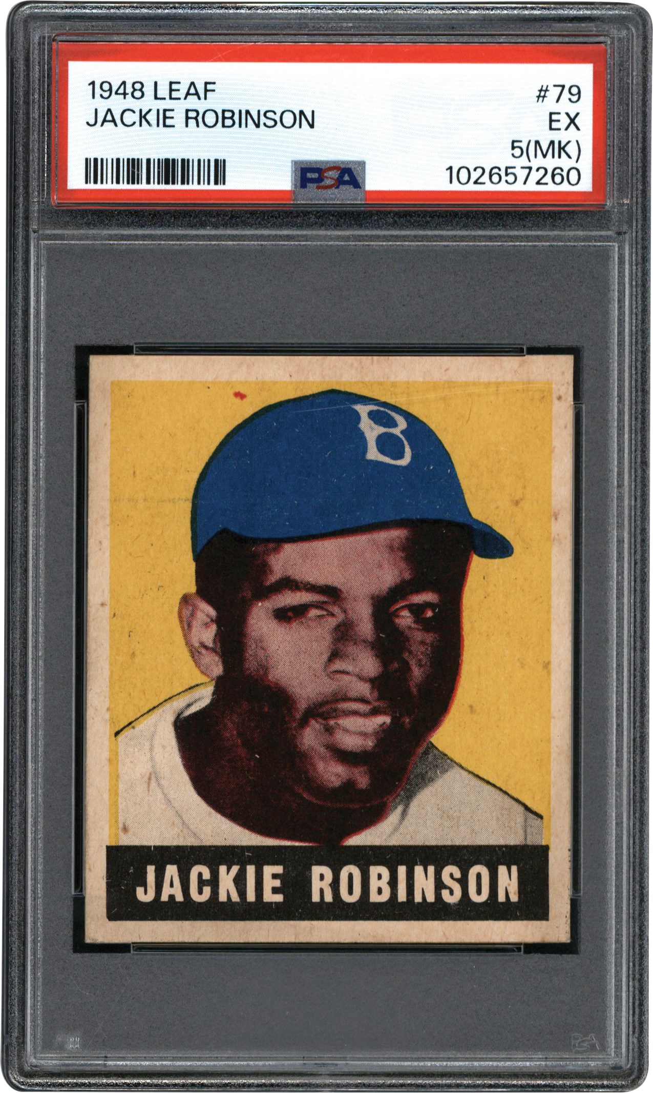 1948 Leaf 79 Jackie Robinson (R) card. The card has been graded and encapsulated by PSA EX 5 (MK). It has a colorful image of a grinning Robinson against a yellow background. The edges appear smooth while the centering is slightly off top to bottom. All four corners exhibit touches. There is a pinkish print dot to the left and above Robinson's head. The reverse is bright and clean.