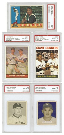 (64) PSA graded baseball cards from 1948 to 1969. Highlights of this grouping are a 1948 Bowman #4 Mize rookie PSA 8, 1949 Bowman #114 Reynolds PSA 8, 1960 Topps #326 Clemente PSA 7, 1961 Topps #207 Dodger Southpaws and #460 Hodges PSA 8, 1962 Topps #399 Spahn All Star PSA 8, 1964 Topps #306 Giant Gunners PSA 8, etc. There are (2) PSA 9’s in the lot, 1964 Topps #279 and 407. The following are the PSA 8’s in the lot: 1948 Bowman PSA 8- #21, 25, and 31, ’51 Bowman #61, ’56 Topps #14 Boyer, ’60 Topps #55, 230, 240 Aparicio, and 395 Wilhelm, ’61 Topps #416, 440, 455 Wynn, ’62 Topps #60 Koufax Leaders, (2) 463, ’63 Topps #54, (4) 79, 150 Podres, and 440 Marichal, ’64 Topps #5Koufax Leaders, 11 Aaron Leaders, 38, 89, 280, (2) 285 Roberts, 350 McCovey, and 580, ’66 Topps #241 Killebrew Leaders, 439, ’67 Topps #255, ’68 Topps 125, 328, 375, 378, 449, 452, 484, 504, 567, 587, and 592, ’68 Topps Game #8, and ’69 Topps #10 Gibson Leaders, 295, 311, and 421. There are (4) assorted PSA 7’s highlighted by a ’60 Topps Ford. One PSA 6. A great mix of baseball in primarily NM-MT condition or better!