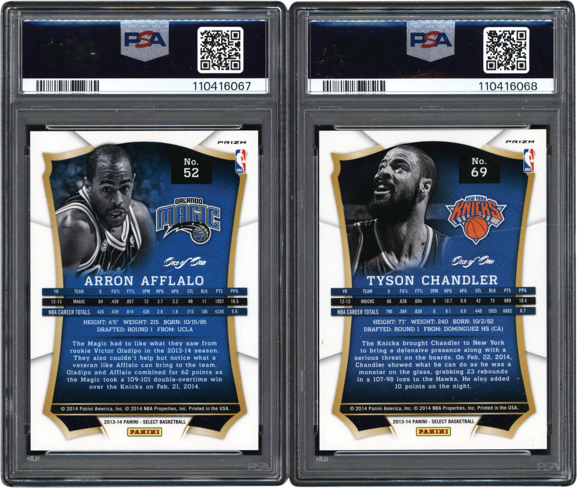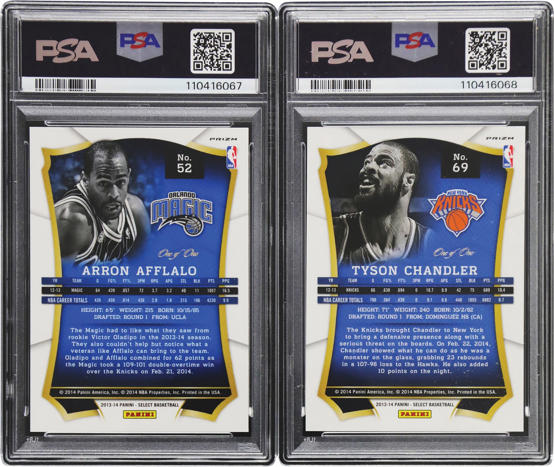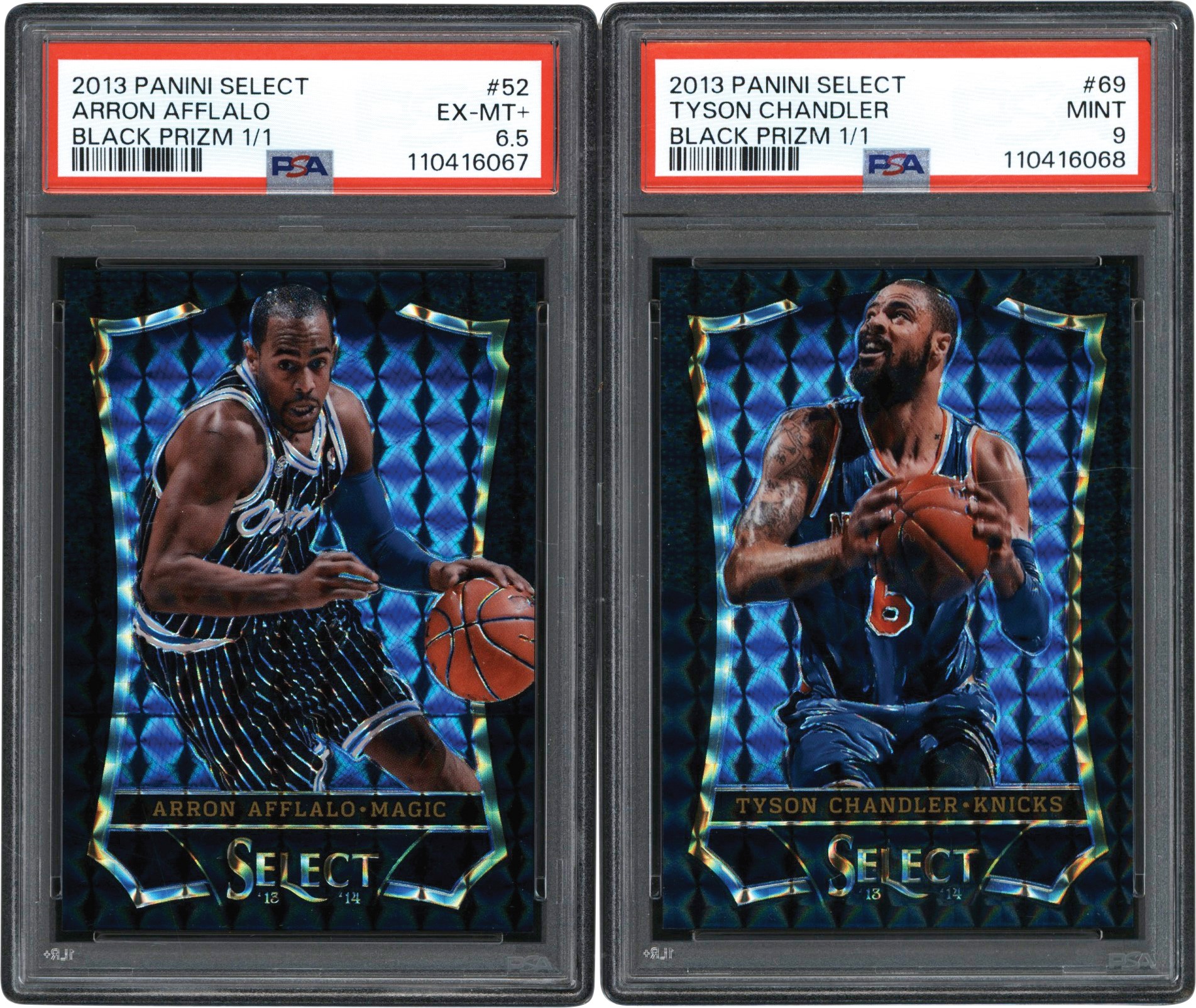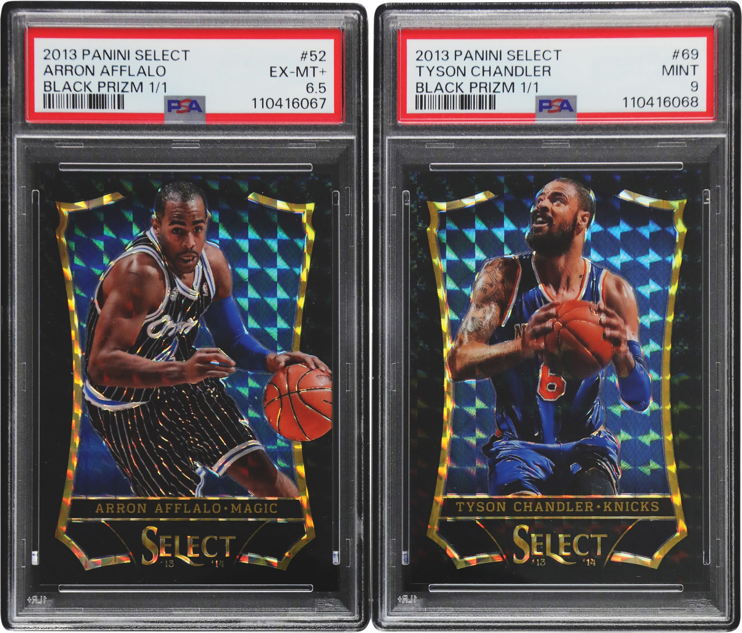 This lot features a pair (2) of 2013 Panini Select Black Prizm 1/1s. Both cards have been graded and encapsulated by PSA including: #52 Aaron Afflalo Black Prizm 1/1 EX-MT+ 6.5; and #69 Tyson Chandler Black Prizm 1/1 MINT 9.