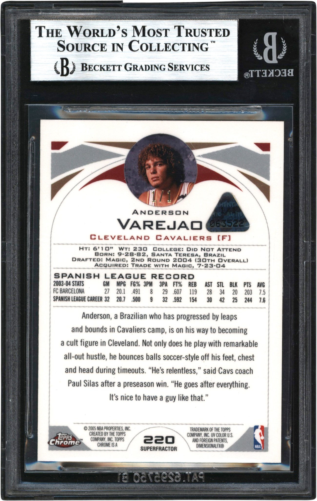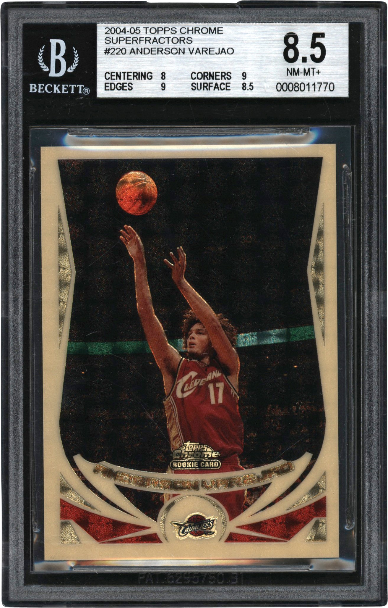 This lot features a 2004-05 Topps Chrome #220 Anderson Varejao Superfractors #1/1 Rookie card. This card has been graded and encapsulated by BGS NM-MT 8.5. The subgrades are: centering 8; corners 9; edges 9; and surface 8.5. This card is number 1 of 1 meaning it is the only card of its kind produced and features the extremely sought after Gold Vinyl SuperFractor parallel.
