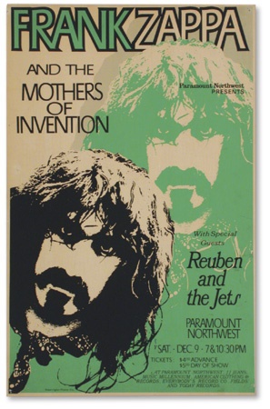 An impressive 1970’s early appearance with the Mothers of Invention, Frank’s face is advertised on this striking heavy cardboard poster. “Boxing style” refers to the fact that these posters were tacked on telephone poles like boxing and sporting event posters. Border was possibly trimmed due to some inking, probably on left side and has some pinholes. Otherwise EX.It is NOT trimmed.