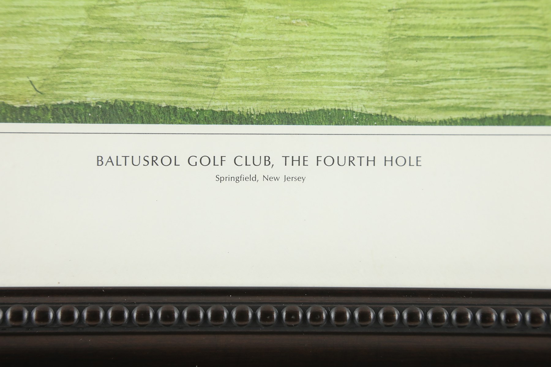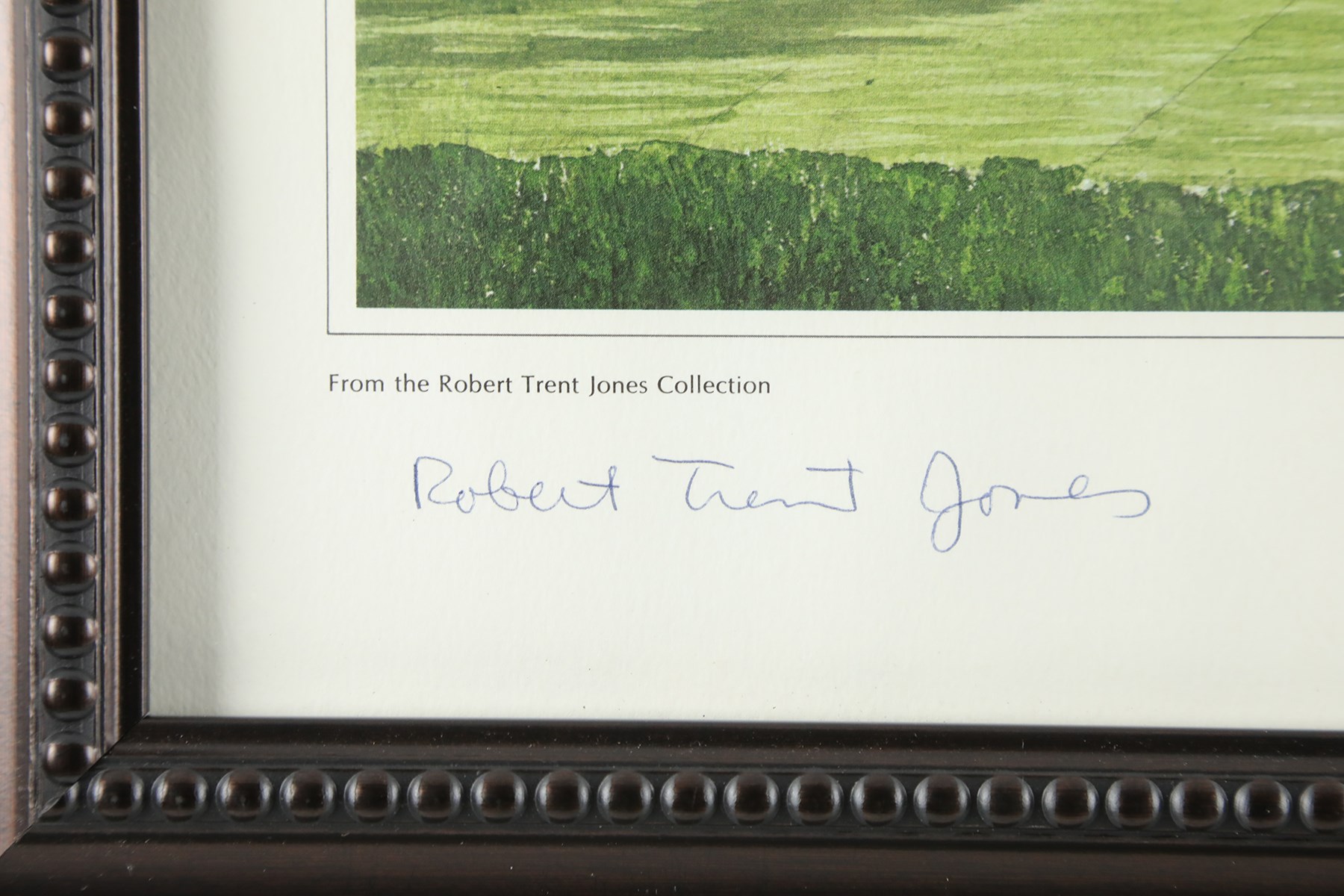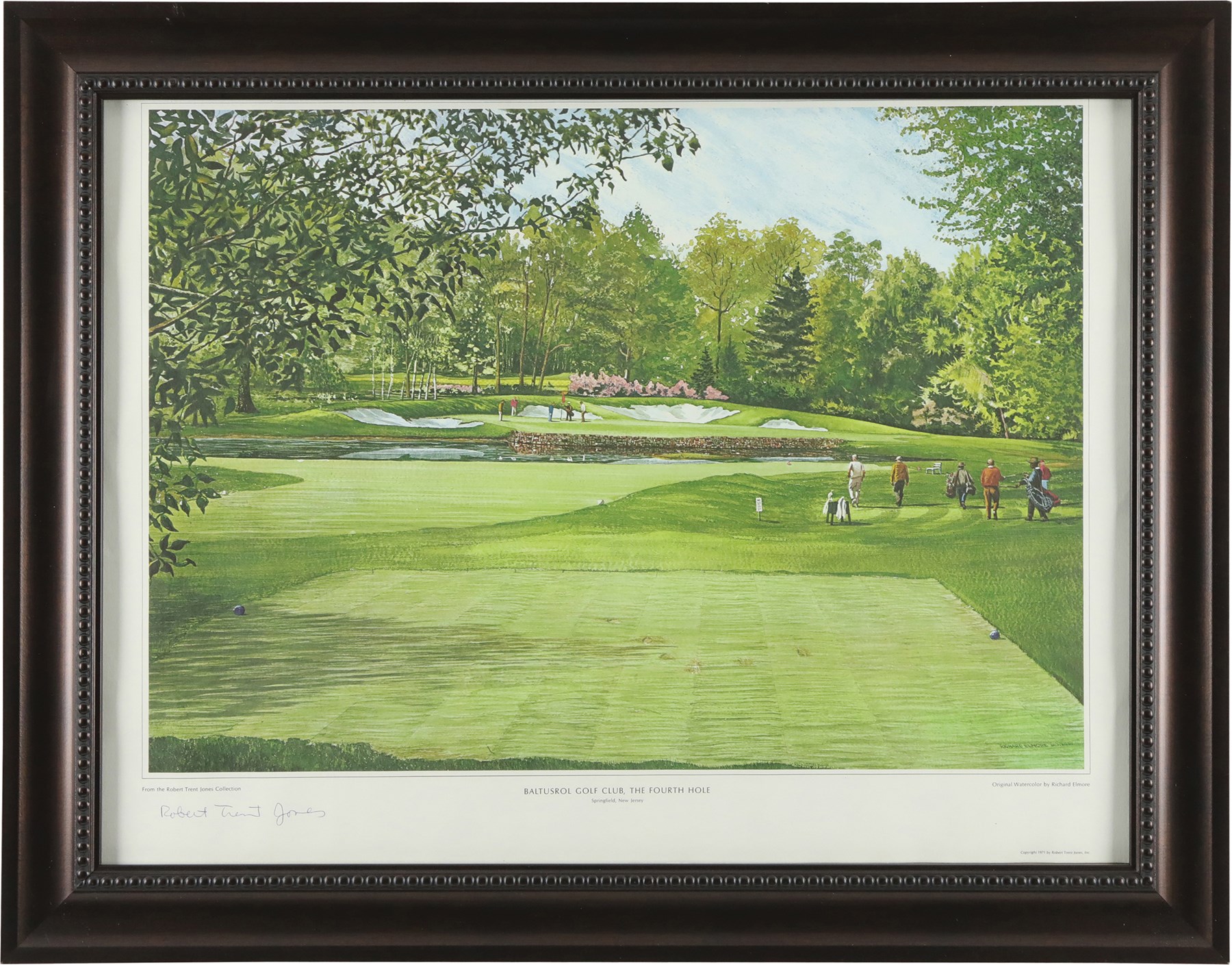 A framed lithograph of the fourth hole at Baltusrol signed by iconic golf course architect Robert Trent Jones. The piece is 18x24" and is enclosed in a 22x28" frame. The image was originally painted in watercolor by Richard Elmore and Jones has signed the piece in the lower left-hand corner in blue ink. The lot will include a certificate of authenticity from PSA/DNA verifying the signature. Baltusrol, in Springfield, New Jersey, was originally founded in 1895 in Springfield, New Jersey. Jones was hired to lengthen the course for tournament play in 1948. Jones, an iconic figure in the golf world, passed away in 2000 at the age of 93.