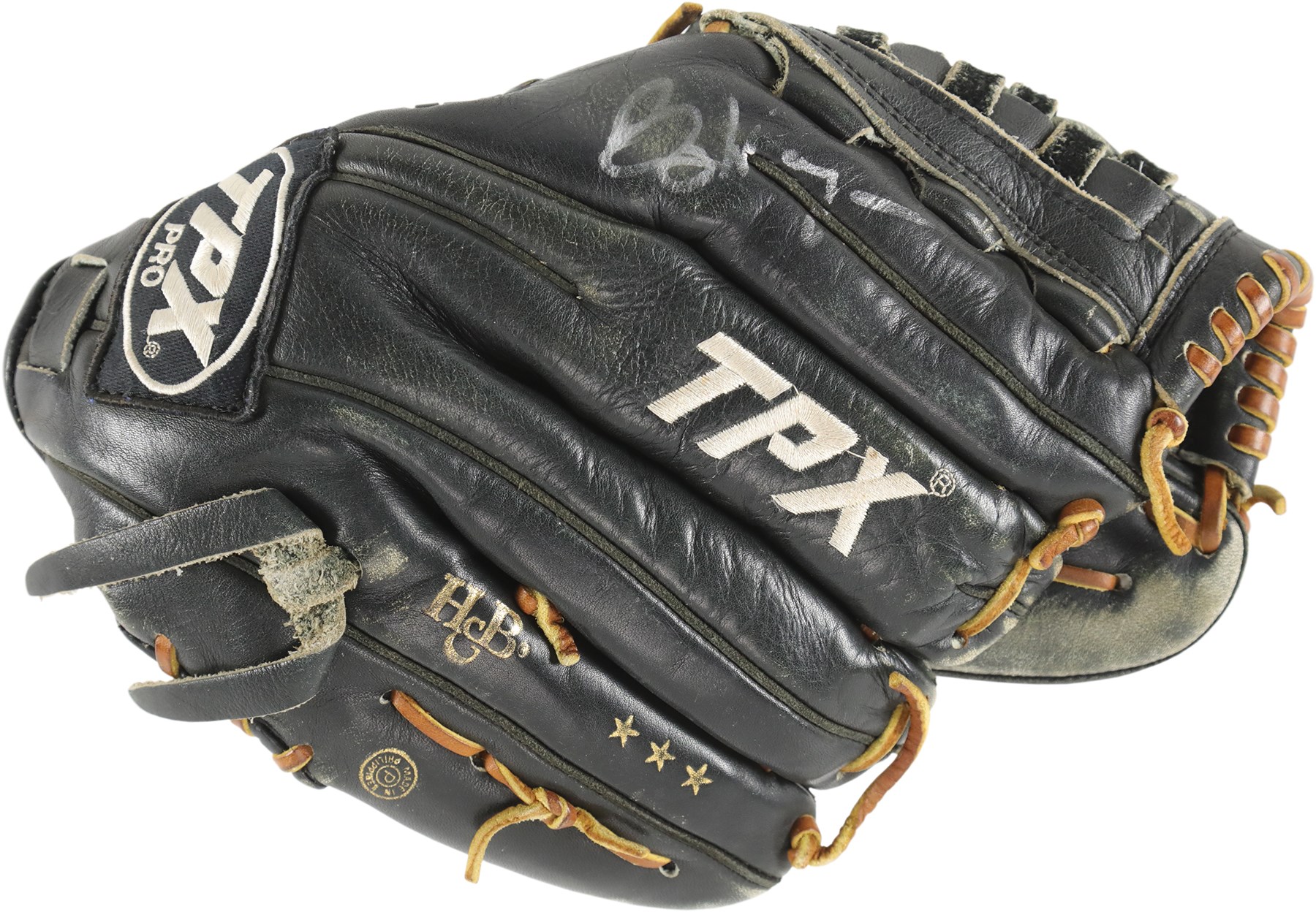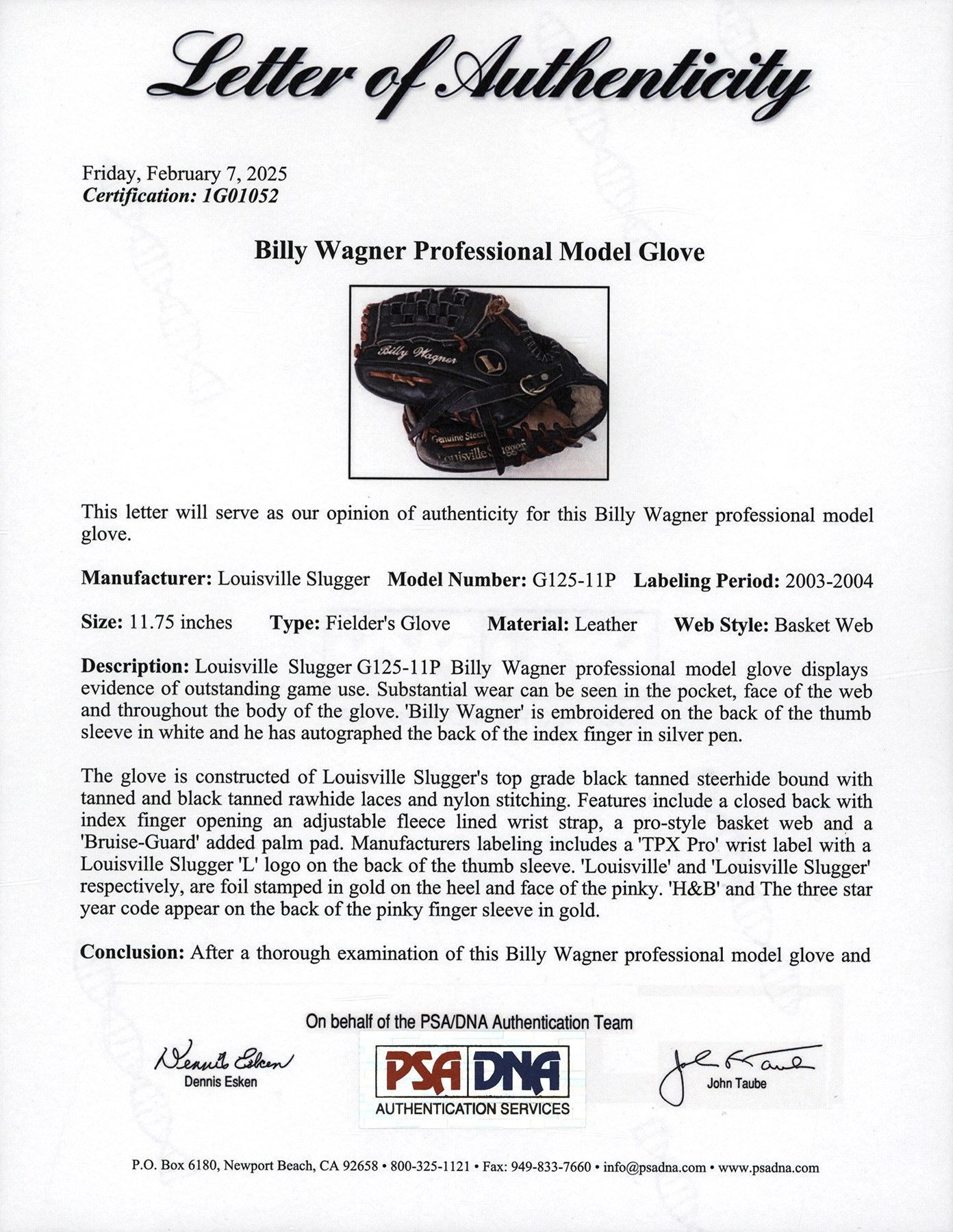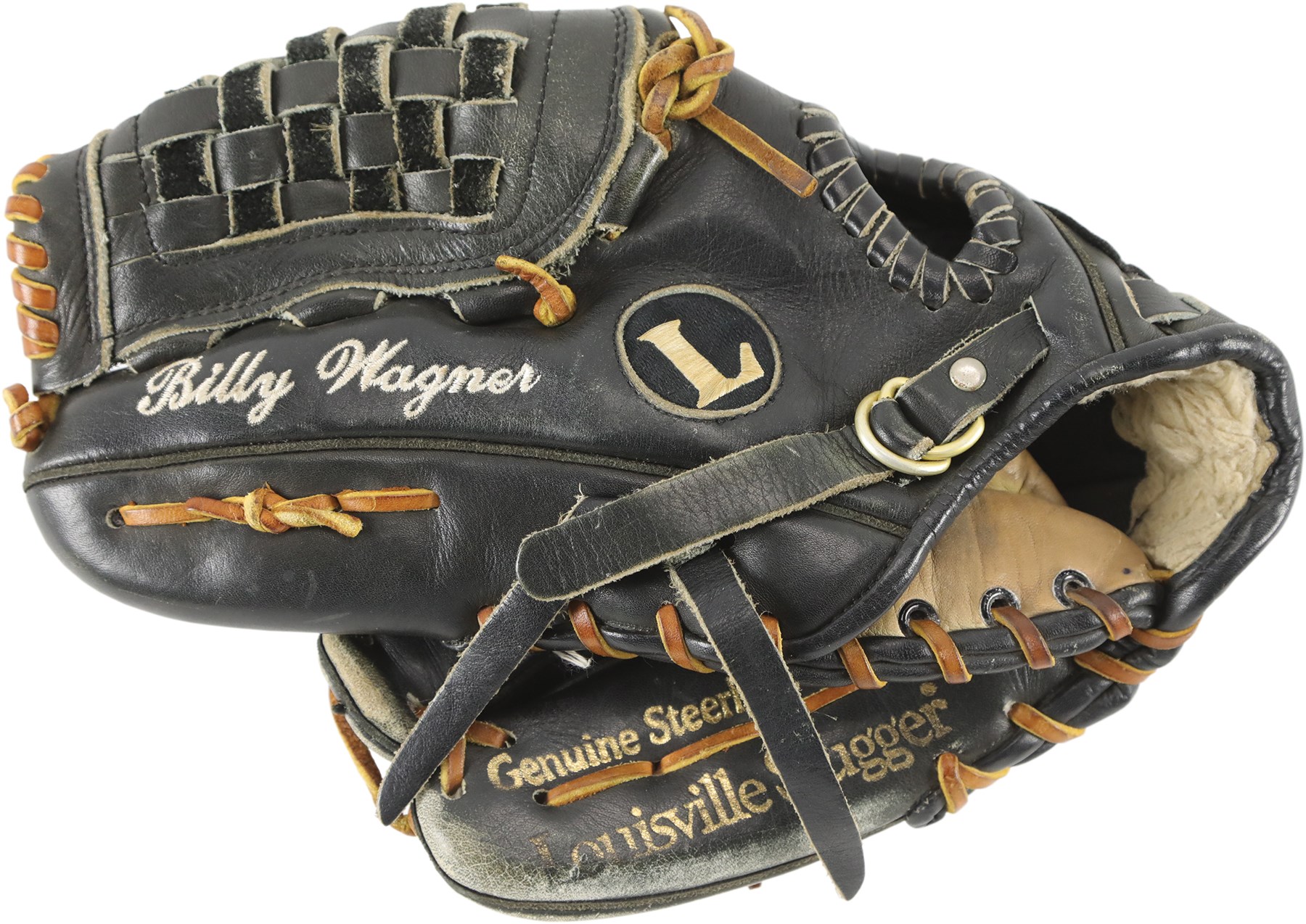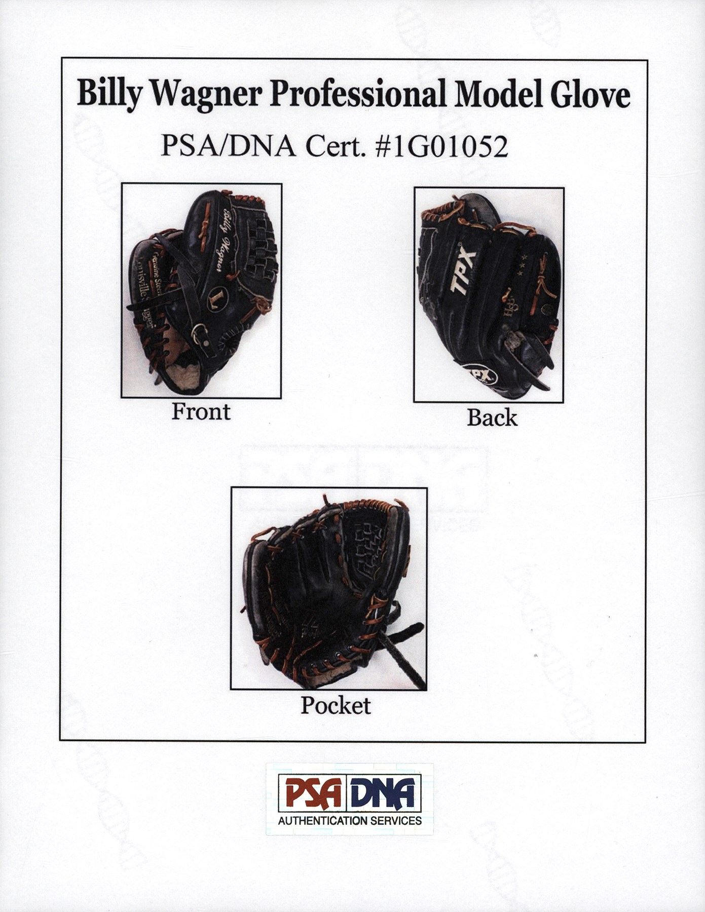 The offered glove (worn on the right hand) is in black leather, constructed of Louisville Slugger's top grade steerhide, and bound with tanned and black tanned rawhide laces. Although nice wear has made it faint, the model number: "G125-11P" is stamped on the inner pinky sleeve. The glove has a closed back, an adjustable, fleece lined wrist strap, a "Bruise-Guard added palm pad, and a pro-style basket web. The manufacturer's labeling includes: A "TPX Pro" wrist label and a Louisville Slugger "L" logo on back of the thumb sleeve, and "TPX" appears on back of the third finger sleeve. "Louisville" and "Louisville Slugger" are respectively foil stamped in gold on the heel and face of the pinky. On the back of the pinky sleeve appear "H&B" and the Three Star year code. The size is 11.75". Wagner, using a silver pen, signed a big and bold signature on the back of the index finger sleeve, a spot with a ton of wear. "Billy Wagner" is embroidered on the back of the thumb sleeve in white. The glove exhibits outstanding use, with substantial wear shown. The glove comes with a PSA/DNA LOA (Certification: 1G01052). The PSA/DNA LOA states that the glove was used during 2003-04.