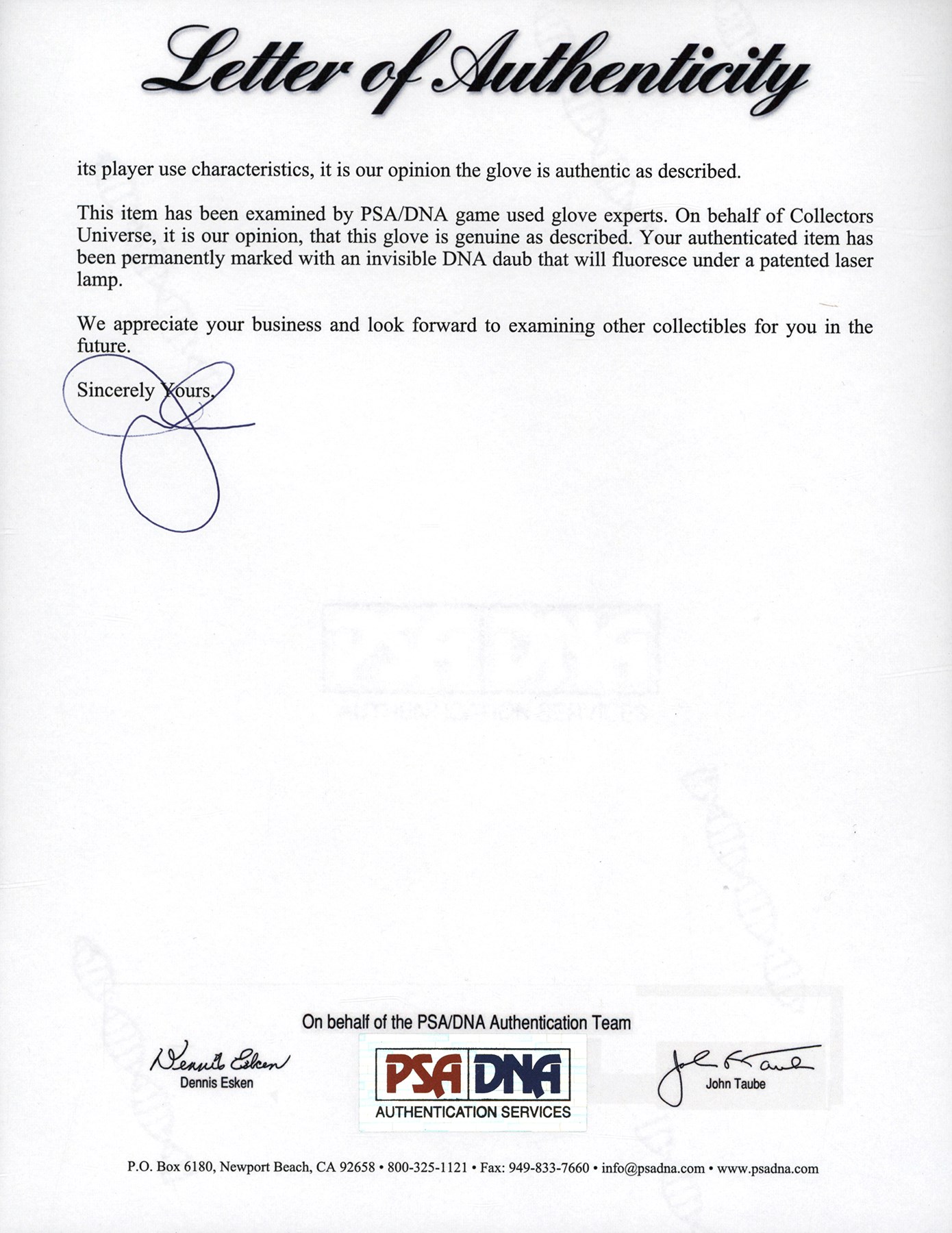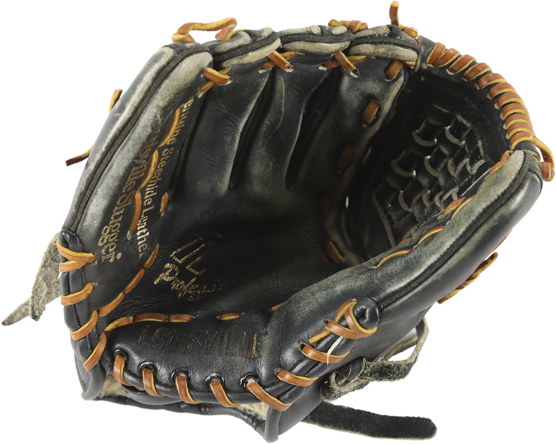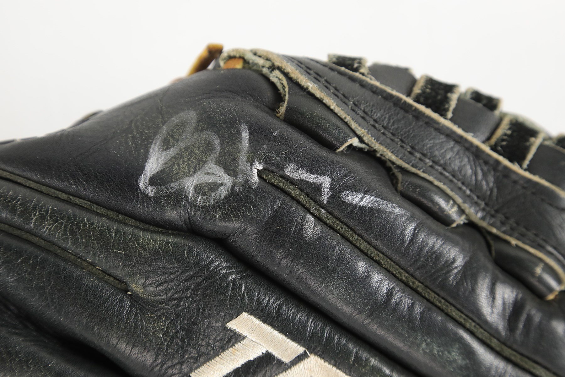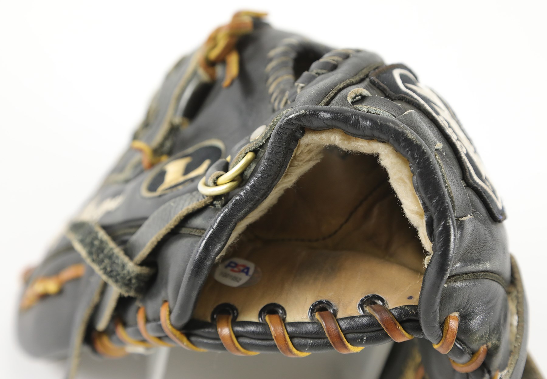 The offered glove (worn on the right hand) is in black leather, constructed of Louisville Slugger's top grade steerhide, and bound with tanned and black tanned rawhide laces. Although nice wear has made it faint, the model number: "G125-11P" is stamped on the inner pinky sleeve. The glove has a closed back, an adjustable, fleece lined wrist strap, a "Bruise-Guard added palm pad, and a pro-style basket web. The manufacturer's labeling includes: A "TPX Pro" wrist label and a Louisville Slugger "L" logo on back of the thumb sleeve, and "TPX" appears on back of the third finger sleeve. "Louisville" and "Louisville Slugger" are respectively foil stamped in gold on the heel and face of the pinky. On the back of the pinky sleeve appear "H&B" and the Three Star year code. The size is 11.75". Wagner, using a silver pen, signed a big and bold signature on the back of the index finger sleeve, a spot with a ton of wear. "Billy Wagner" is embroidered on the back of the thumb sleeve in white. The glove exhibits outstanding use, with substantial wear shown. The glove comes with a PSA/DNA LOA (Certification: 1G01052). The PSA/DNA LOA states that the glove was used during 2003-04.