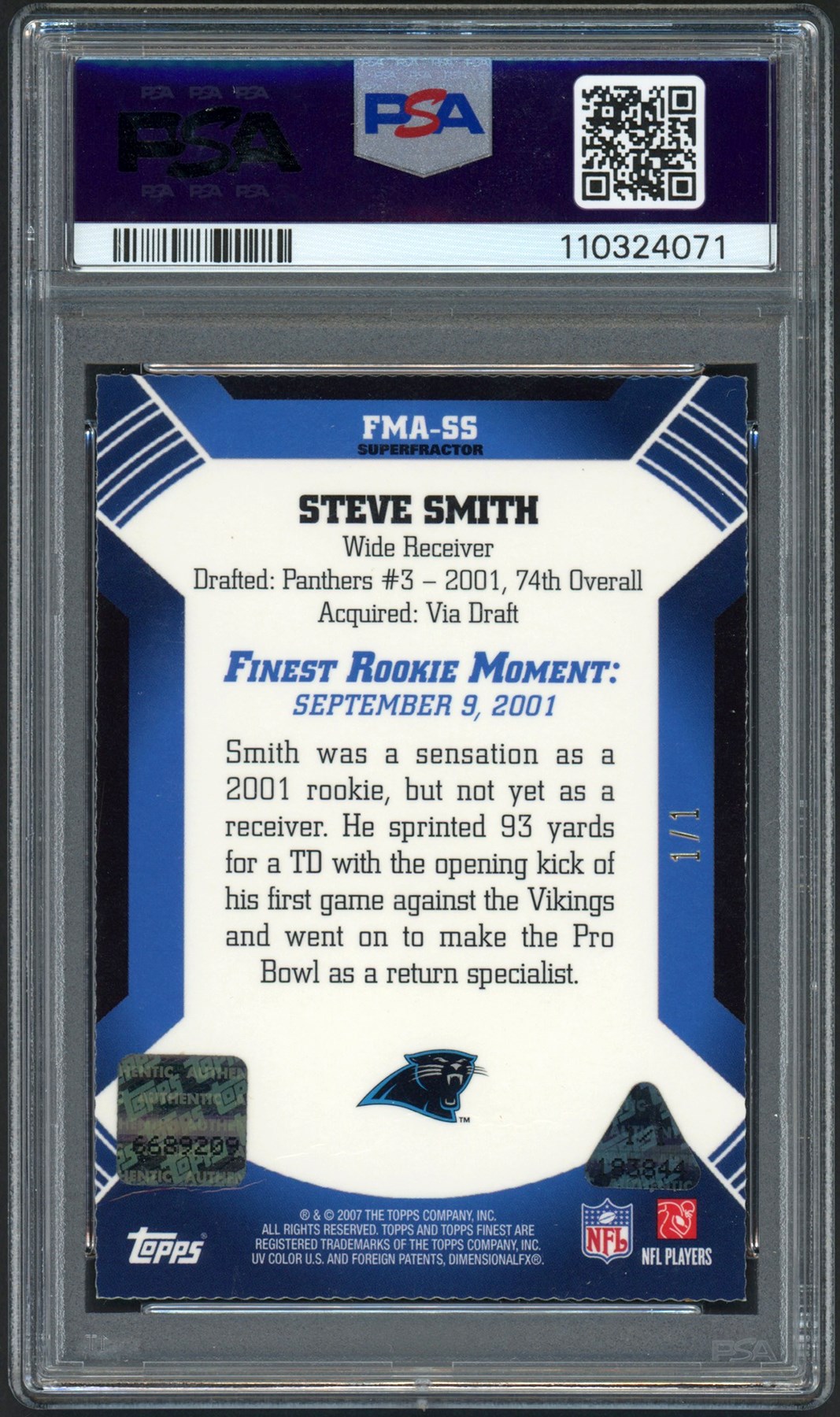 This lot features a 2007 Topps Finest Moments #FMASS Steve Smith Autograph Superfractor #1/1. This card has been graded and encapsulated by PSA GD 2. The autograph has been authenticated and graded by PSA AUTO 10. There is a large crease that goes through the back of the card which is the contributor to the PSA GD 2 grade. The Superfractor is the rarest parallel from Topps as they are serial numbered 1 of 1 (one of a kind) and feature the gold vinyl parallel look to the card. These cards are extremely sought after by collectors and are becoming more popular by the day. These Superfractors do not come around often so now is a chance to get your hands on a Superfractor card before it is tucked away in a collection for years to come.