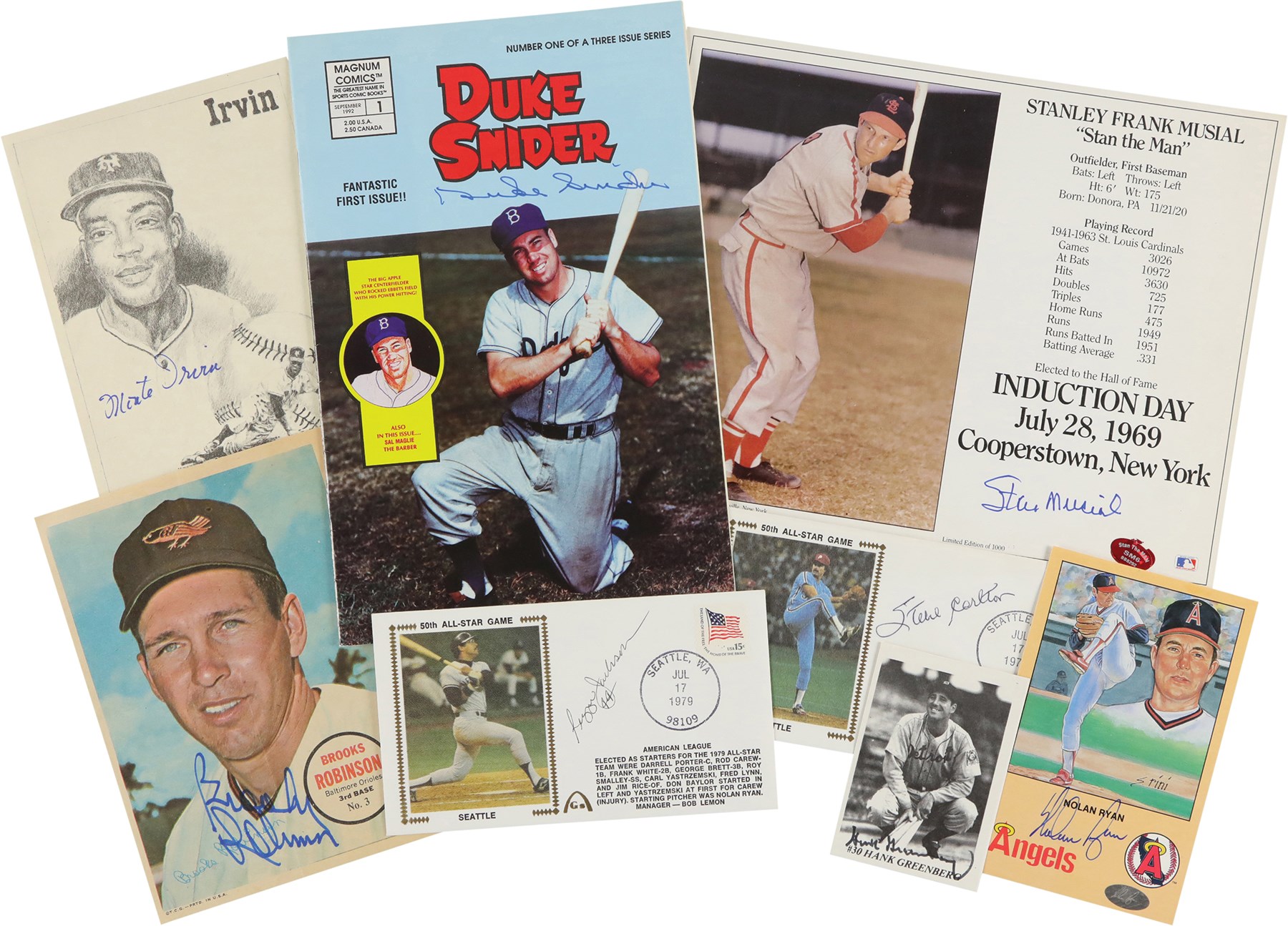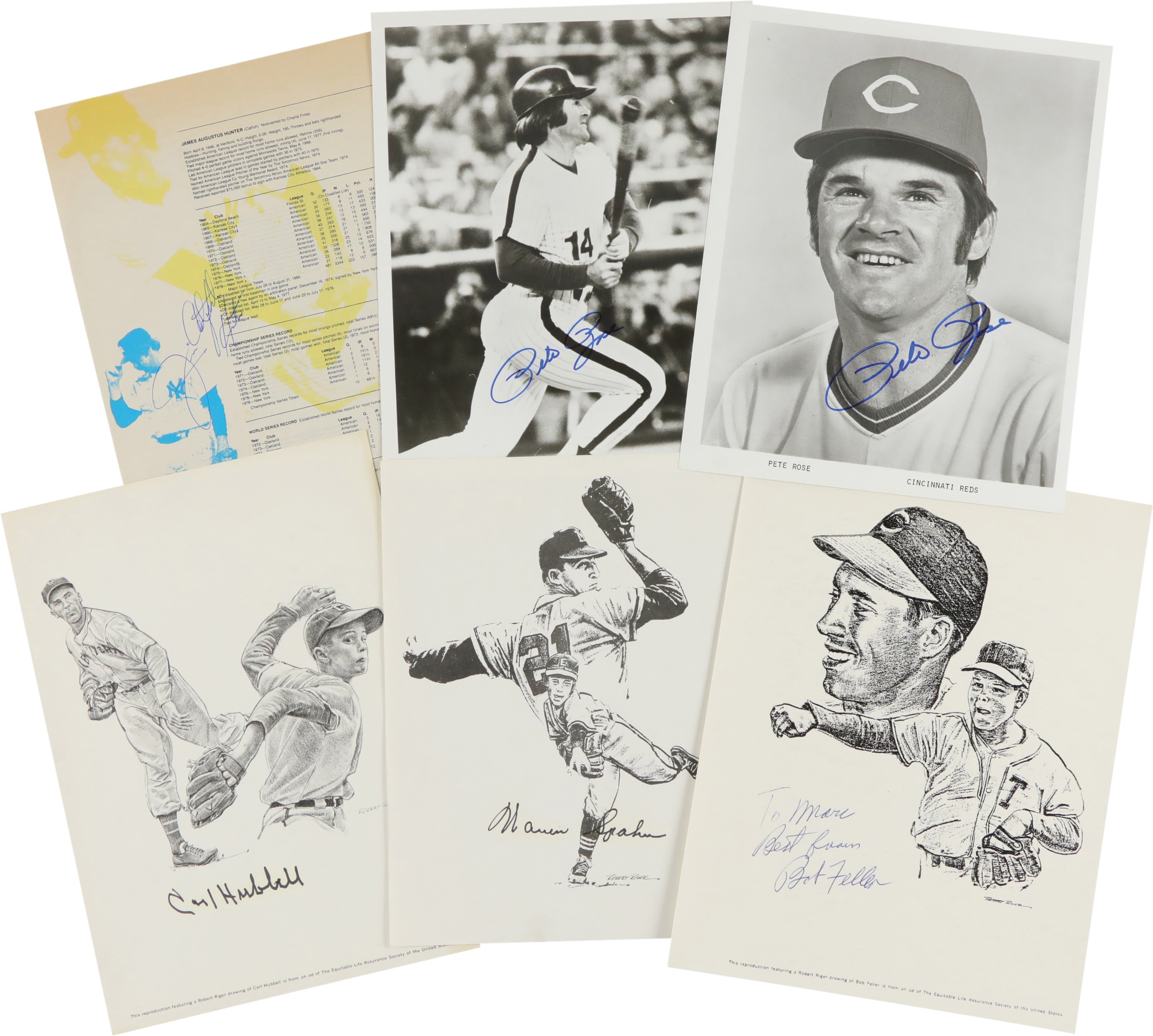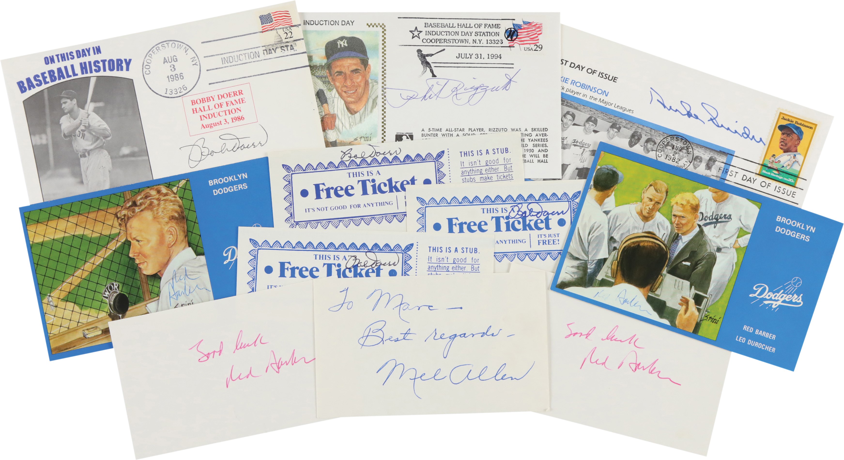 Large collection of fifty-one assorted items signed by one or more Hall of Fame players, plus a few signed by Pete Rose and several announcers who have received the Ford C. Frick Award from the Baseball Hall of Fame. The signatures, scripted in various inks, average 9/10. Excellent condition overall. Given the number of signatures in this lot, one most allow for the possibility of a few secretarial examples. In our listing, the number of items for each player, if more than one, is noted in parentheses.