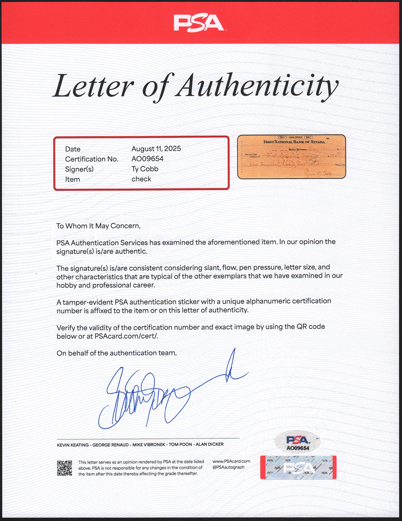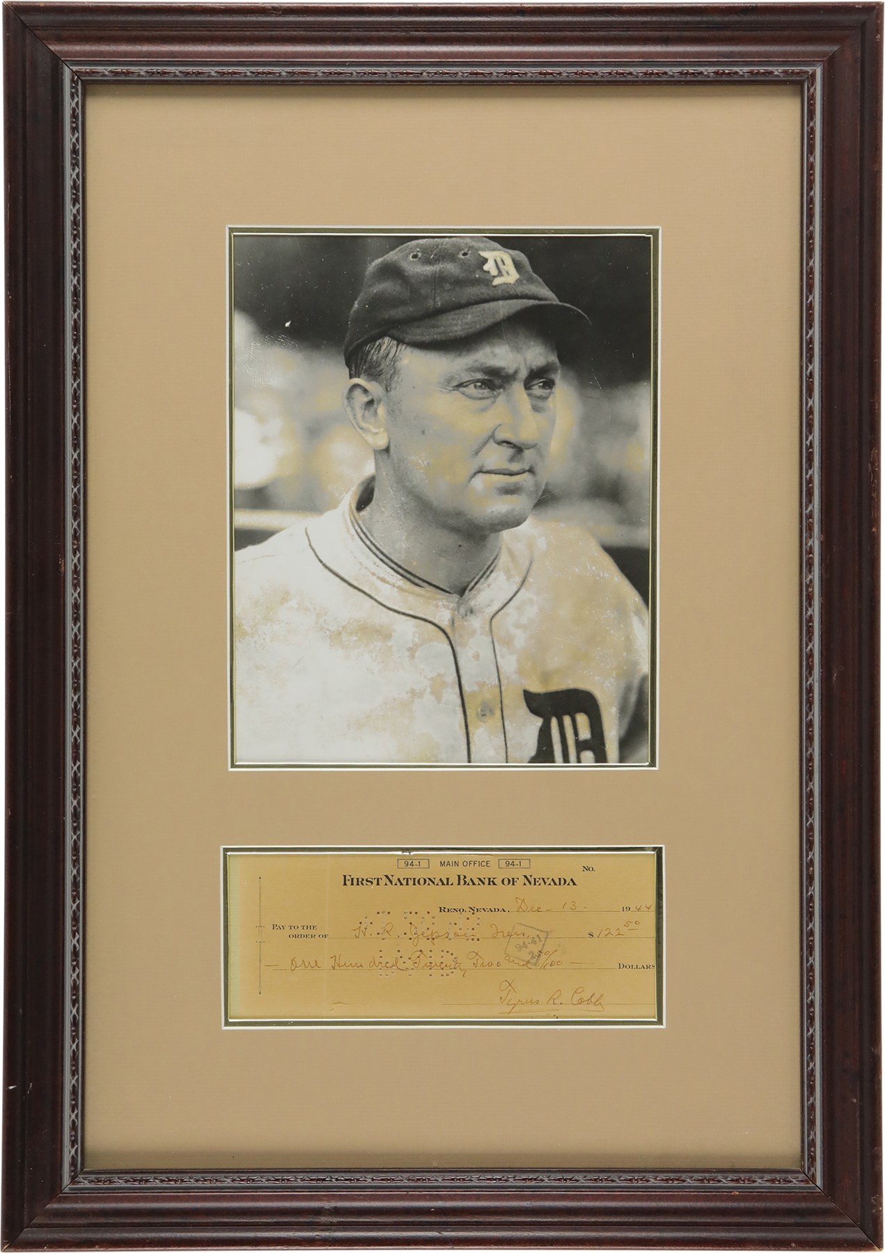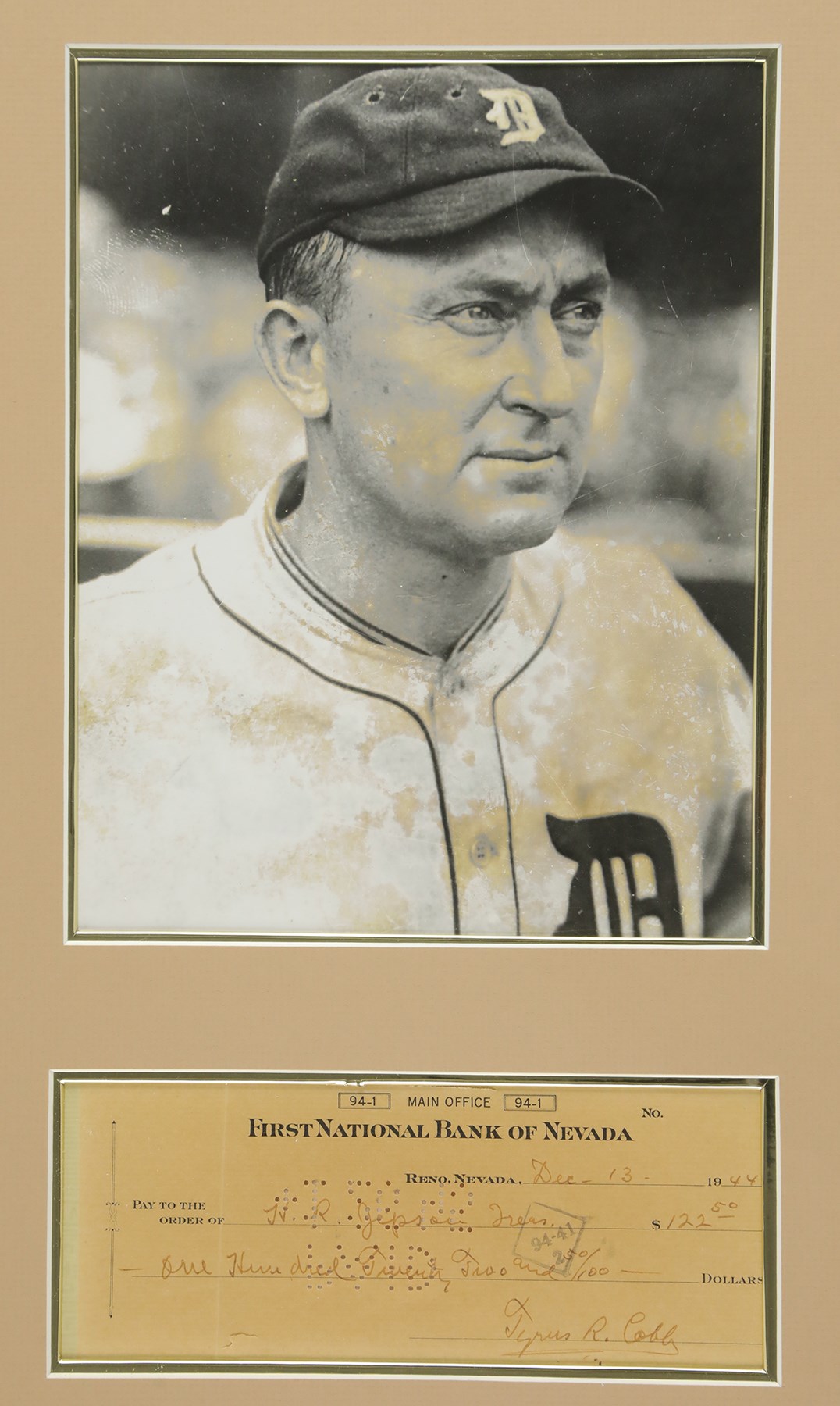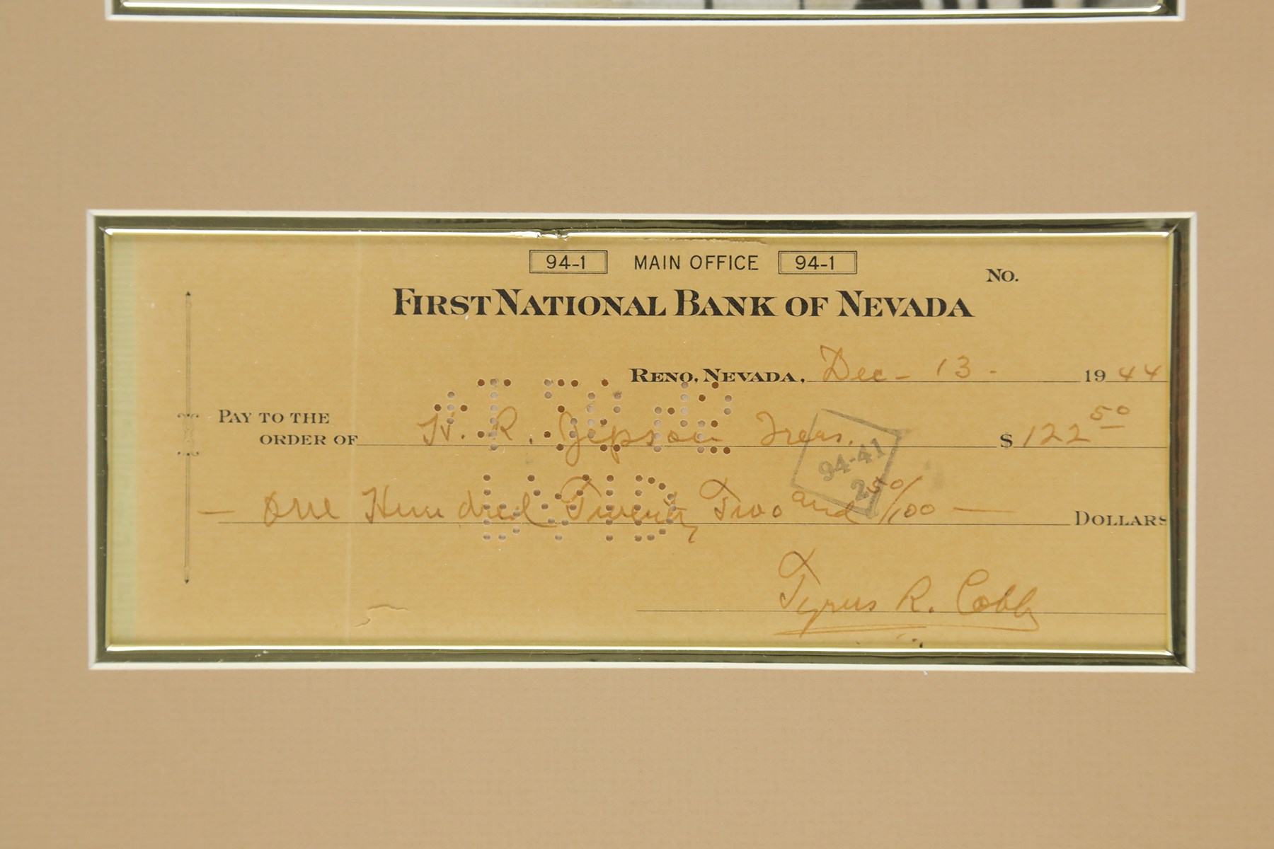 Bank check, dated December 13, 1944, signed by Ty Cobb. The check, drawn on the First National Bank of Nevada, is made out to "H. R. Jepson Treas." in the amount of $122.50. Signed "Tyrus R. Cobb" in black fountain pen (grading 7/10) at the base. The check (7.5x3"; visible dimensions), which has normal bank cancellation stamps and holes, is toned and displays a vertical fold and a tiny tear near the lower left border. Matted and framed together with a photo of Cobb (7.5x9.5"; visible dimensions; modern print) to total dimensions of 16x22.5". Please Note: The size and/or weight of this lot will necessitate an increased shipping charge.