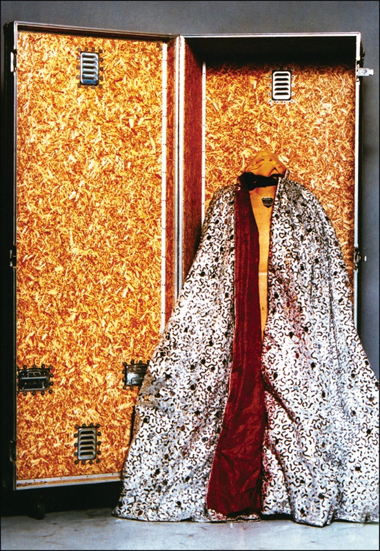 Custom black flight case opens up to reveal an elaborate stage costume cape designed for rock and roll god, Gene Simmons. This elaborate and dazzling full-length cape is adorned with various shiny ornaments and battery-powered lights and is custom padded. This silver and red lame prototype cape never made it to the stage, but you can just imagine Gene strutting his stuff in this breathtaking and daring costume. In top display condition. Some fraying to the trim, EX-MT. The black flight case with KISS logo painted on the front measures 83x31x31". EX.