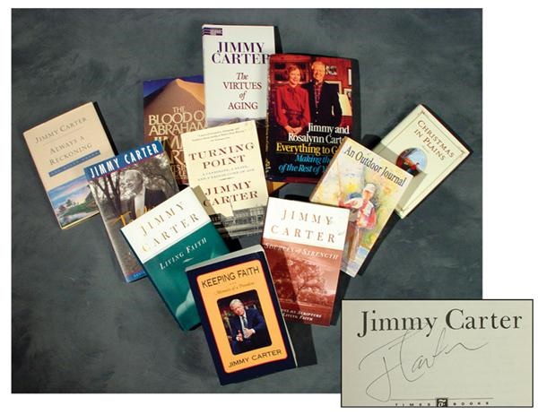 Group of 12 books written by our 39th President, Jimmy Carter. Collection includes Living Faith, Sources of Strength, Keeping Faith, Talking Peace, An Outdoor Journal, & The Blood of Abraham. Each one with perfect black ink signature on the title page. Both paper back and hardcover.