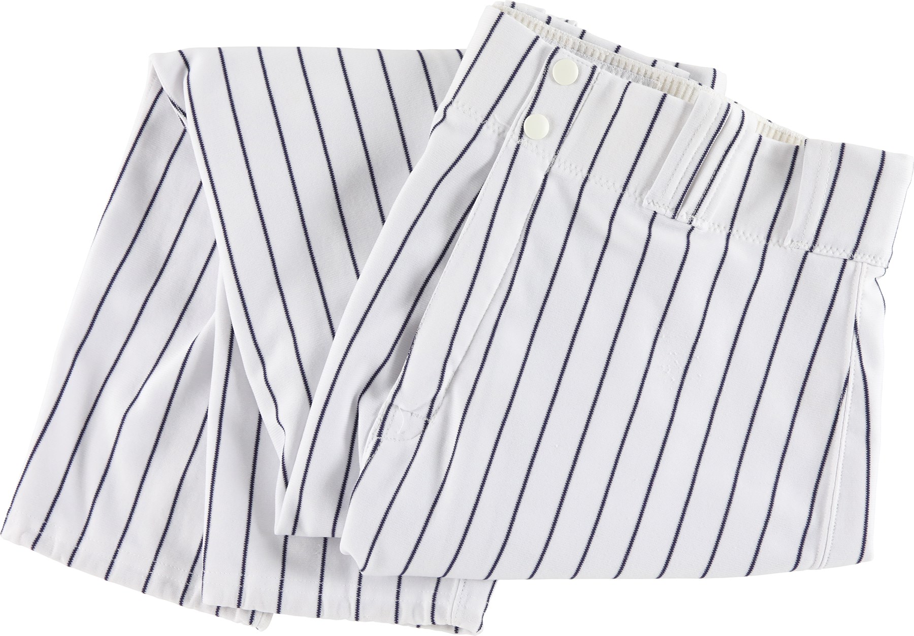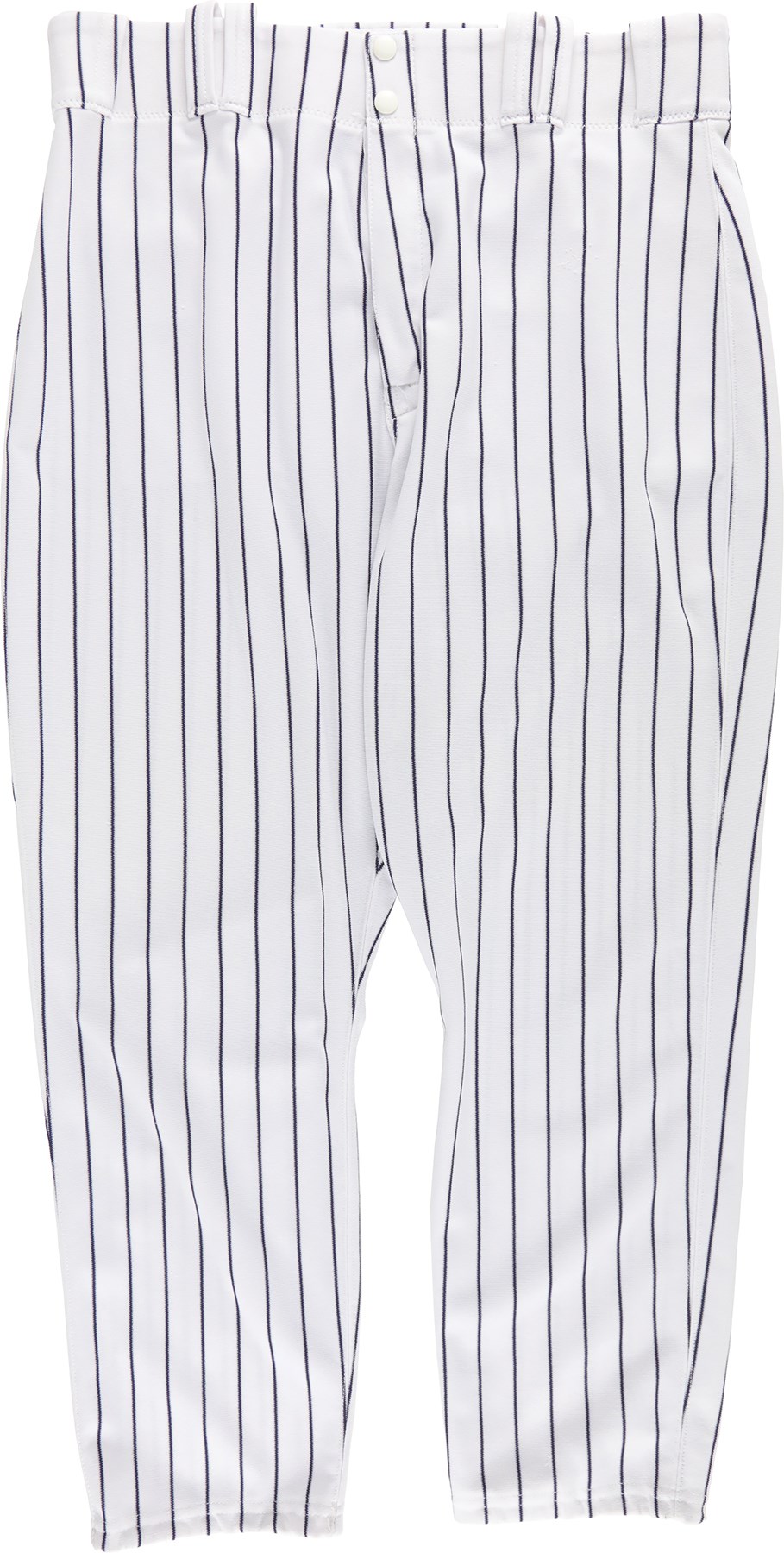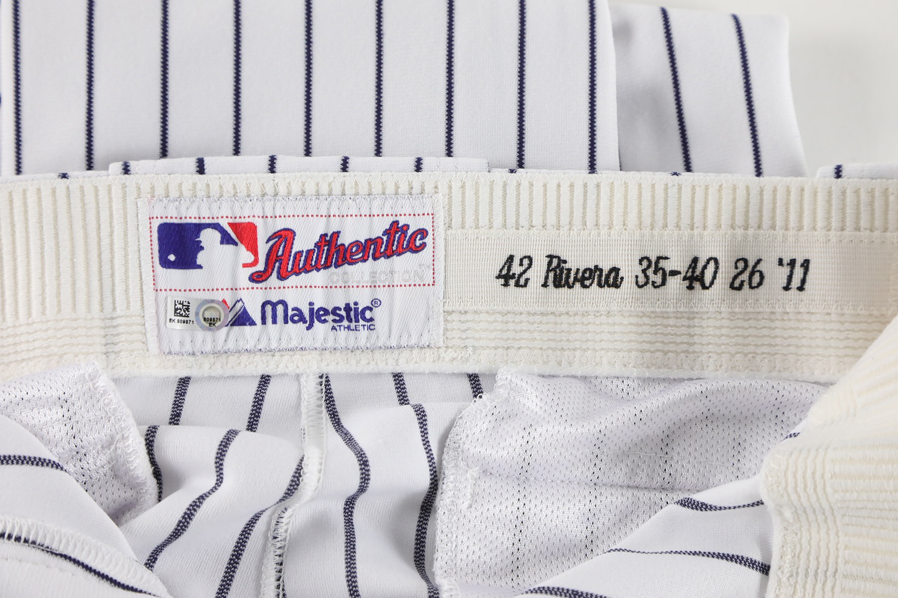 A pair of New York Yankees game-issued pants assigned to legendary New York Yankees closer Mariano Rivera. The interior tag on the white pinstriped pants shows that the pants were made by Majestic and were issued in 2011 as there is an additional tag that reads, "42 Rivera, 35-40 26 '11." There is also a hologram from MLB authenticating that these were game issued to the player. Rivera spent his entire 19-year career with the Yankees making 13 All-Star teams and winning 5 World Series titles. He was unanimously inducted into the Major League Baseball Hall of Fame in 2019.