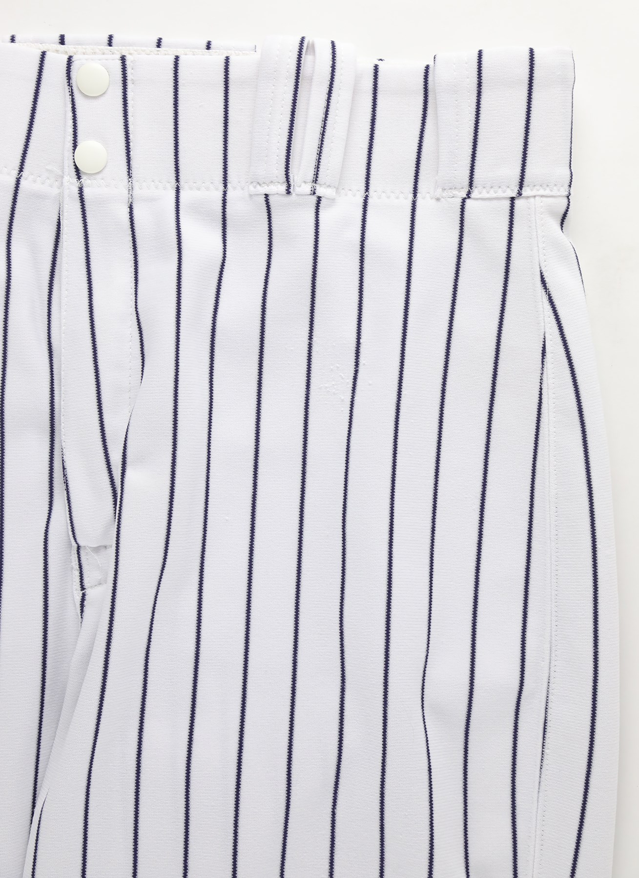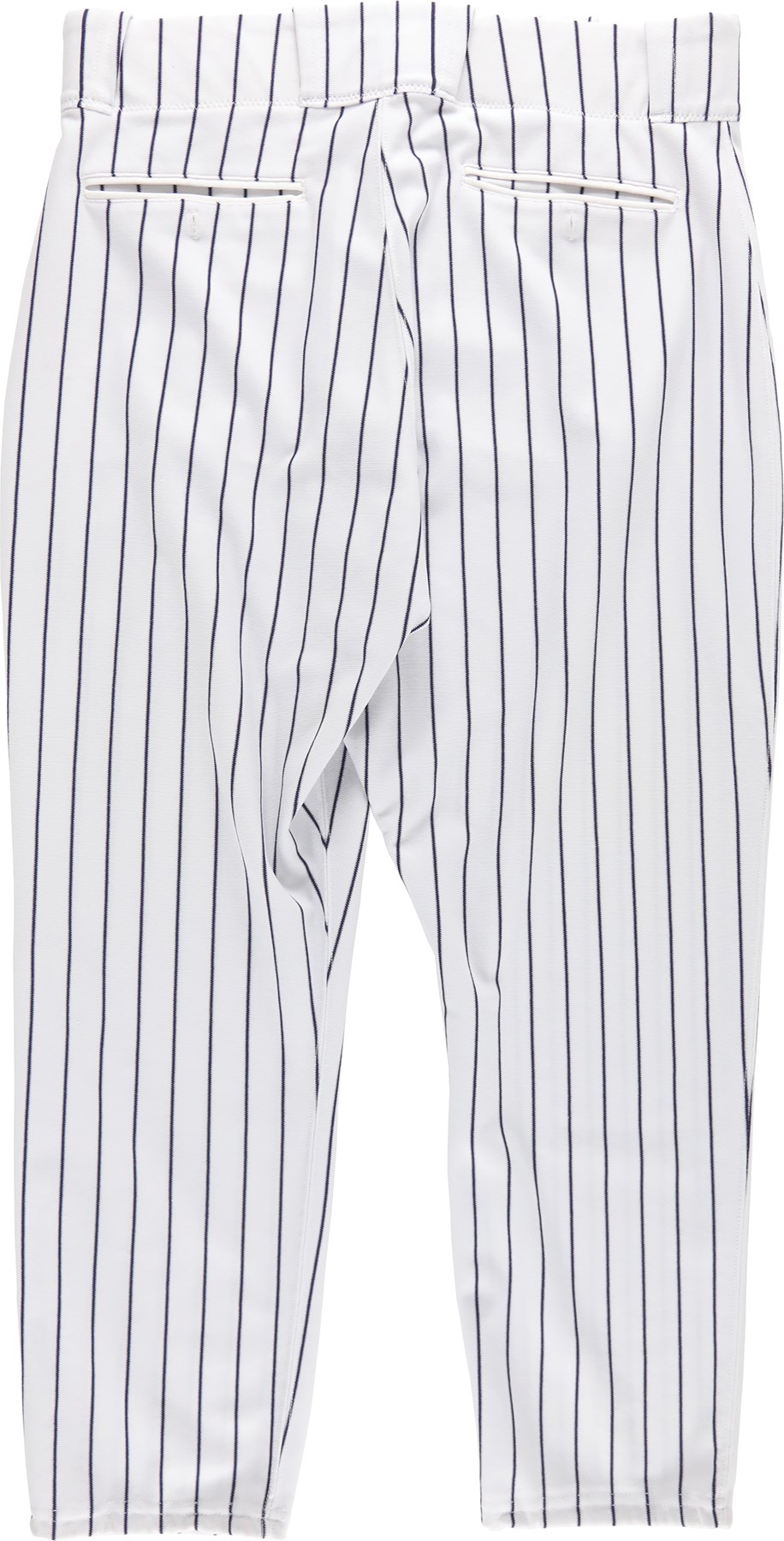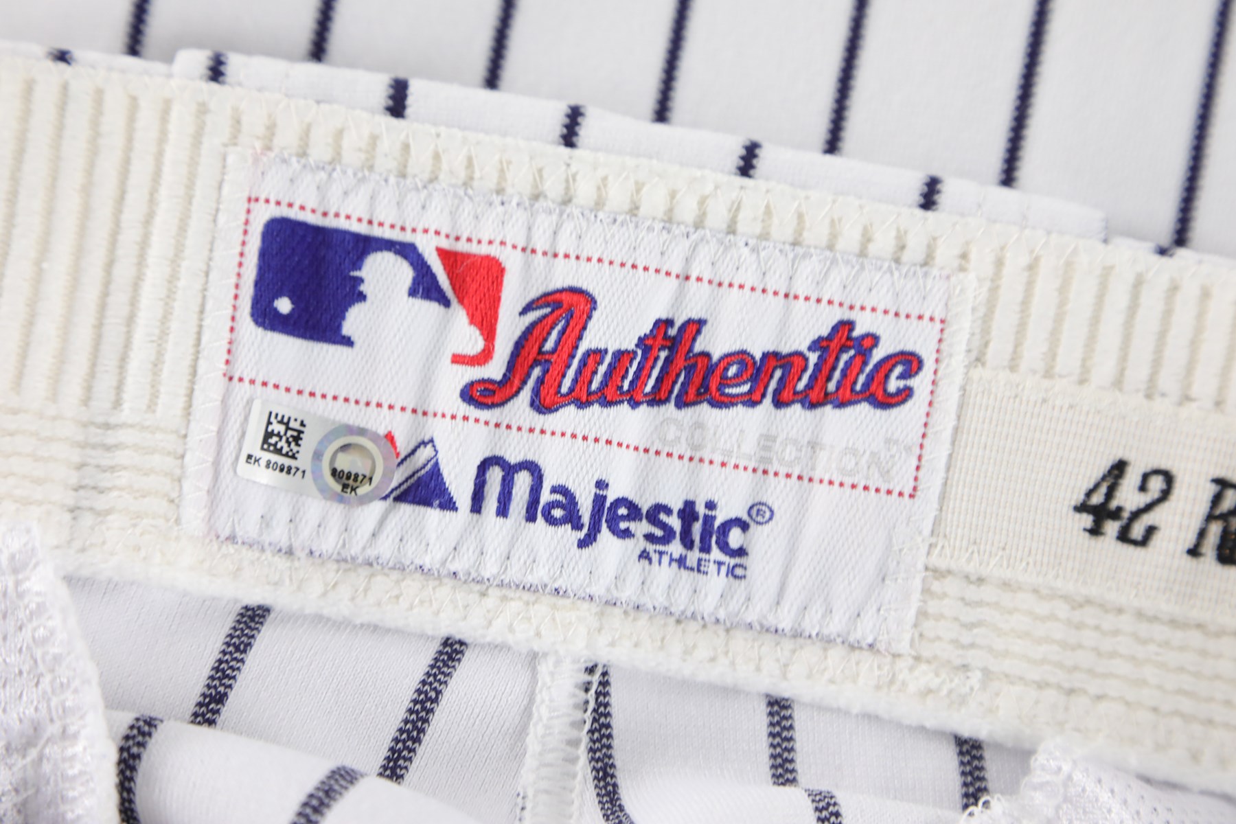 A pair of New York Yankees game-issued pants assigned to legendary New York Yankees closer Mariano Rivera. The interior tag on the white pinstriped pants shows that the pants were made by Majestic and were issued in 2011 as there is an additional tag that reads, "42 Rivera, 35-40 26 '11." There is also a hologram from MLB authenticating that these were game issued to the player. Rivera spent his entire 19-year career with the Yankees making 13 All-Star teams and winning 5 World Series titles. He was unanimously inducted into the Major League Baseball Hall of Fame in 2019.