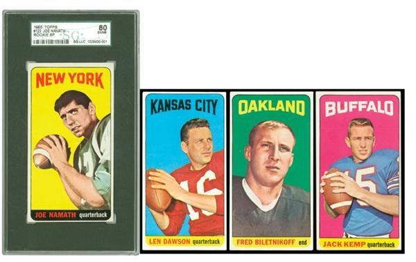 Topps second offering featuring AFL players only is the best set of the 1960’s. The set is somewhat challenging to complete as it contains a number of short-prints. Set is complete at 176 cards. It features Joe Namath’s rookie card professionally graded an SGC 80 (EX-MT). A few years later Broadway Joe would be immortalized forever in Super Bowl III. Set averages a solid EX-MT. Kemp (EX), W. Brown rookie (EX-MT), Blanda (EX-MT, oc), Checklist #87 (EX), L. Dawson (EX-MT), Maynard (EX-MT), Biletnikoff rookie (EX-MT), Alworth (NRMT, oc), and Checklist #176 (VG-EX).