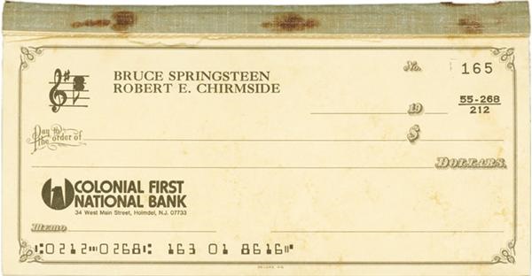 Checkbook from the 1970’s contains 10 unused checks in the name of “Bruce Springsteen & Robert E. Chirmside” for the Colonial First National Bank in Holmdel, NJ. On the album “Darkness on the Edge of Town” there is a “Thanks to Bob Chirmside” in the credits. Tiny rust stains on the border from the staples. Checks are EX to EX+.
